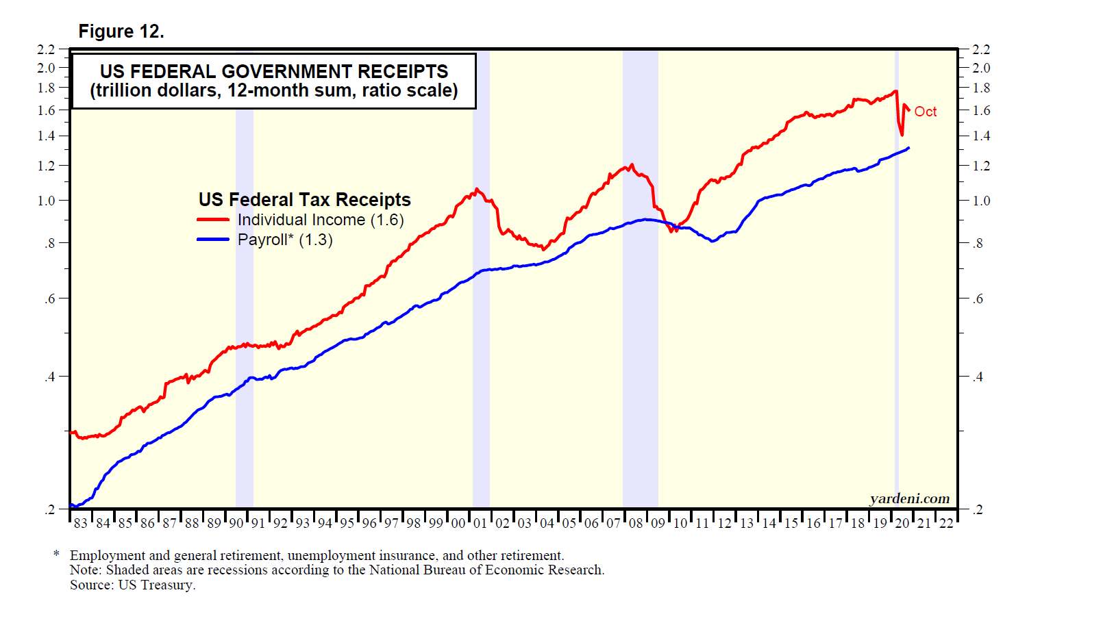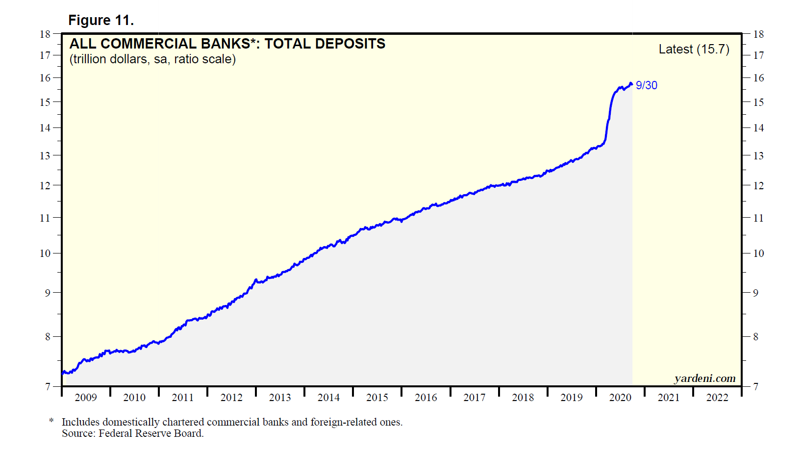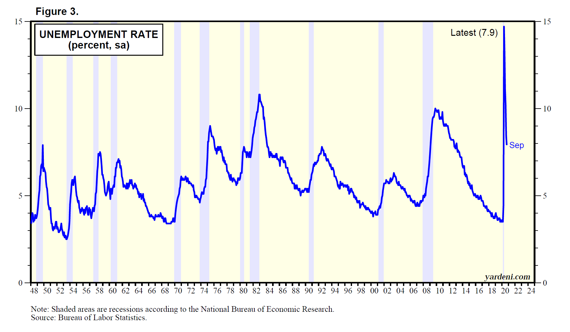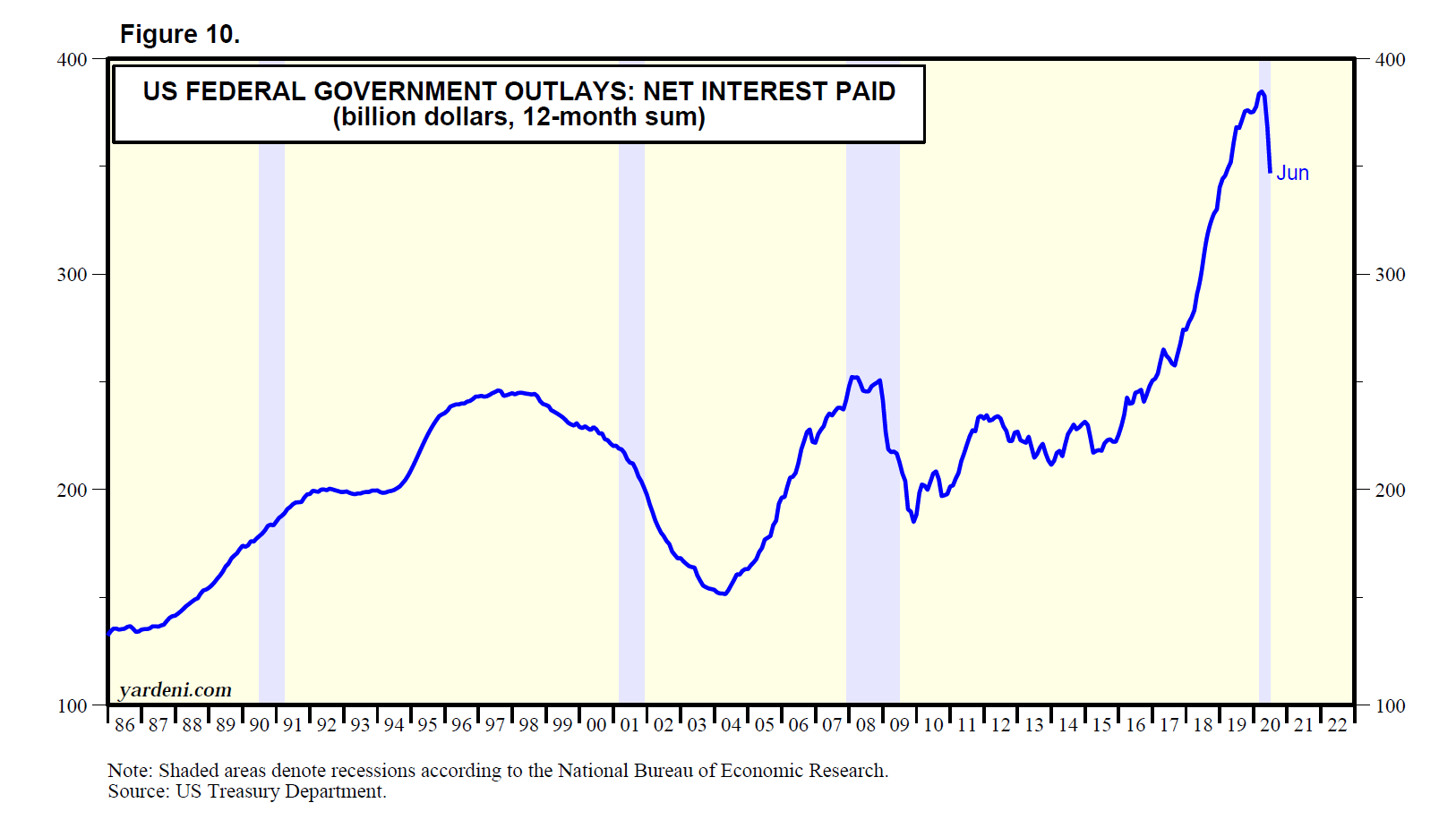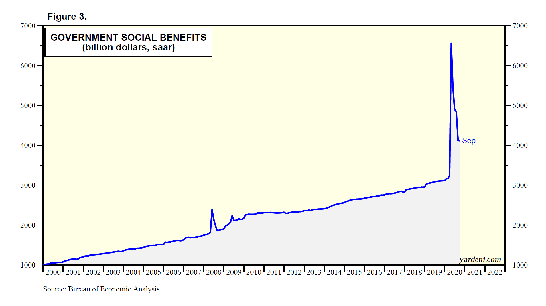 The bottom line is that during Q3 profits have recovered remarkably well from the lockdown recession during the first half of this year. On the other hand, corporate balance sheets are loaded up with more debt than ever. However, much of it has been refinanced at record-low interest rates. It’s all bullish for the economy and the stock market as long as interest rates stay low.