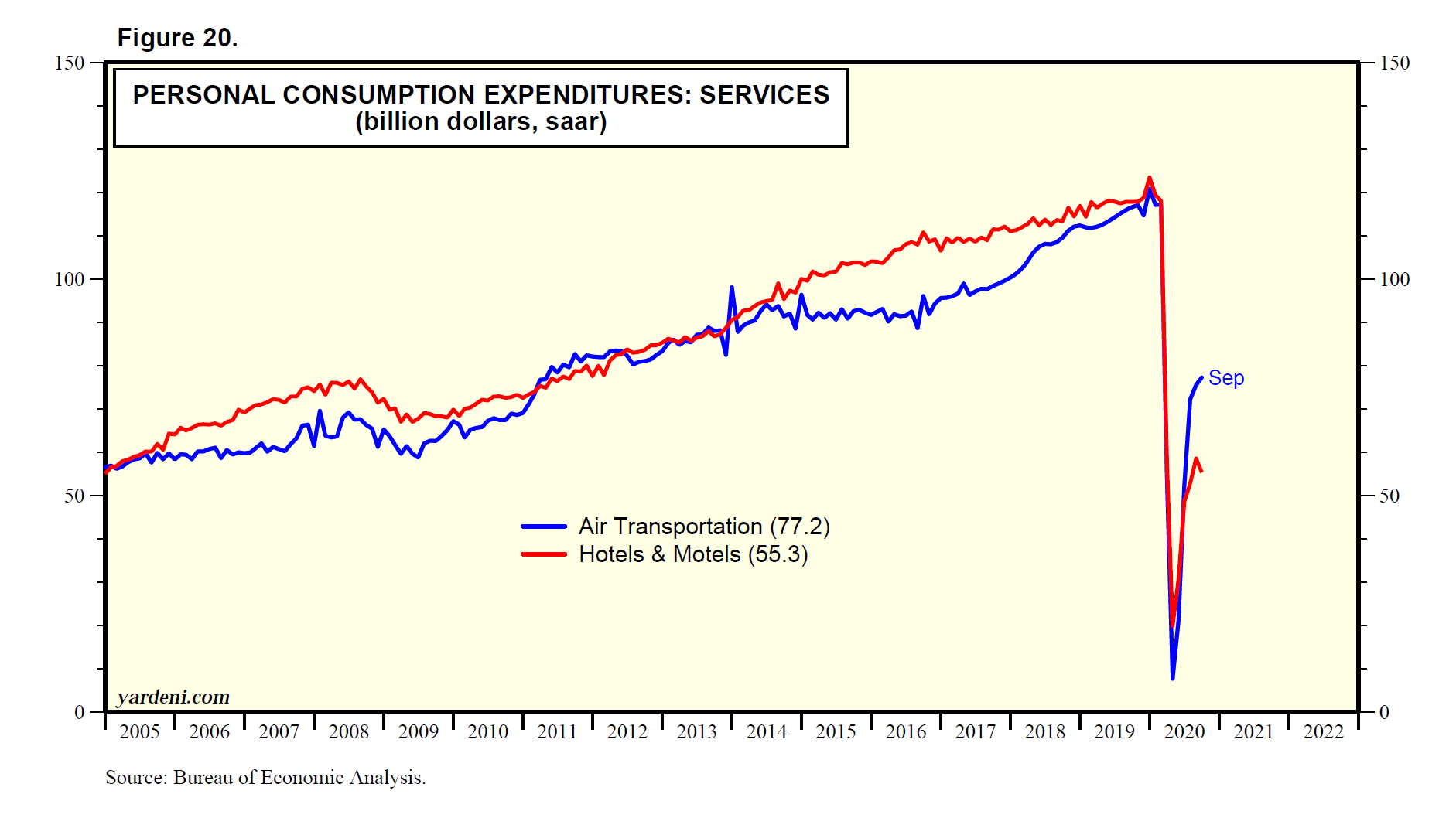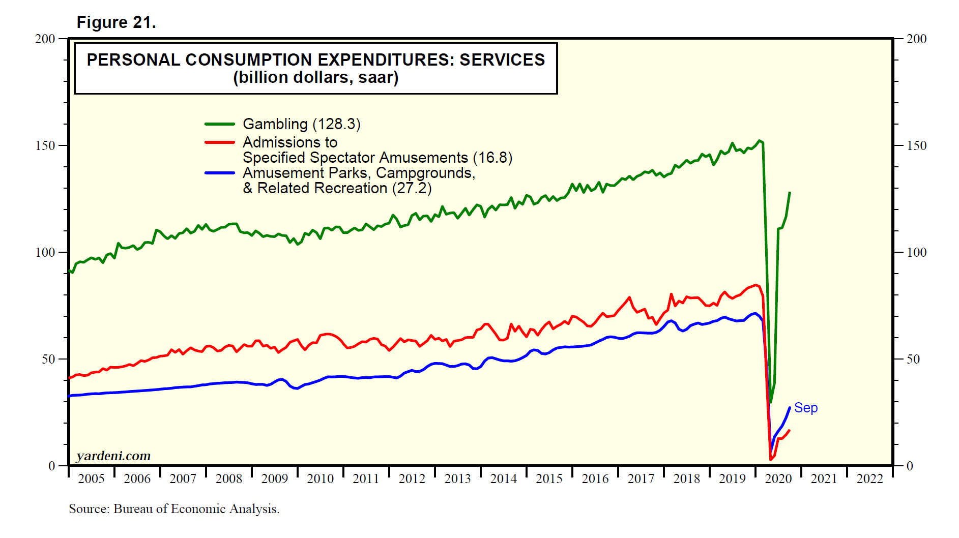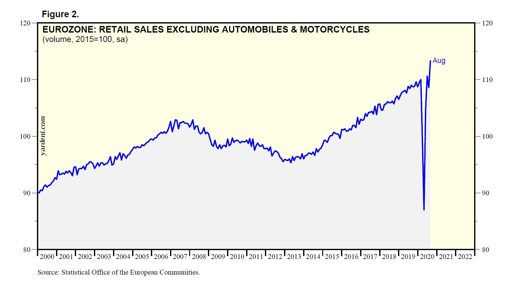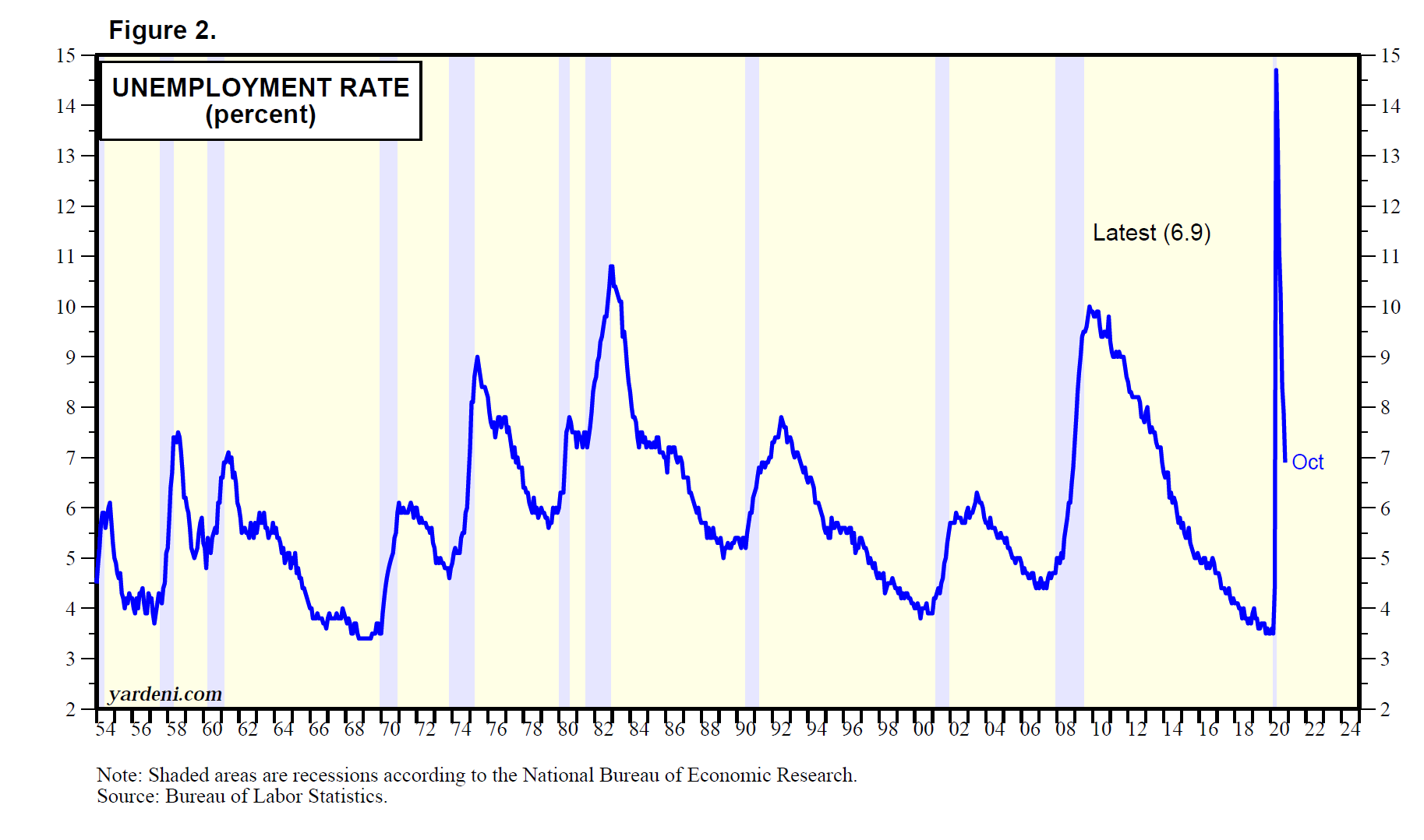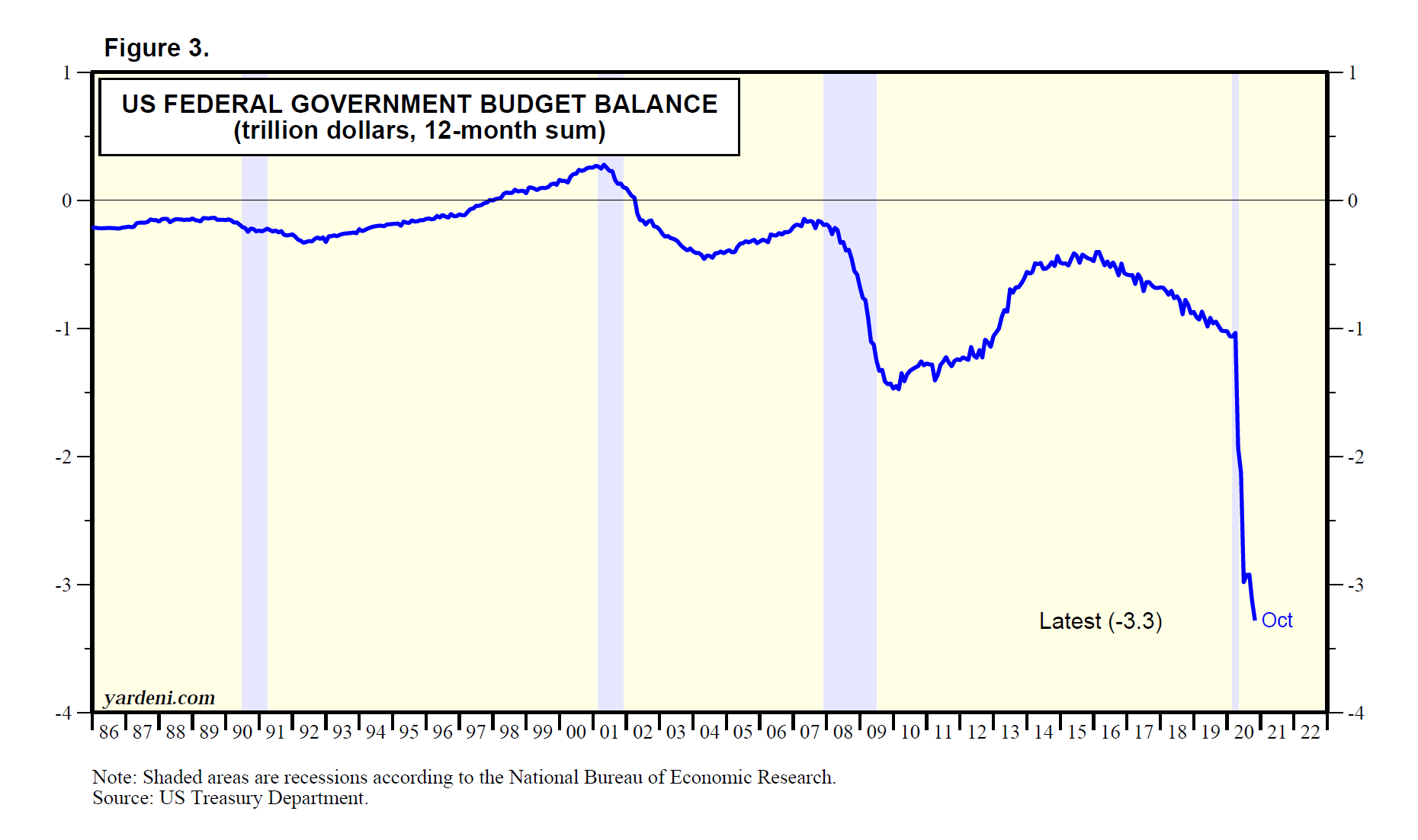 The bottom line is that during Q3 profits have recovered remarkably well from the lockdown recession during the first half of this year. On the other hand, corporate balance sheets are loaded up with more debt than ever. However, much of it has been refinanced at record-low interest rates. It’s all bullish for the economy and the stock market as long as interest rates stay low.