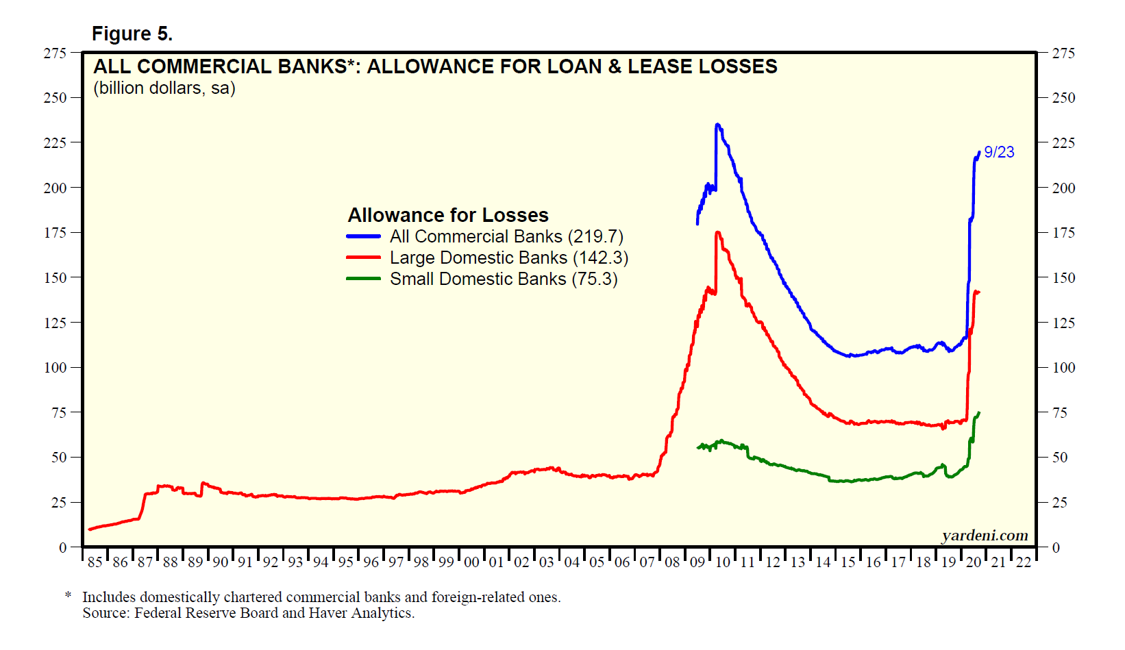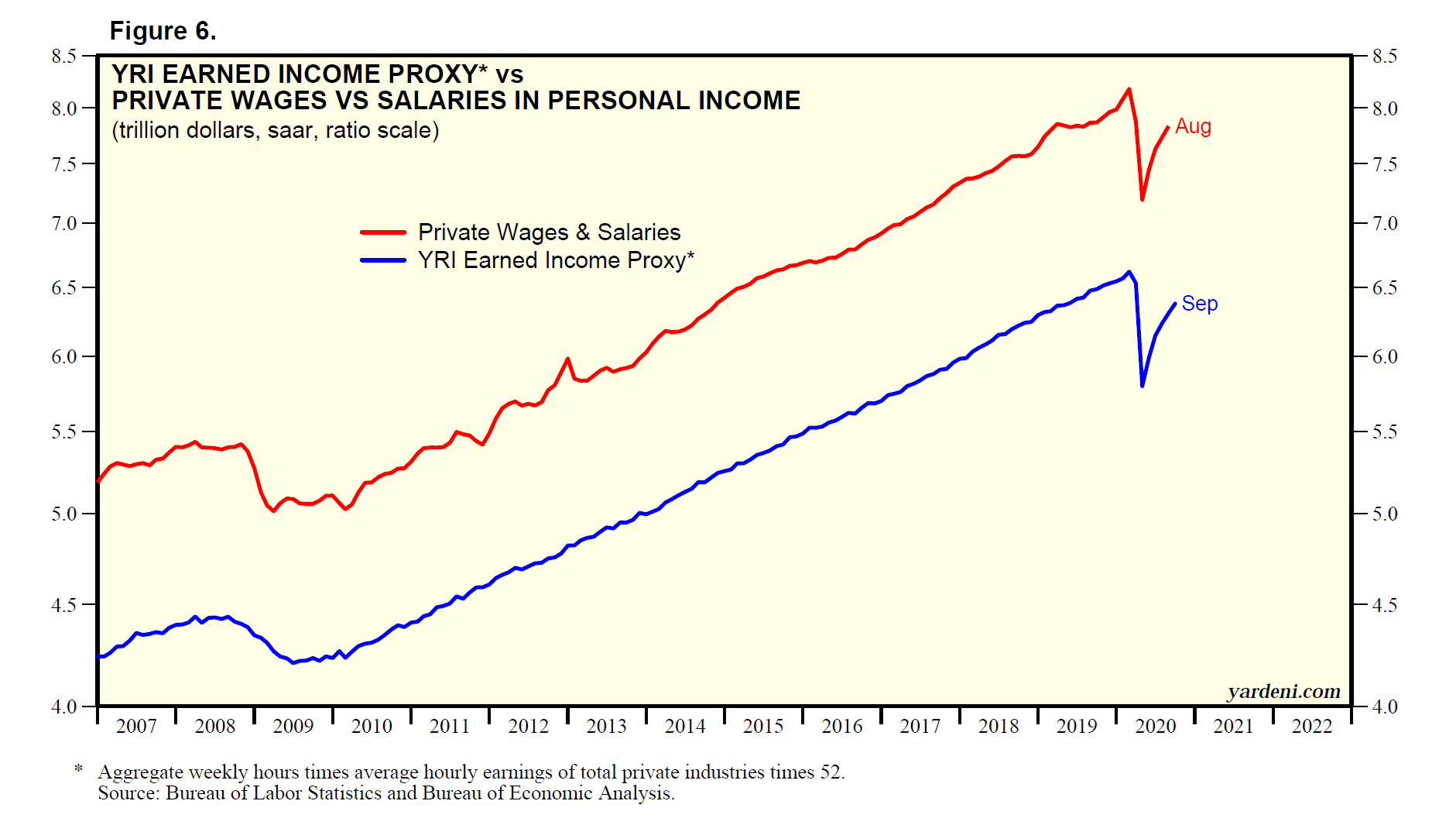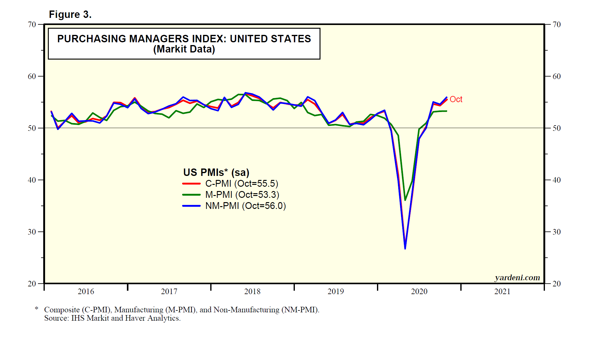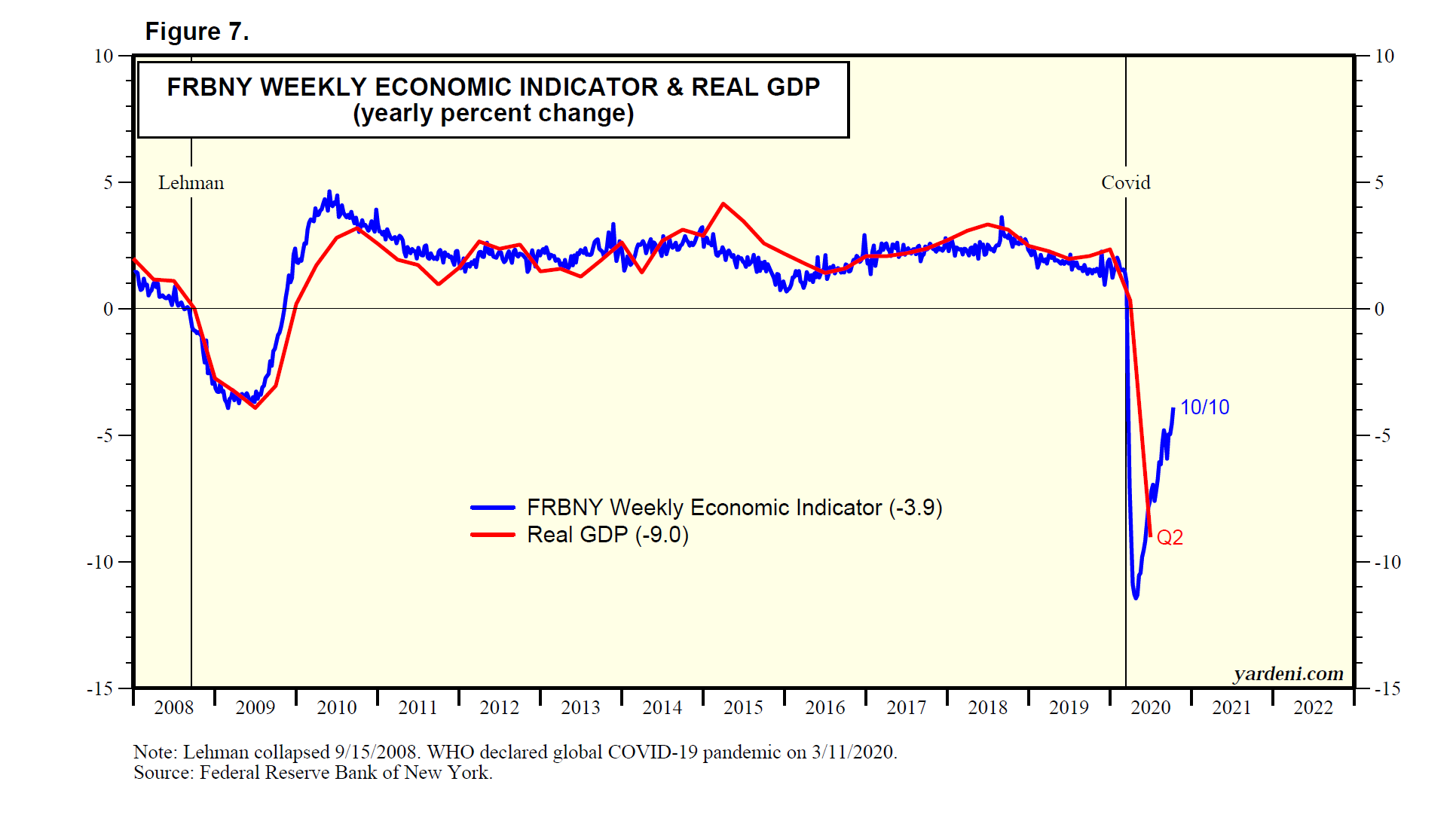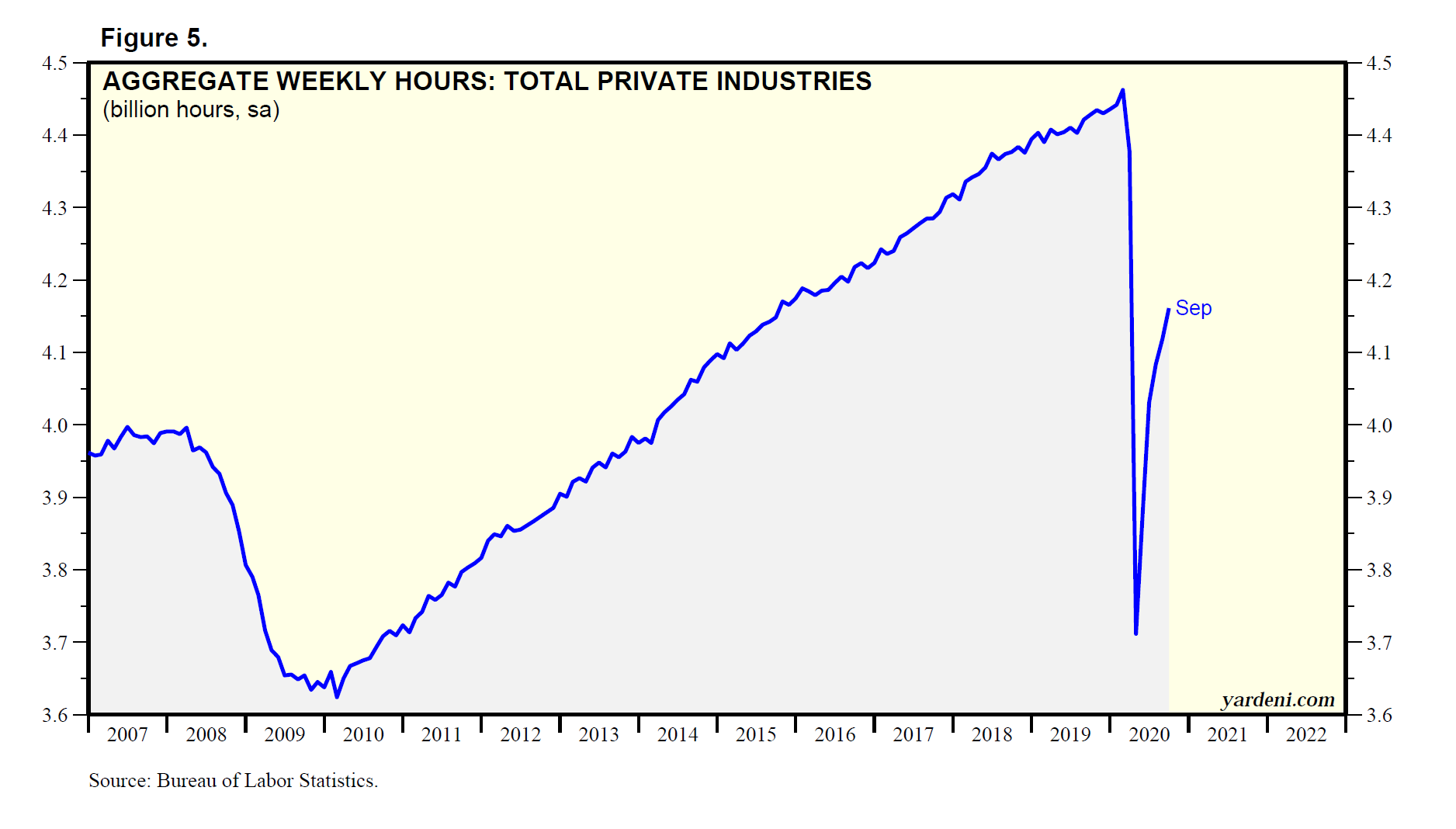 The bottom line is that during Q3 profits have recovered remarkably well from the lockdown recession during the first half of this year. On the other hand, corporate balance sheets are loaded up with more debt than ever. However, much of it has been refinanced at record-low interest rates. It’s all bullish for the economy and the stock market as long as interest rates stay low.