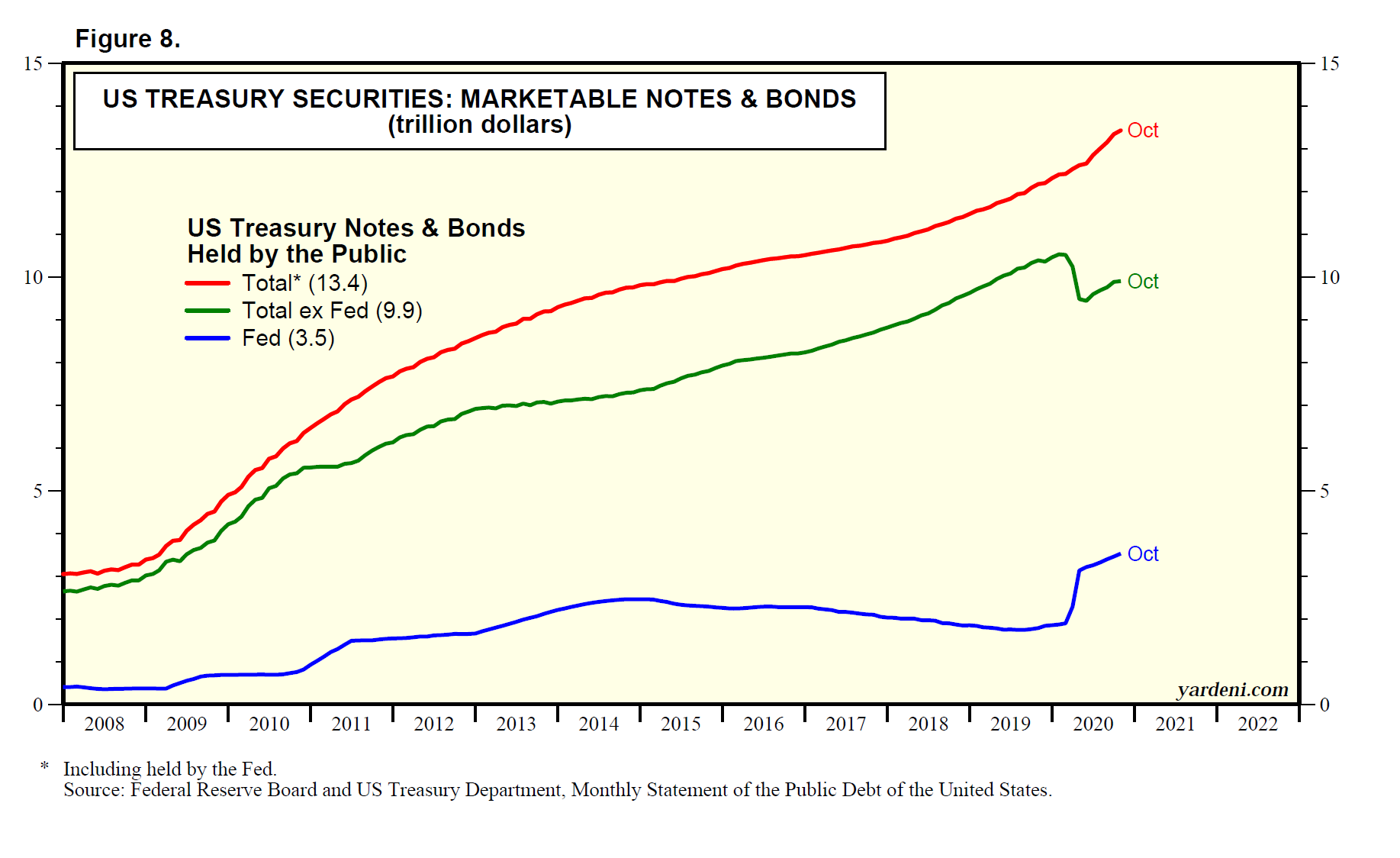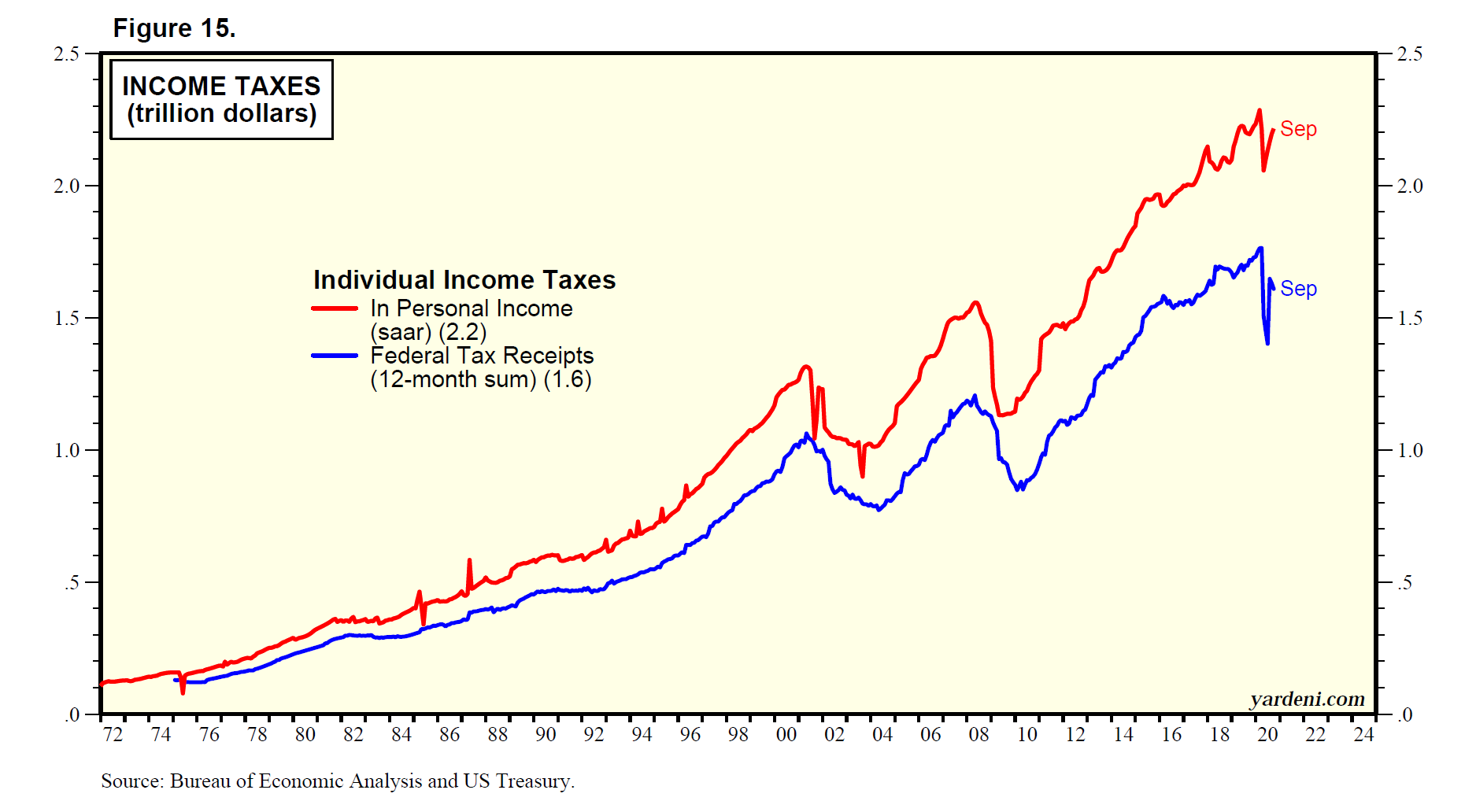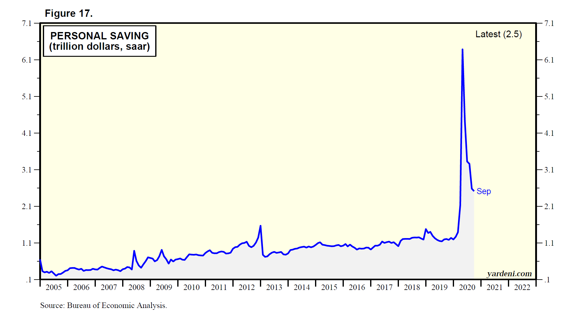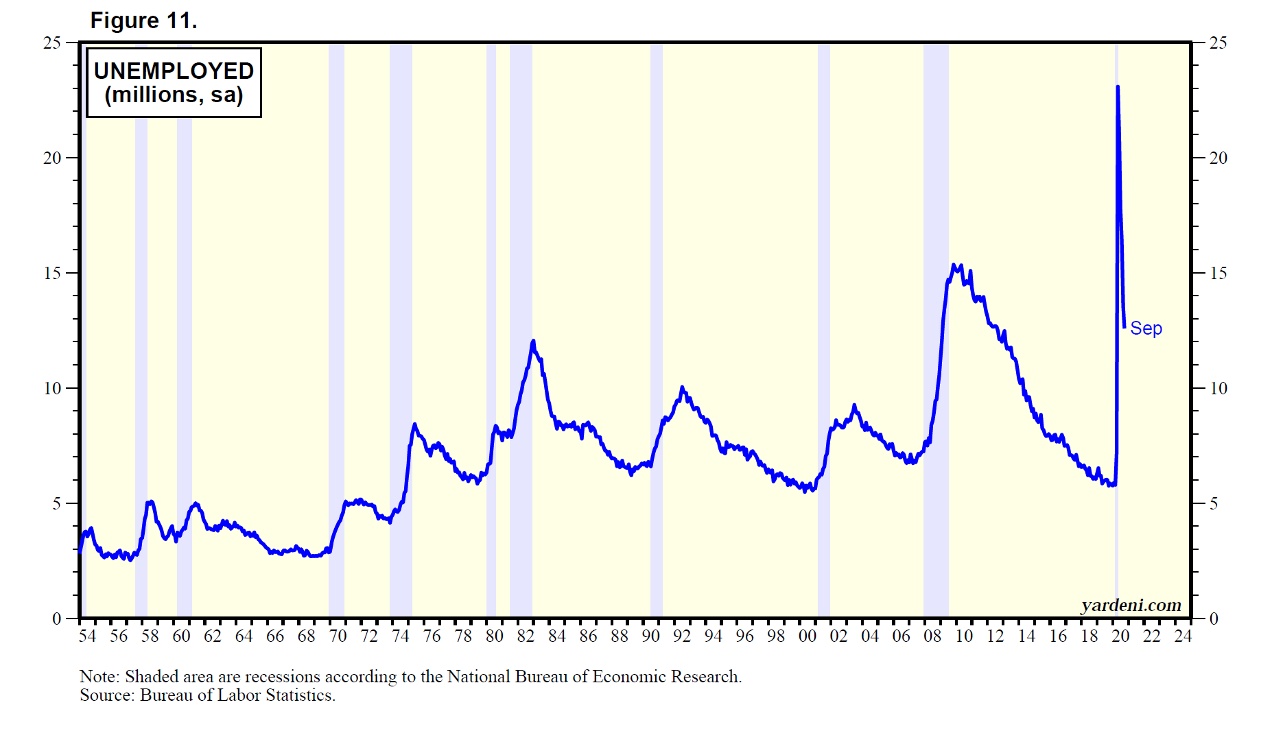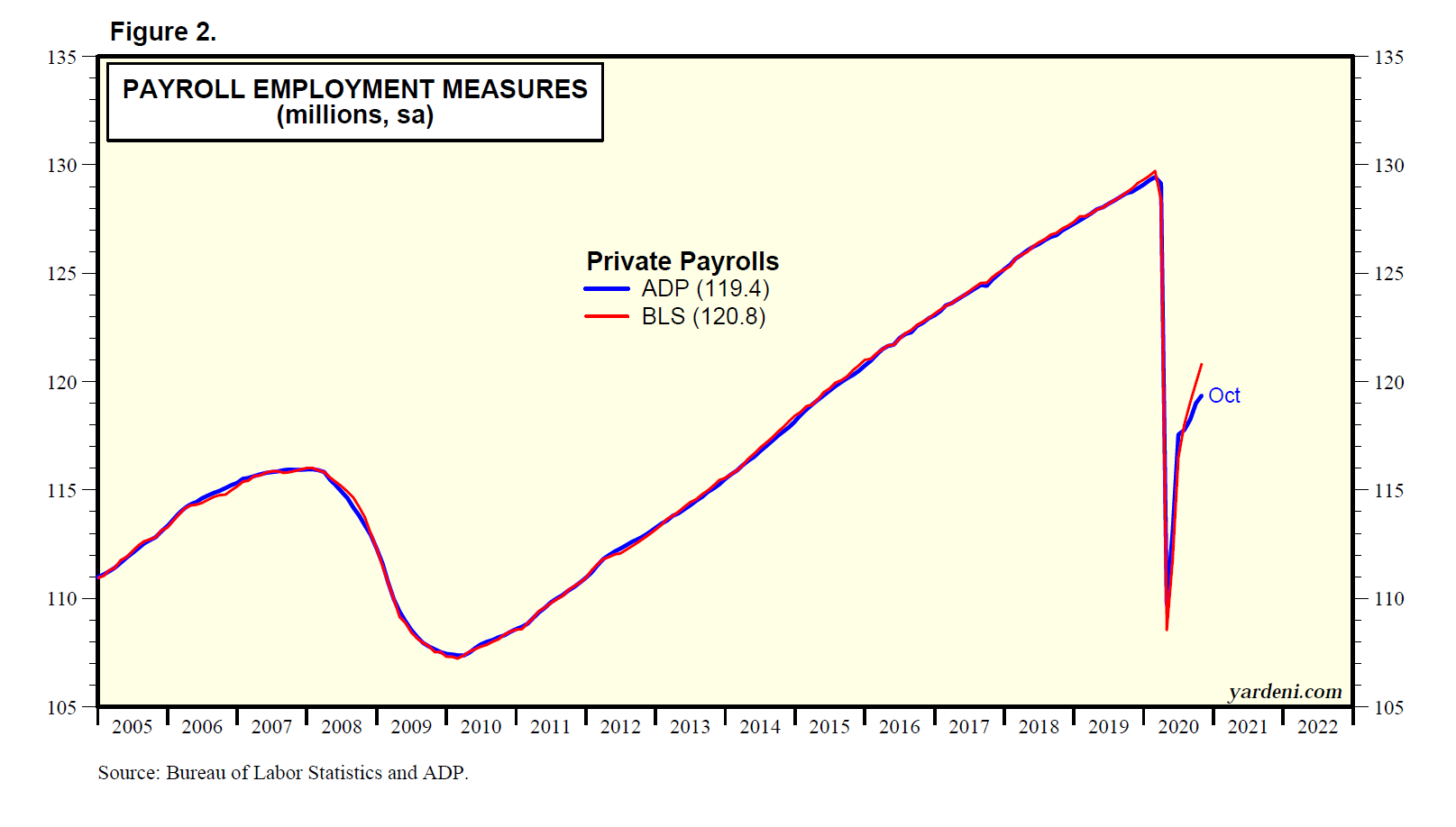 The bottom line is that during Q3 profits have recovered remarkably well from the lockdown recession during the first half of this year. On the other hand, corporate balance sheets are loaded up with more debt than ever. However, much of it has been refinanced at record-low interest rates. It’s all bullish for the economy and the stock market as long as interest rates stay low.