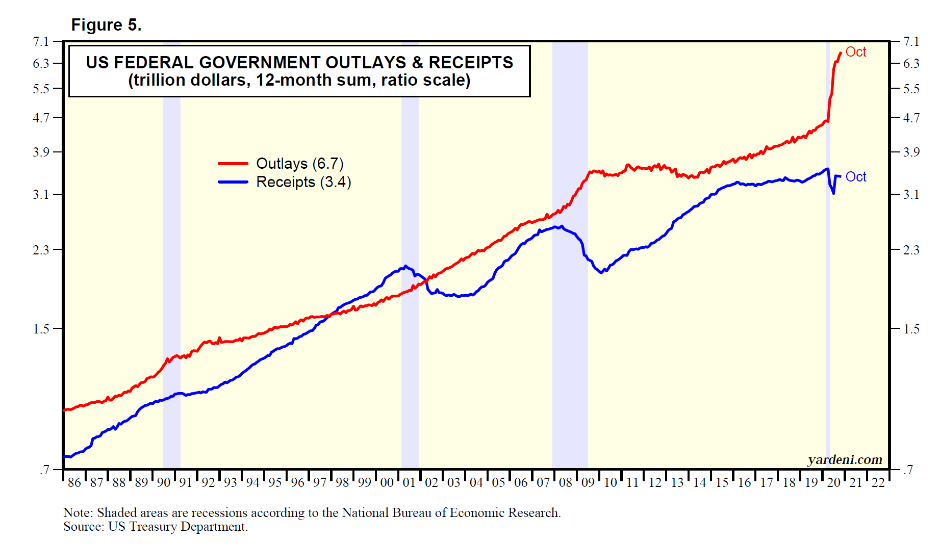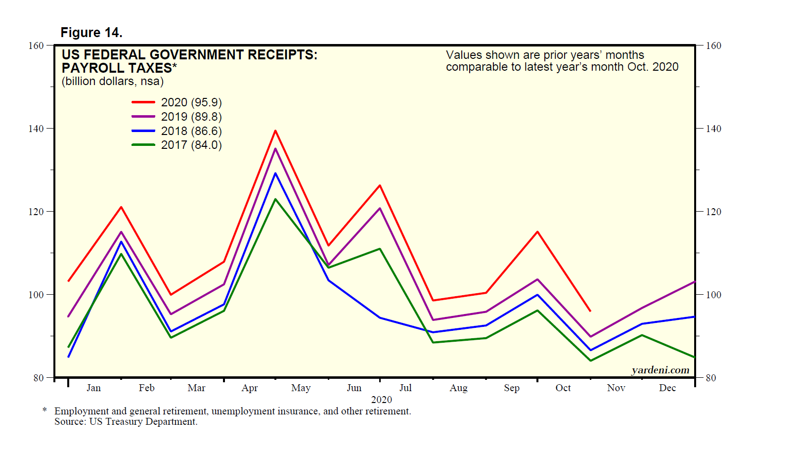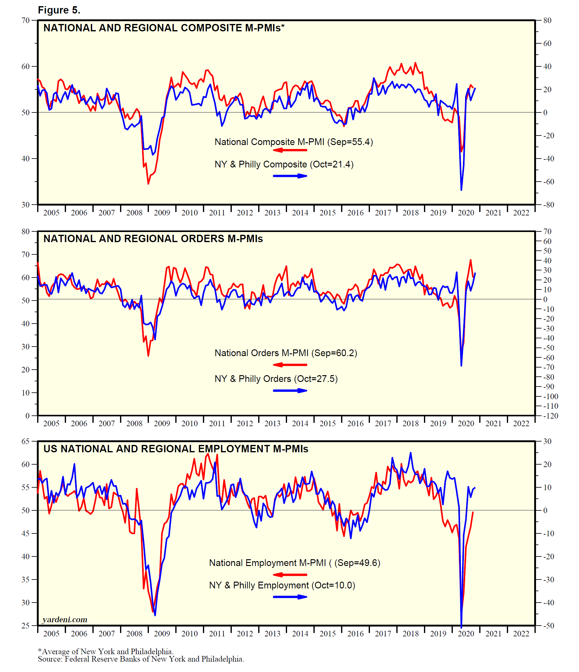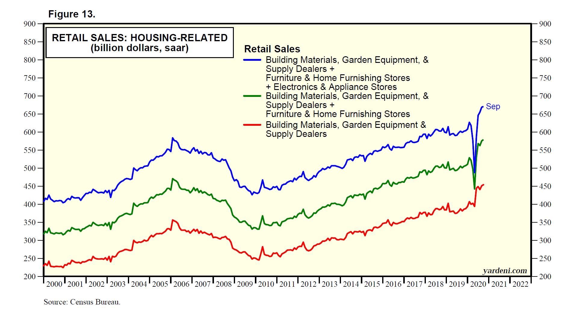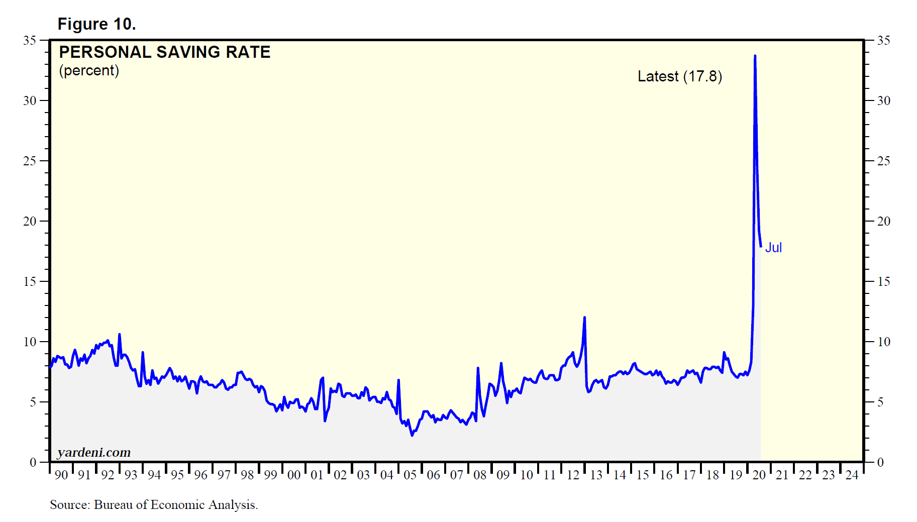 The bottom line is that during Q3 profits have recovered remarkably well from the lockdown recession during the first half of this year. On the other hand, corporate balance sheets are loaded up with more debt than ever. However, much of it has been refinanced at record-low interest rates. It’s all bullish for the economy and the stock market as long as interest rates stay low.