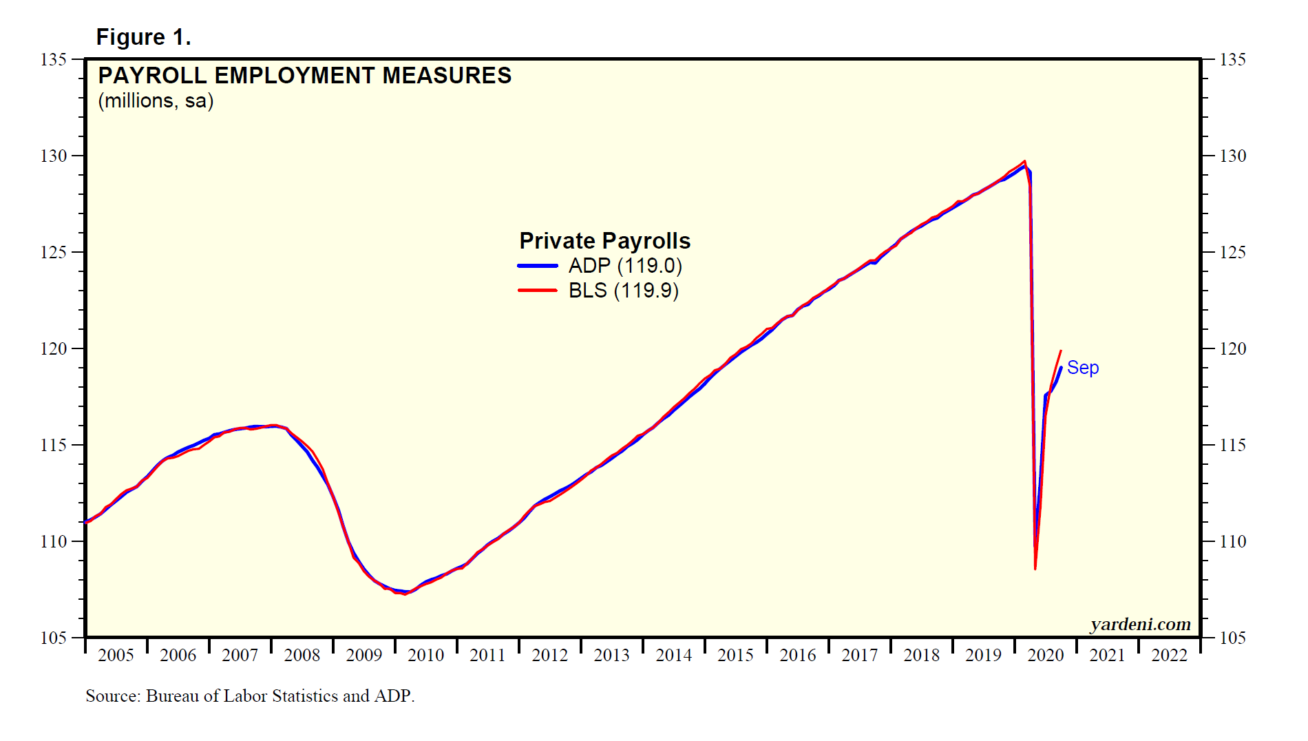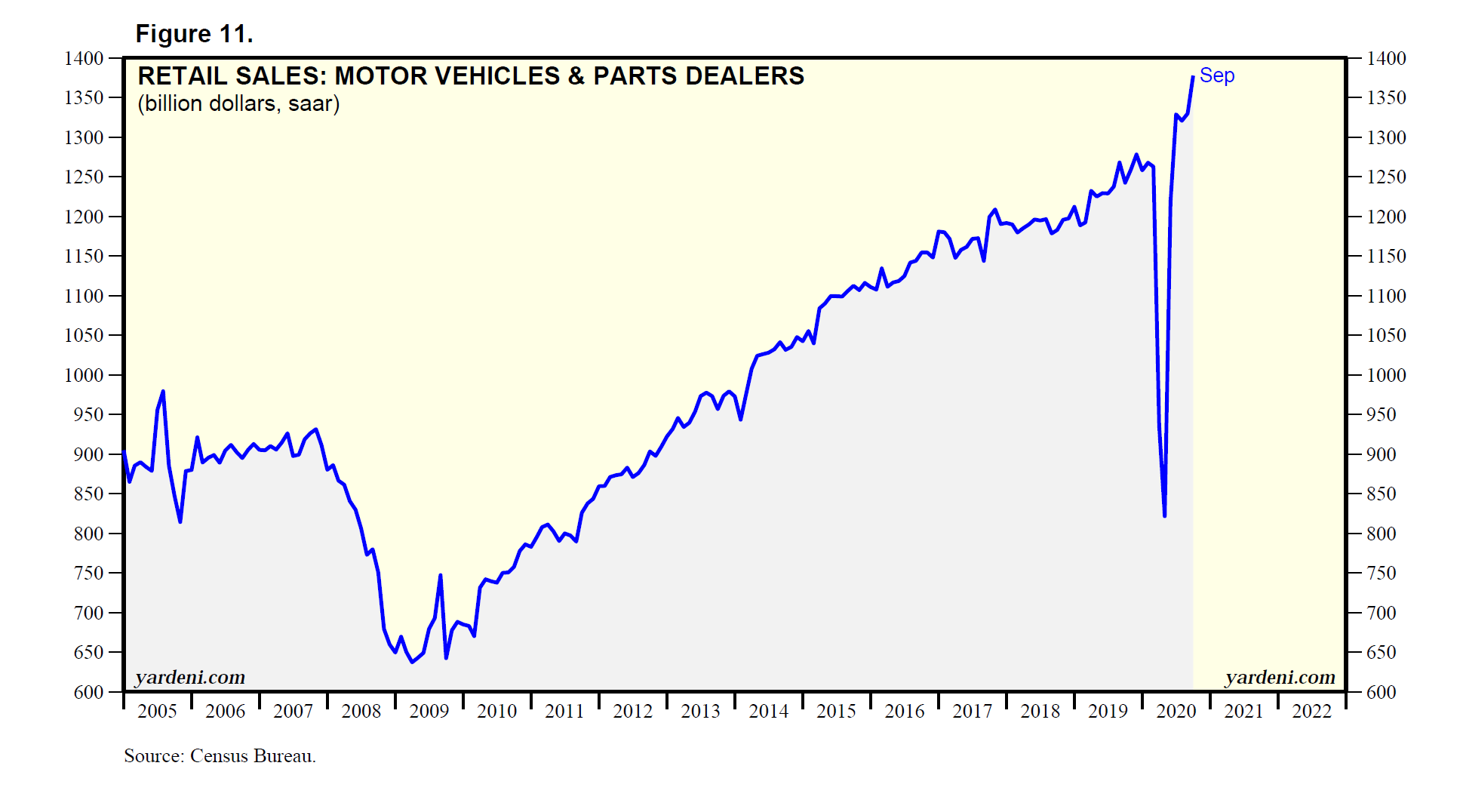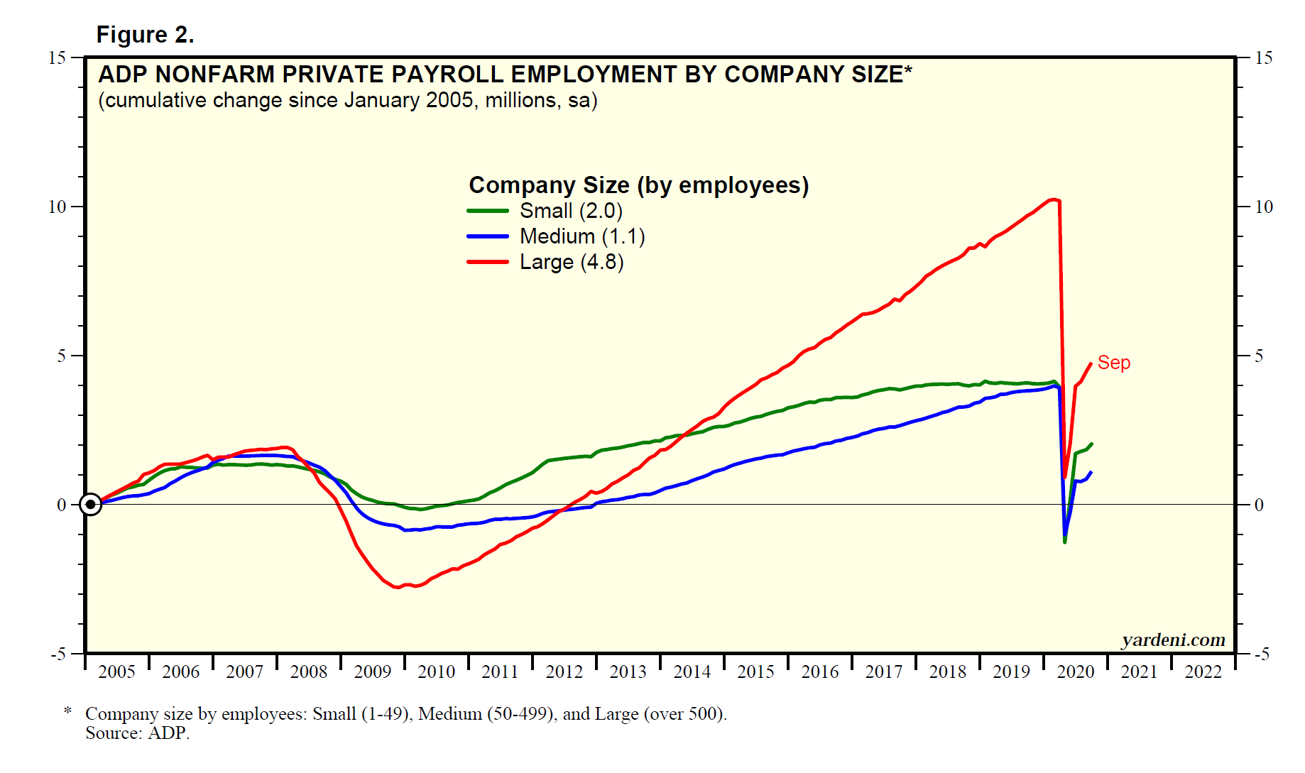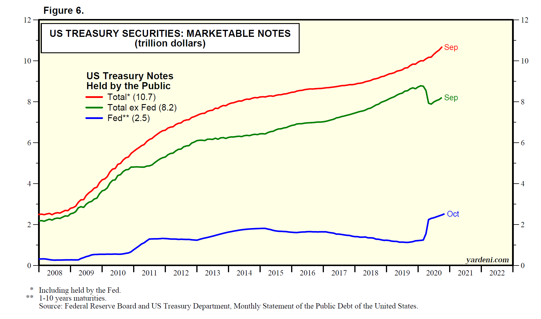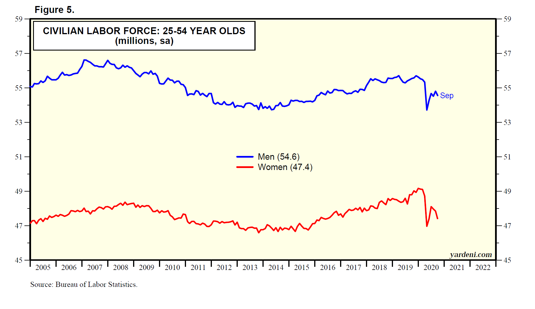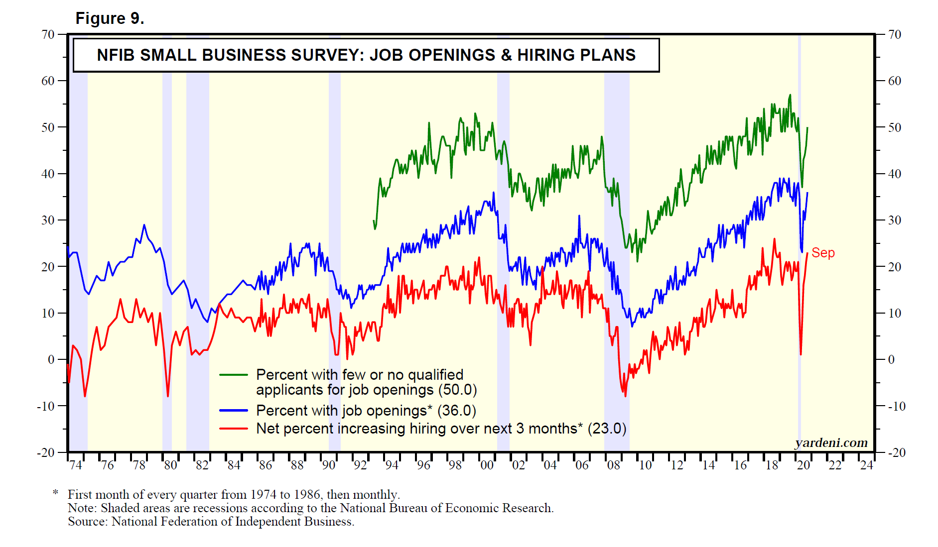 The bottom line is that during Q3 profits have recovered remarkably well from the lockdown recession during the first half of this year. On the other hand, corporate balance sheets are loaded up with more debt than ever. However, much of it has been refinanced at record-low interest rates. It’s all bullish for the economy and the stock market as long as interest rates stay low.