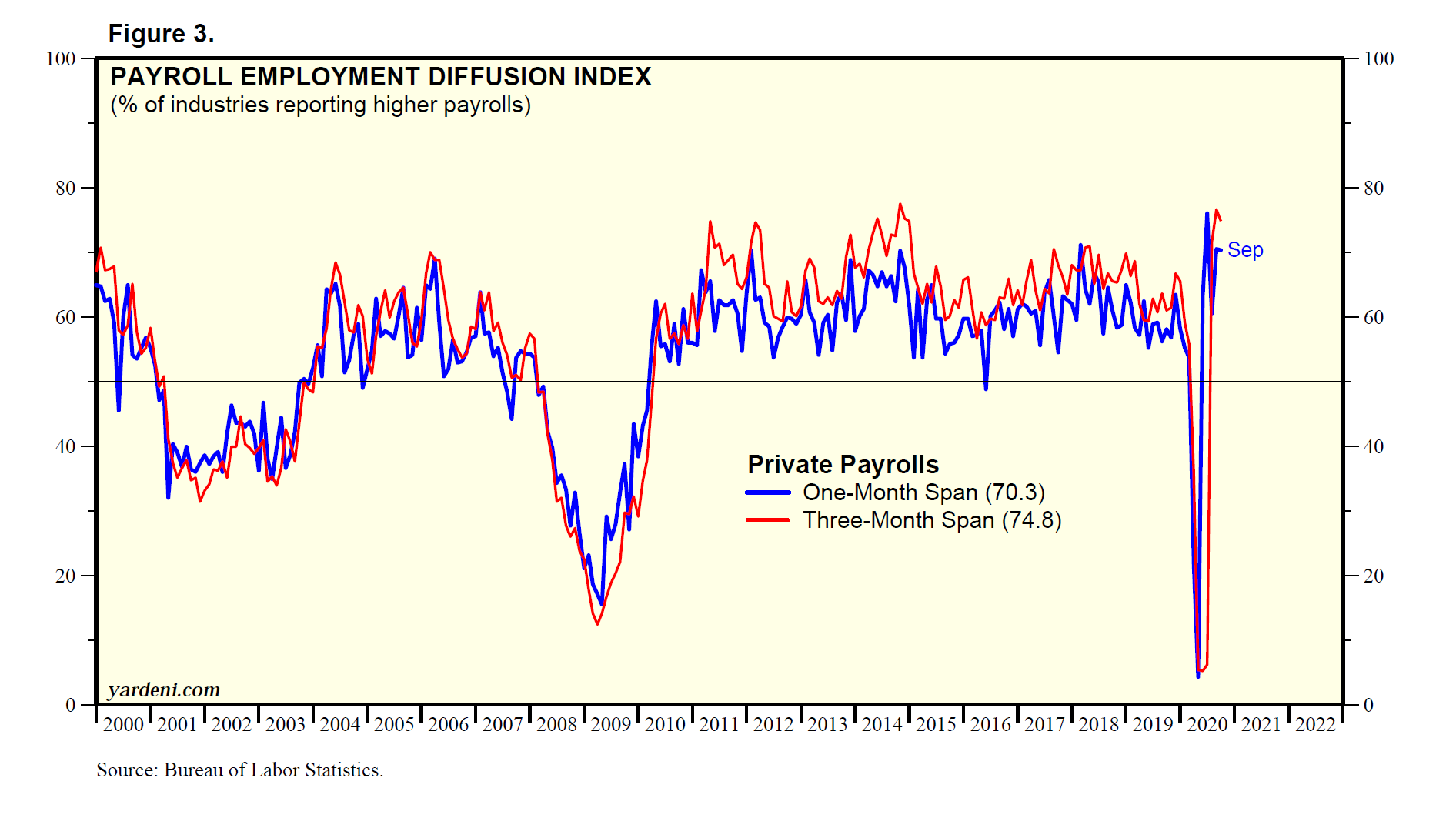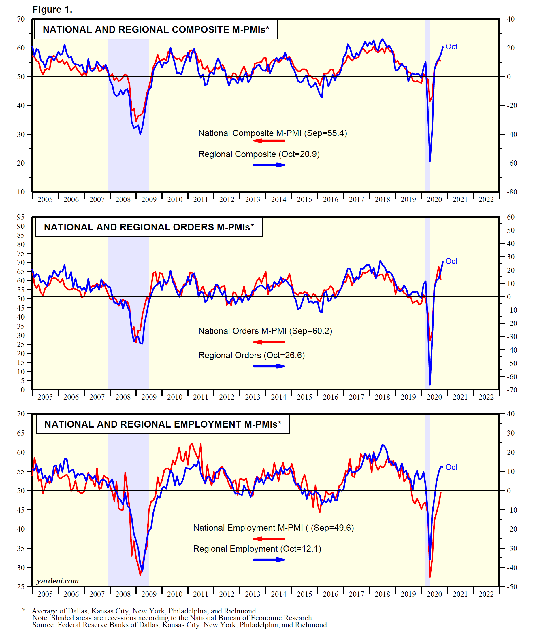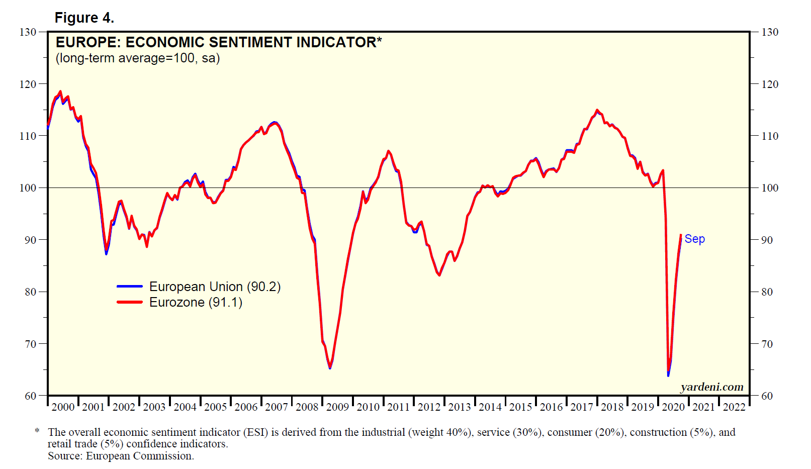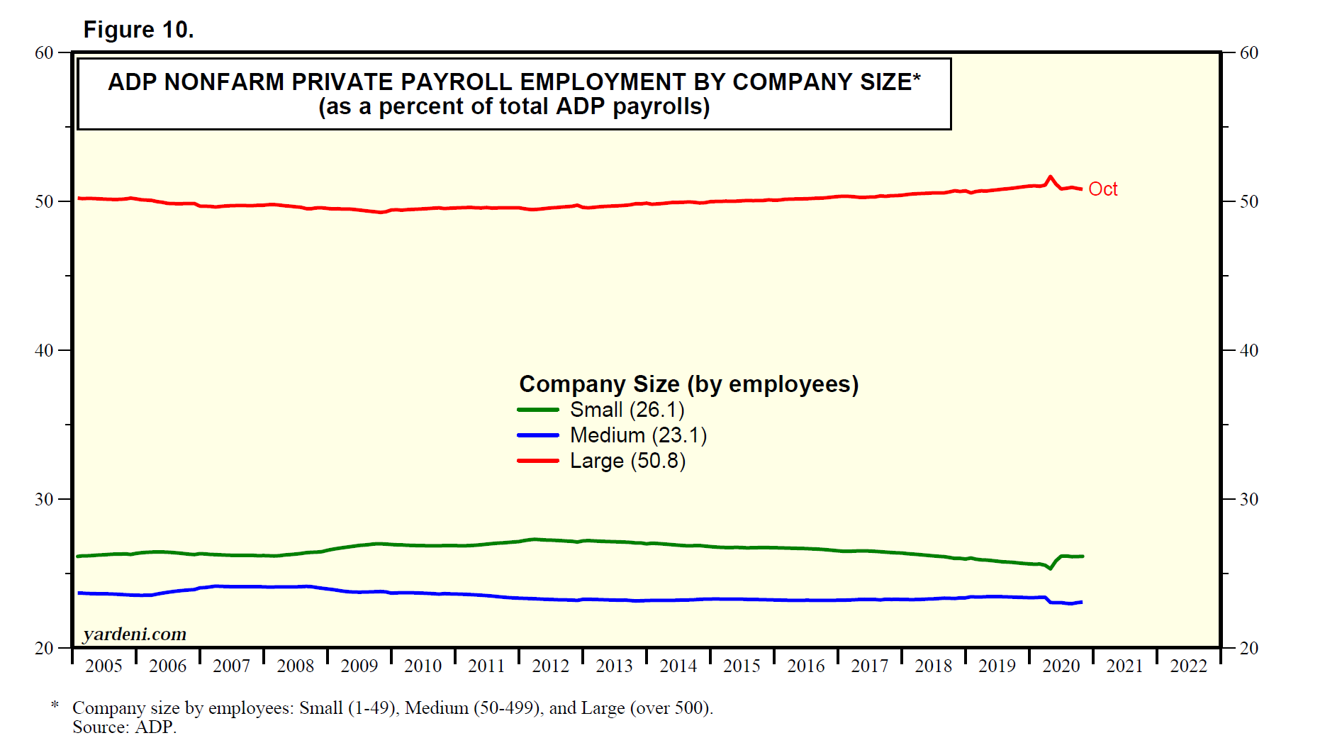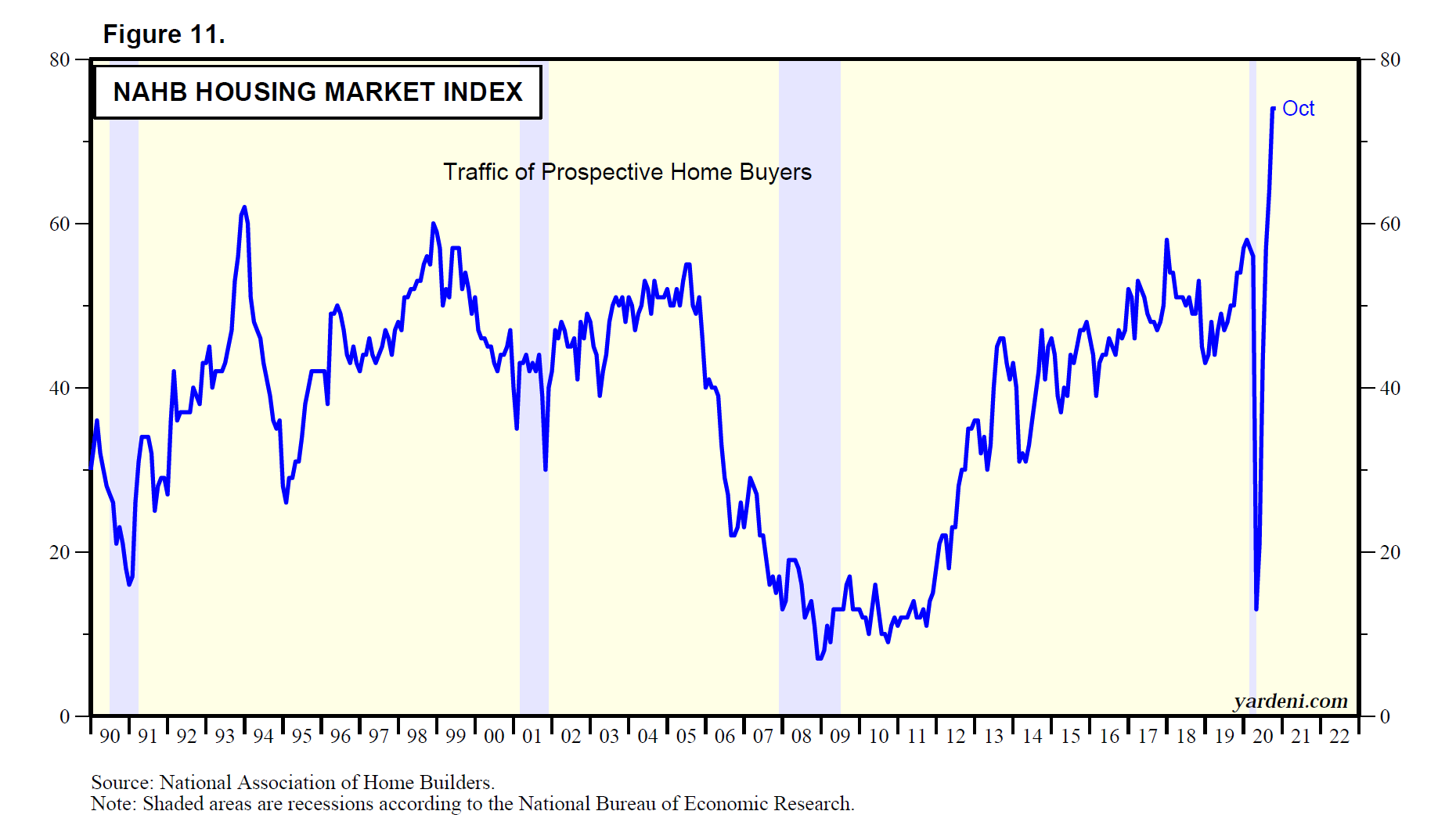 The bottom line is that during Q3 profits have recovered remarkably well from the lockdown recession during the first half of this year. On the other hand, corporate balance sheets are loaded up with more debt than ever. However, much of it has been refinanced at record-low interest rates. It’s all bullish for the economy and the stock market as long as interest rates stay low.