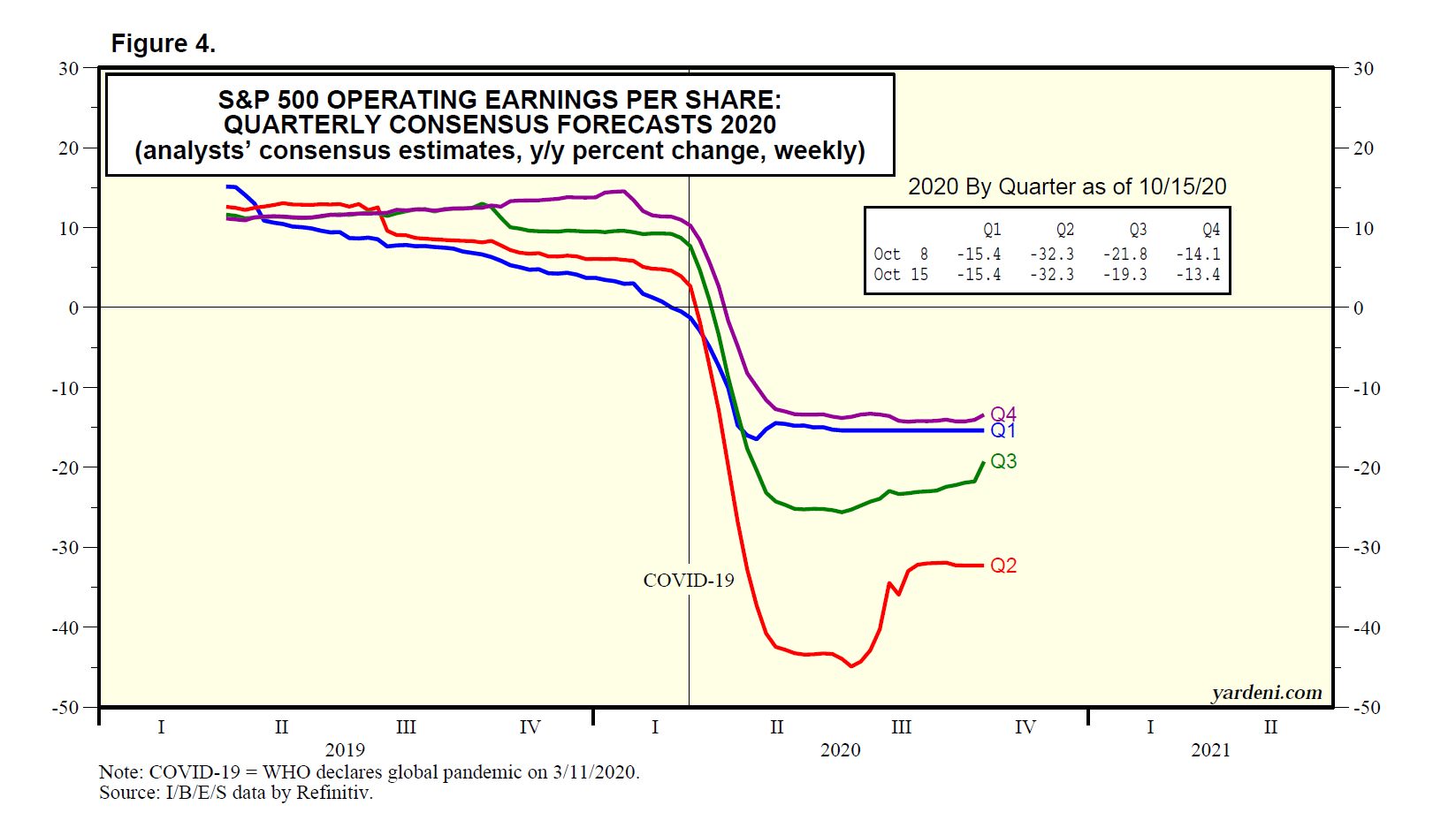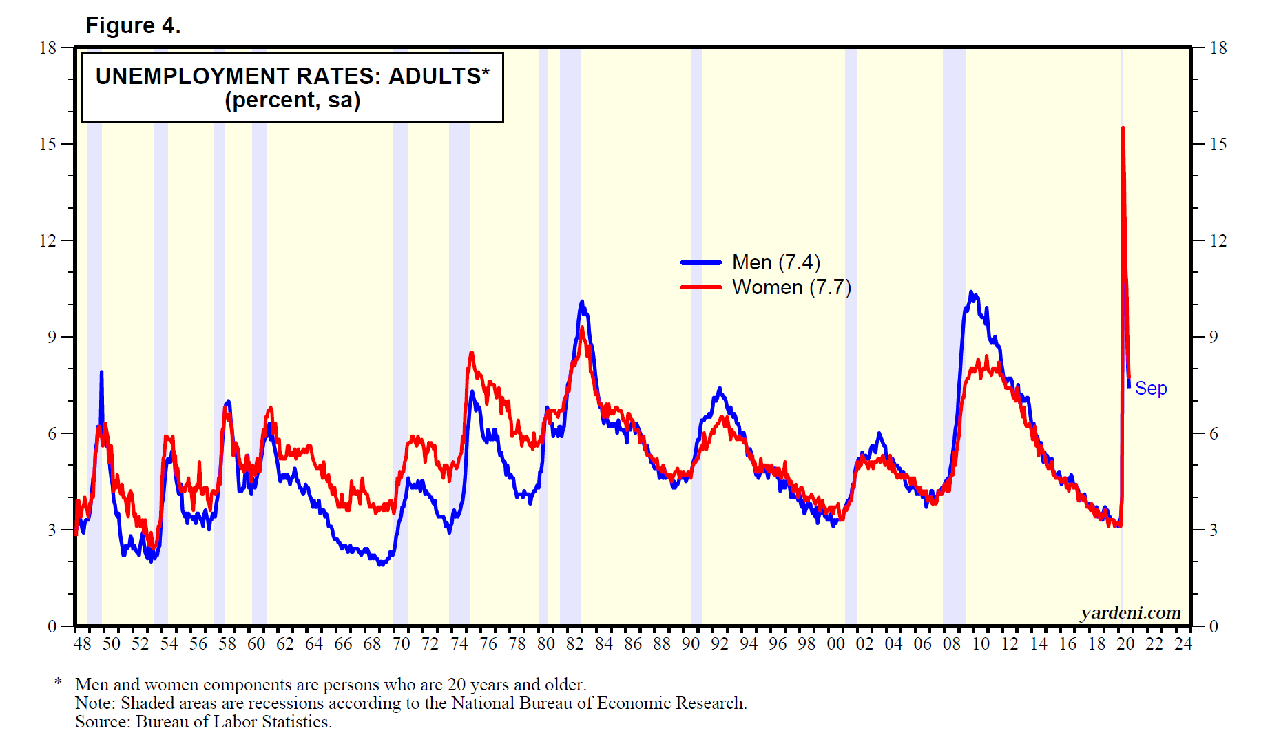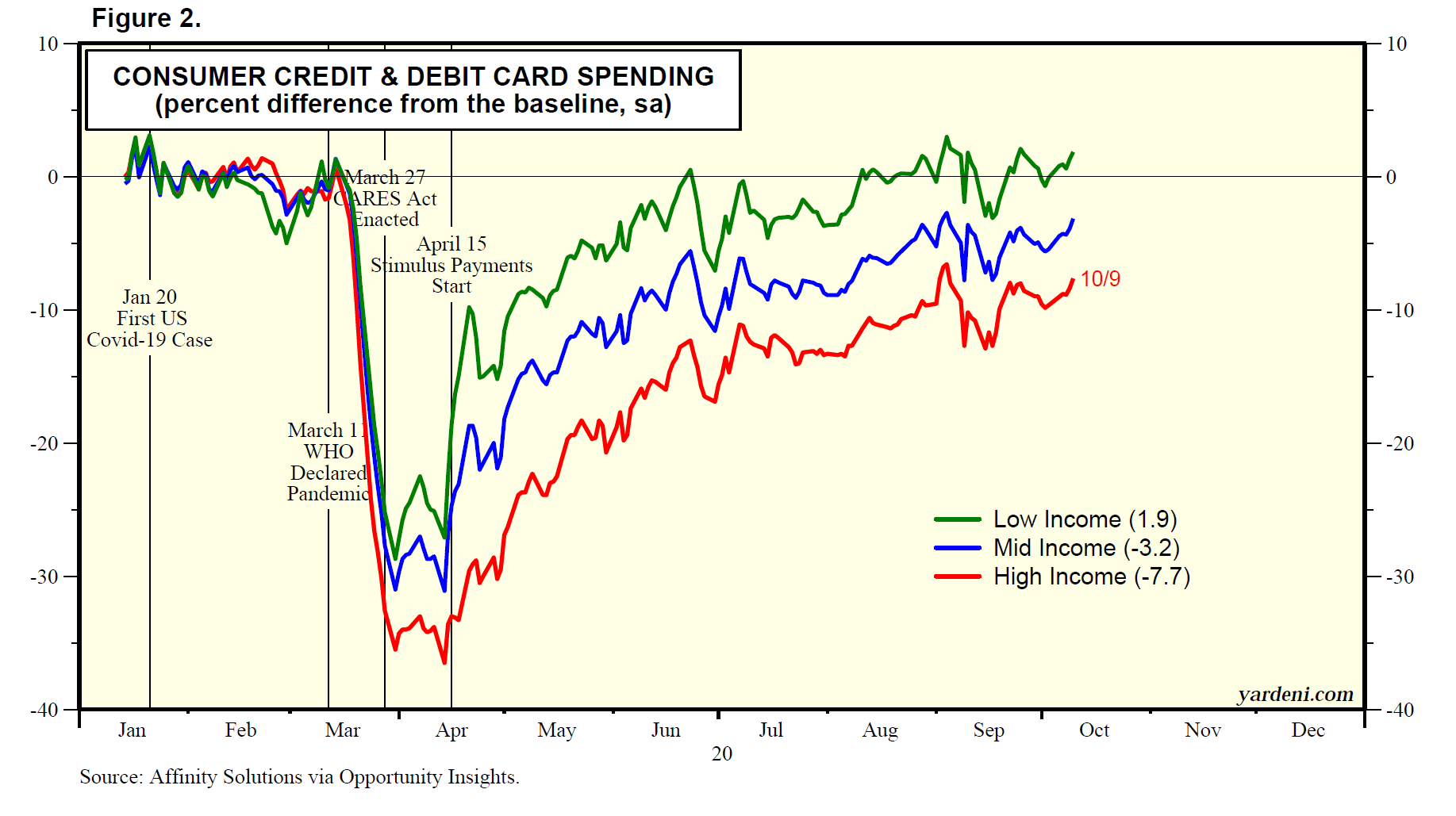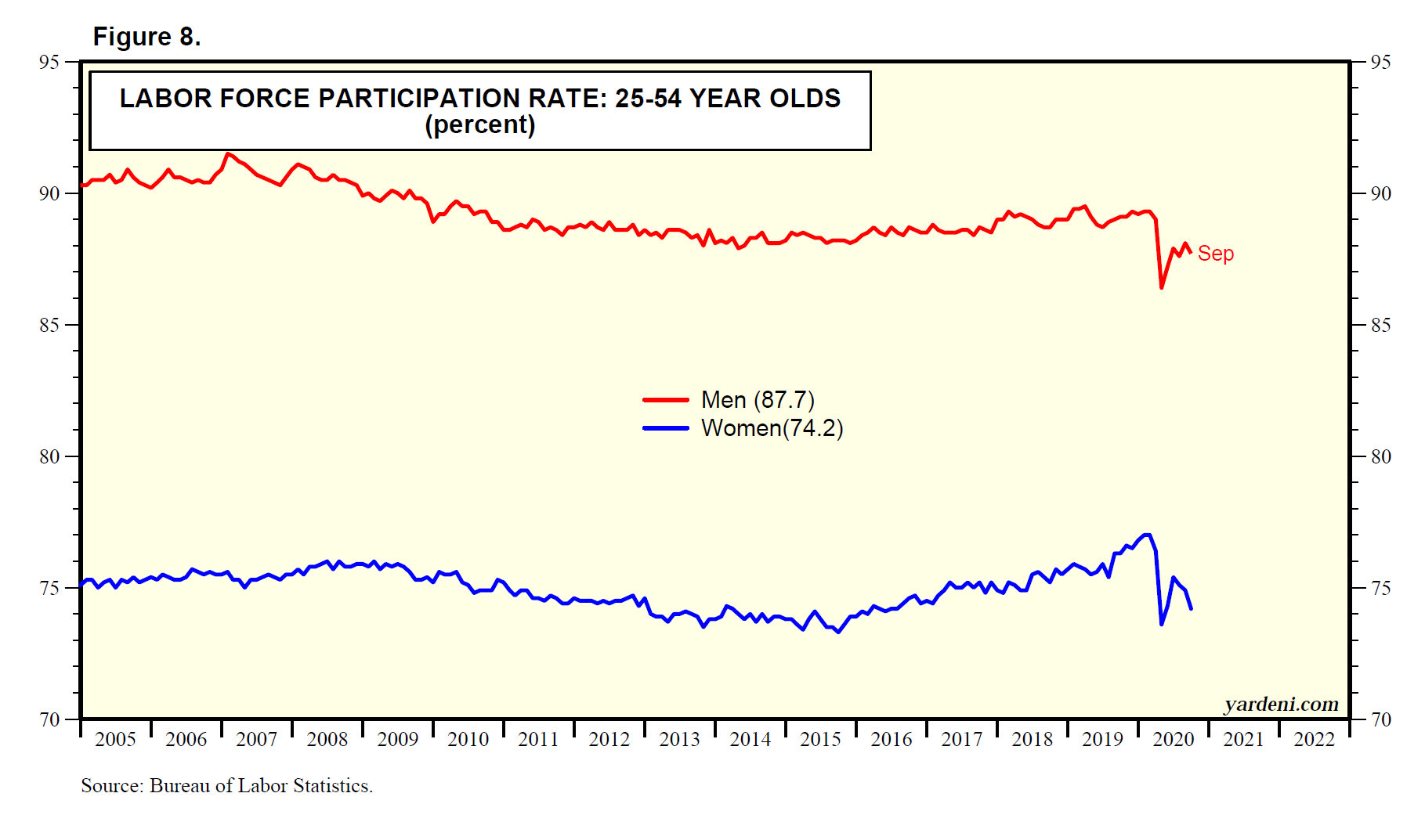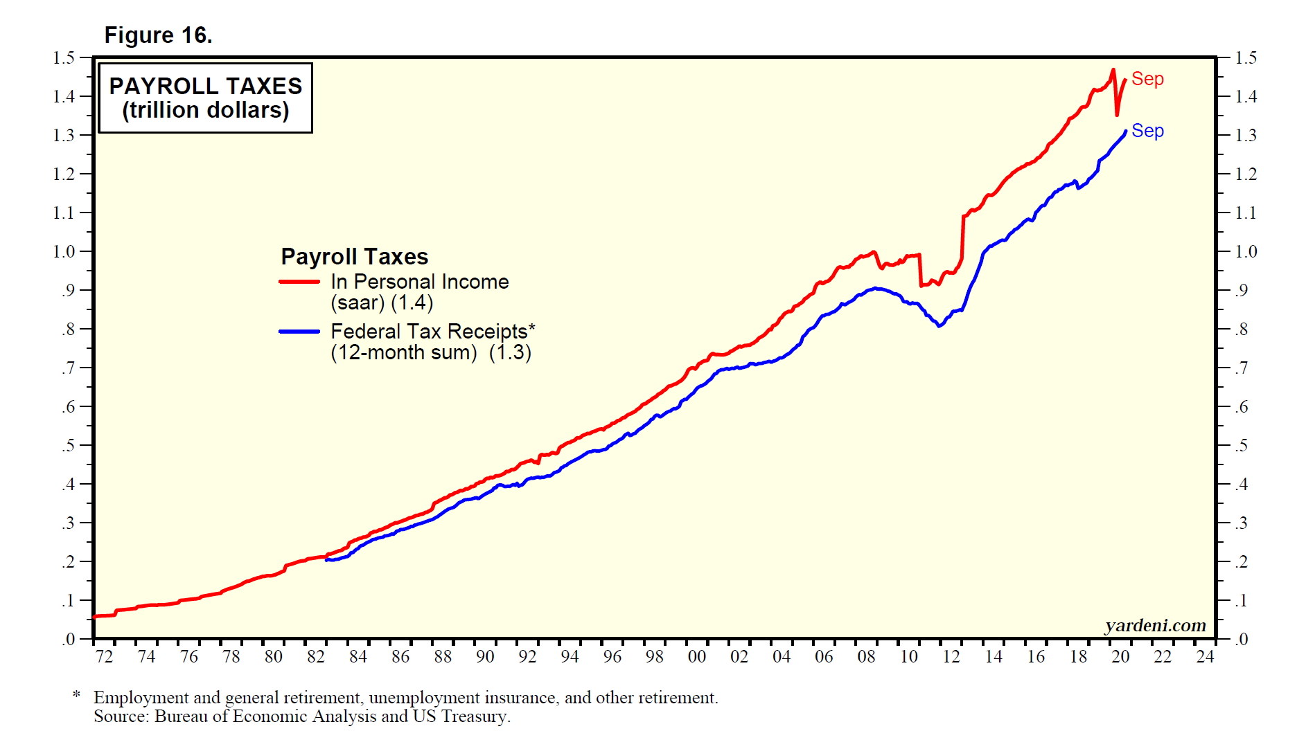 The bottom line is that during Q3 profits have recovered remarkably well from the lockdown recession during the first half of this year. On the other hand, corporate balance sheets are loaded up with more debt than ever. However, much of it has been refinanced at record-low interest rates. It’s all bullish for the economy and the stock market as long as interest rates stay low.