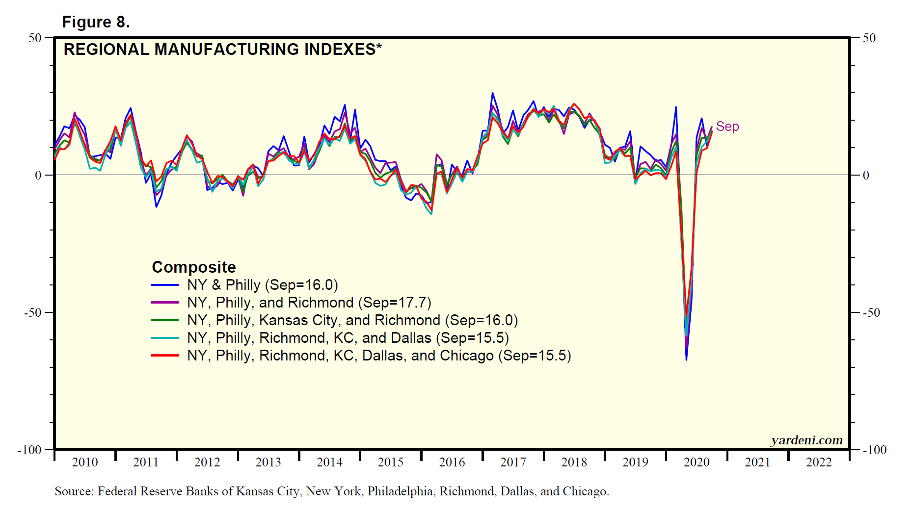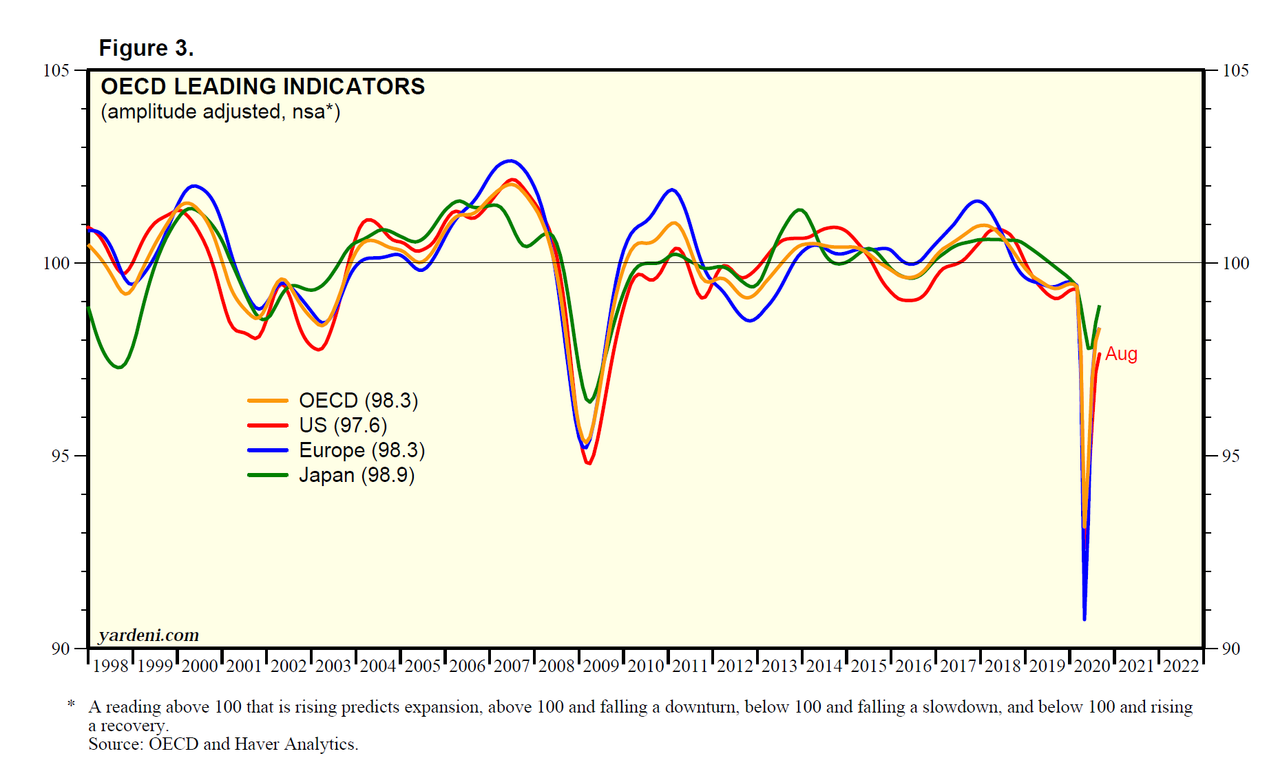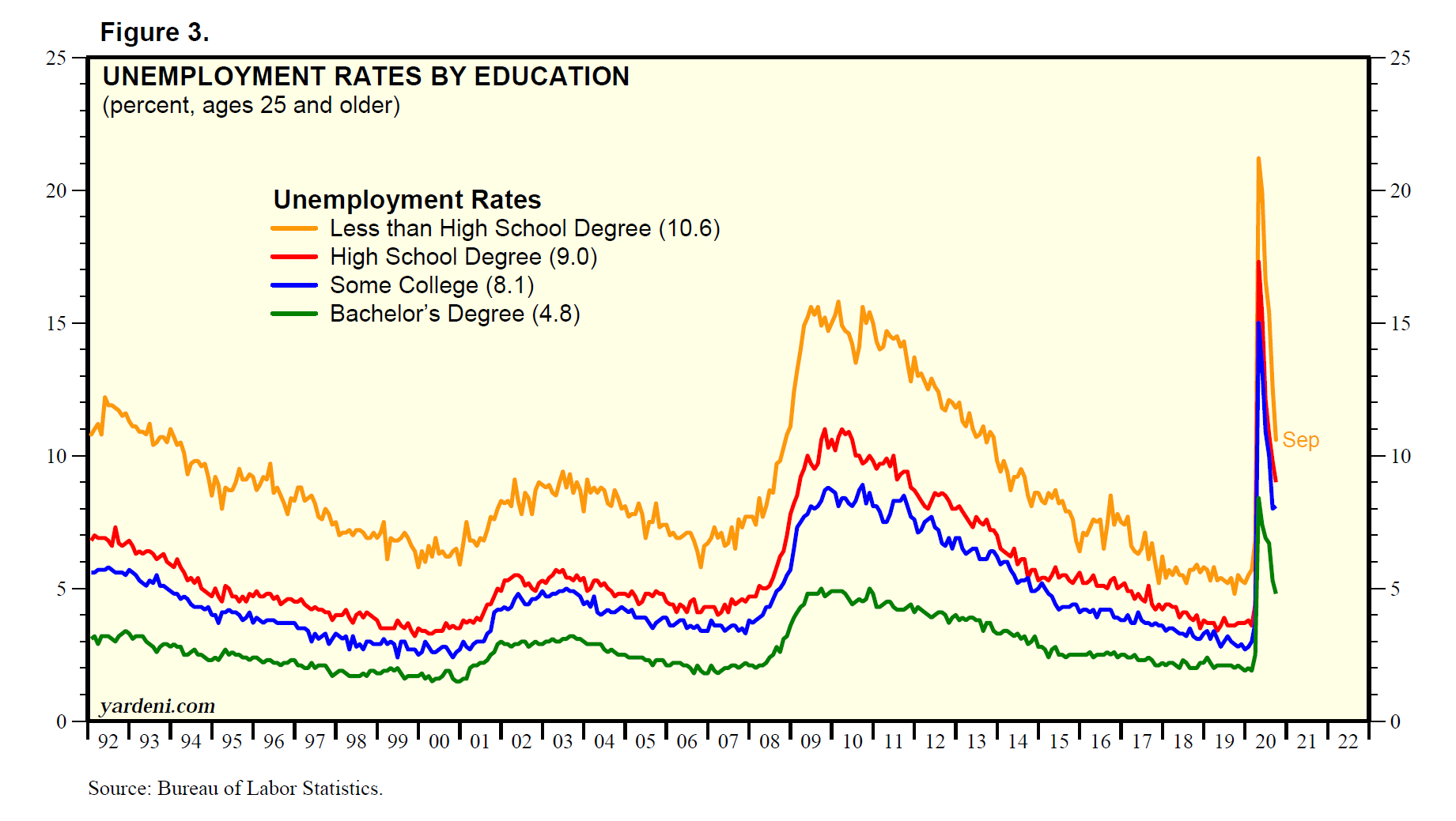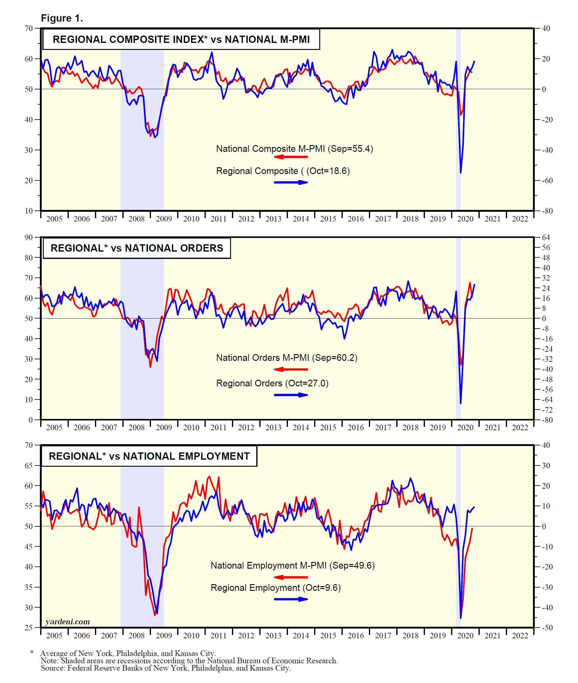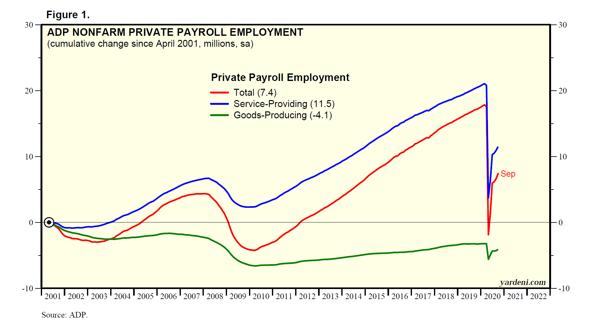 The bottom line is that during Q3 profits have recovered remarkably well from the lockdown recession during the first half of this year. On the other hand, corporate balance sheets are loaded up with more debt than ever. However, much of it has been refinanced at record-low interest rates. It’s all bullish for the economy and the stock market as long as interest rates stay low.