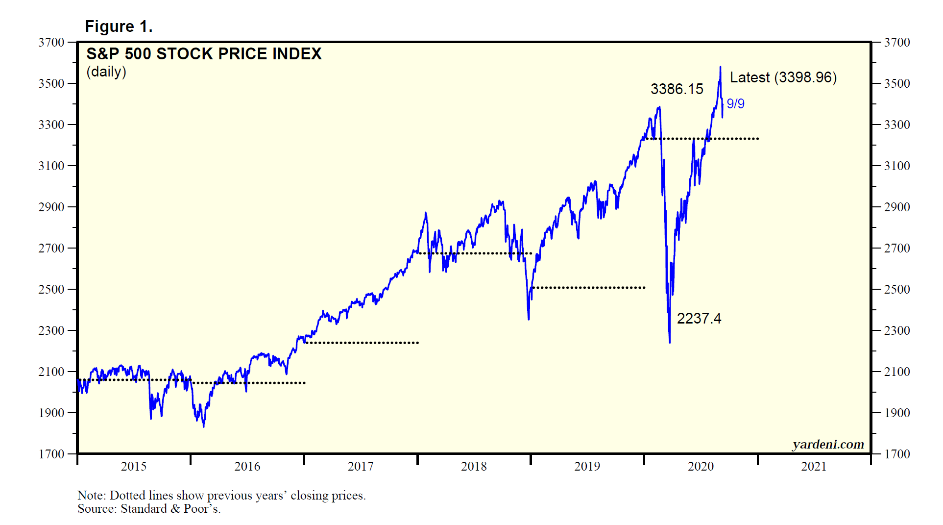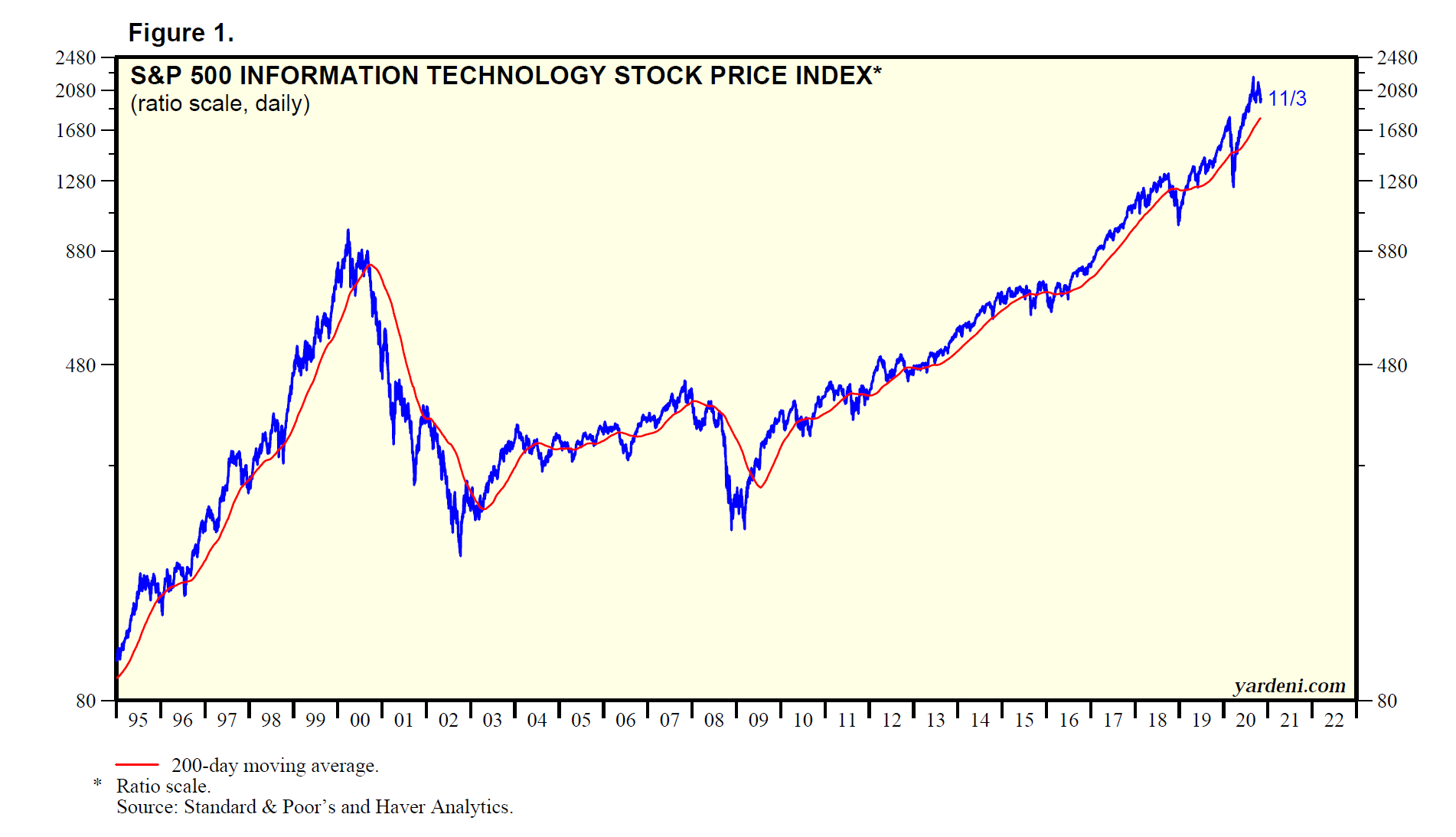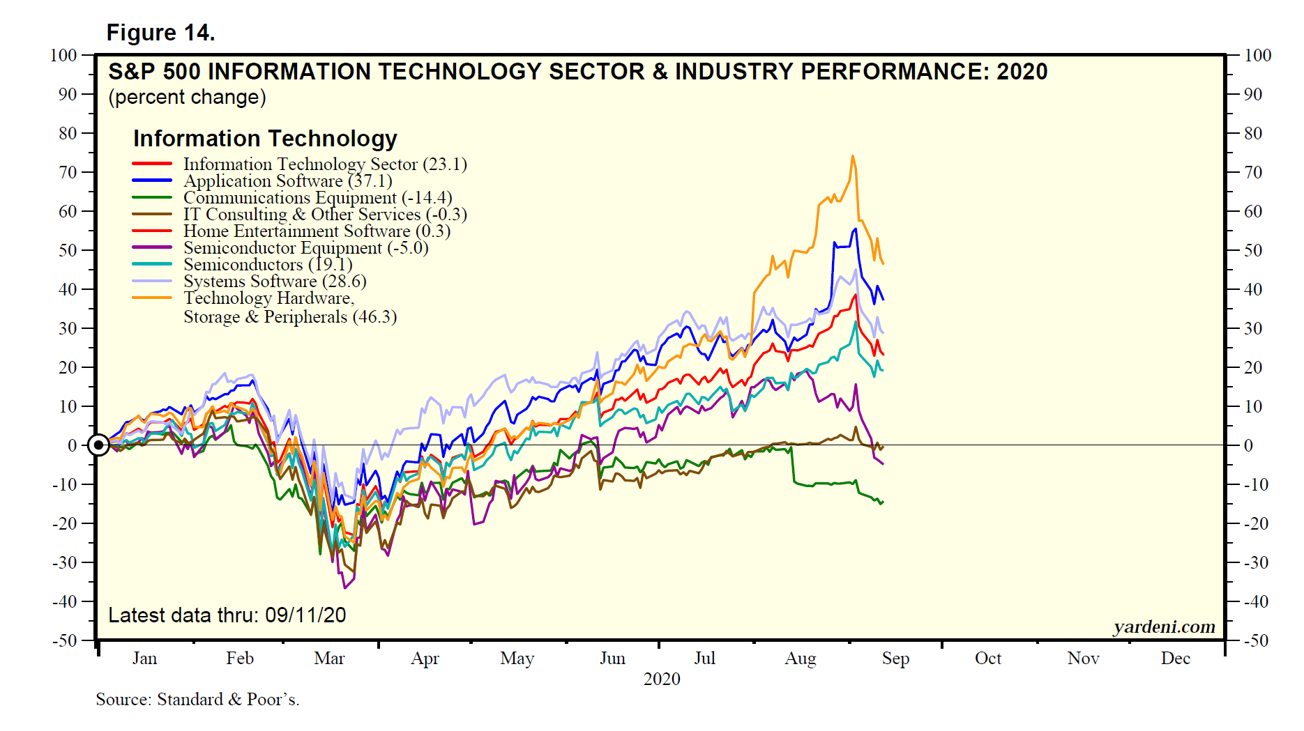 Strategy: The Day the Market Looked Ahead. Looking back on the year, September 2 was an unexpectedly important day. As summer was drawing to a close, the S&P 500 Information Technology stock price index made a high that it didn’t surpass until yesterday. In September, investors began looking ahead to 2021 with hopes of recovery from the pandemic and all the damage it has wrought during this terrible, horrible, no good, very bad year. Instead of buying tech names that benefitted from everyone working and shopping from home, investors began to snap up cyclical companies and those that would recover from a reopened economy.