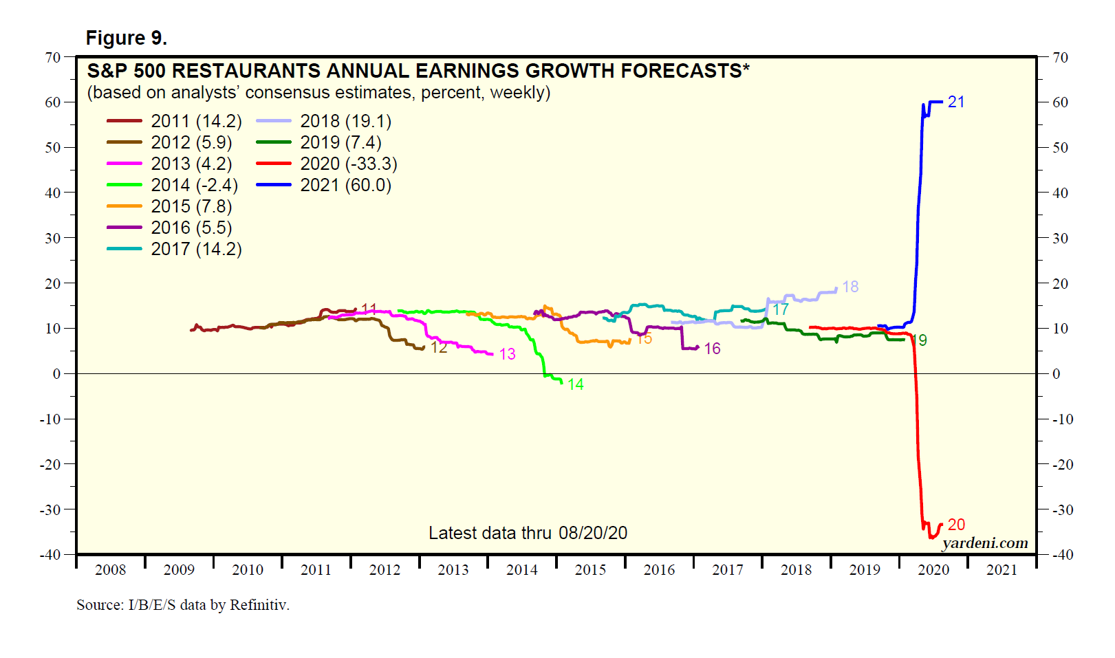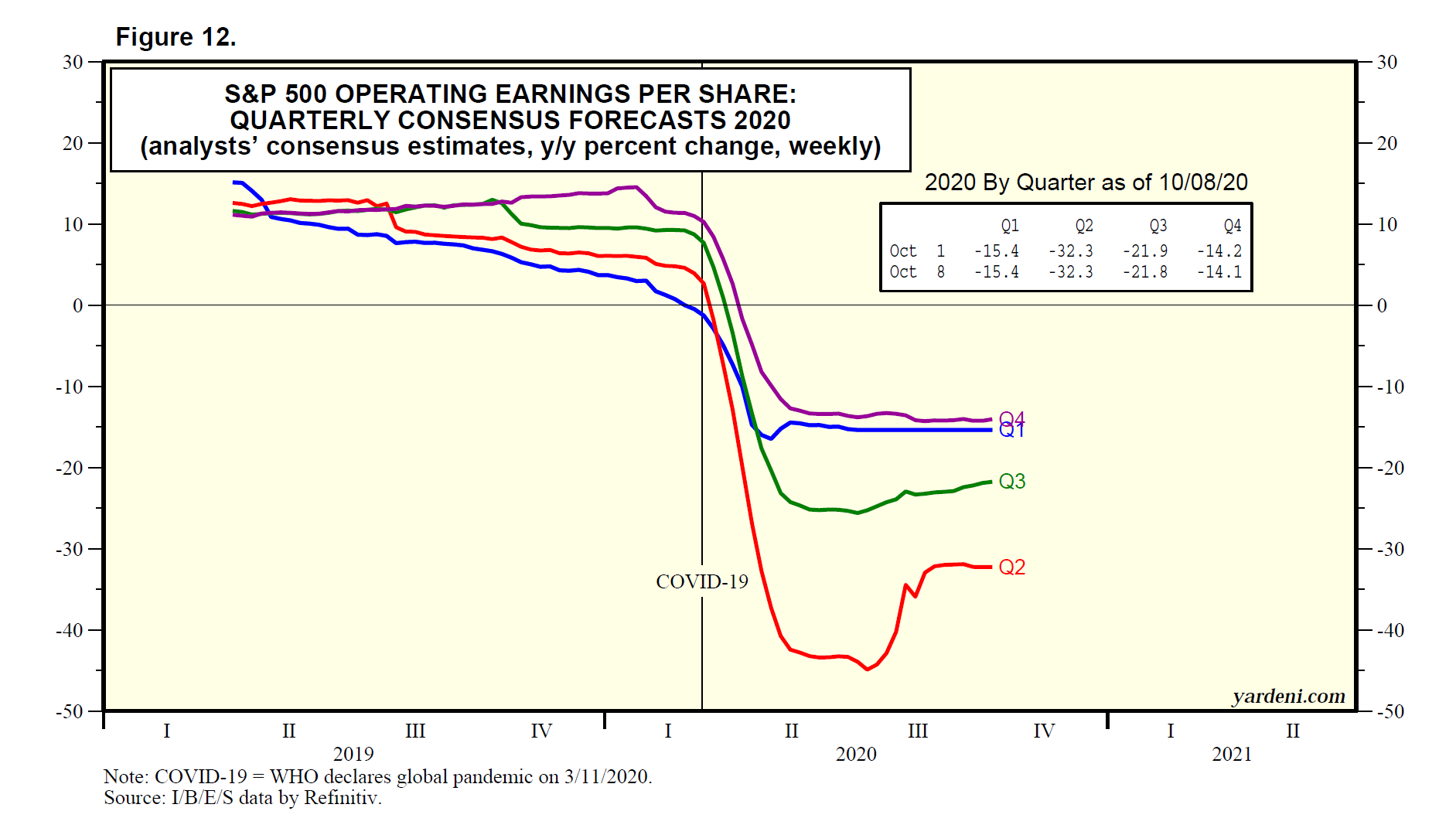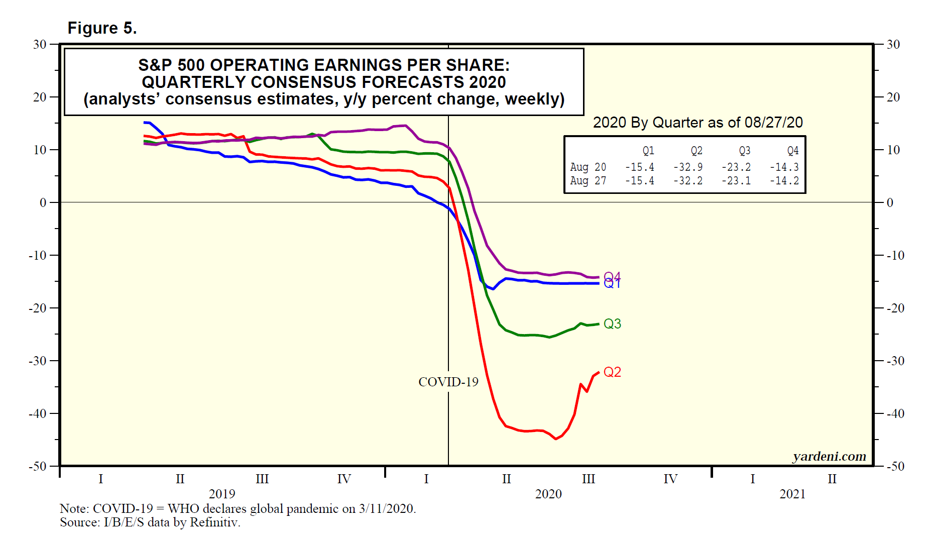 Strategy II: Raising Earnings Outlook. Joe and I have been infected with the bullish virus for quite some time. However, we are doing our best to avoid the deliriousness associated with Mad Bull Disease (MBD). Nevertheless, the stock market has been stampeding past bulls (like us) since it bottomed on March 23, and the economic fundamentals have been doing the same since they bottomed during April. As a result, we’ve had to raise our outlooks for both economic growth and S&P 500 earnings as well as our target for the S&P 500 index a few times since then. Here we go again: