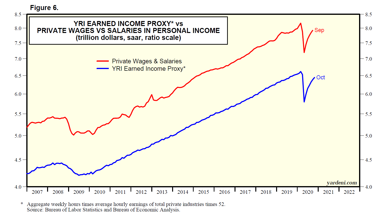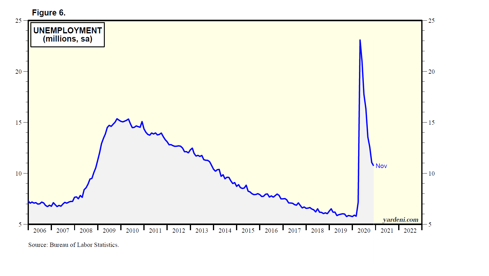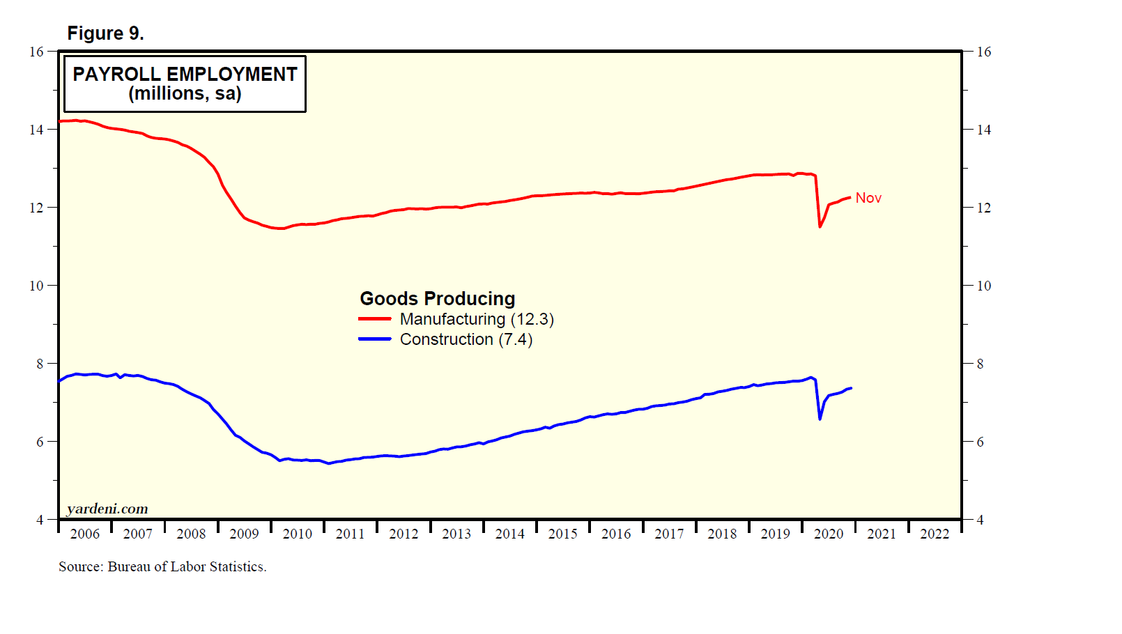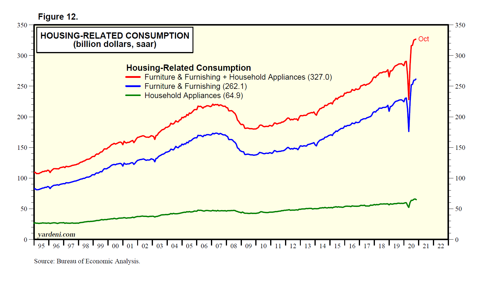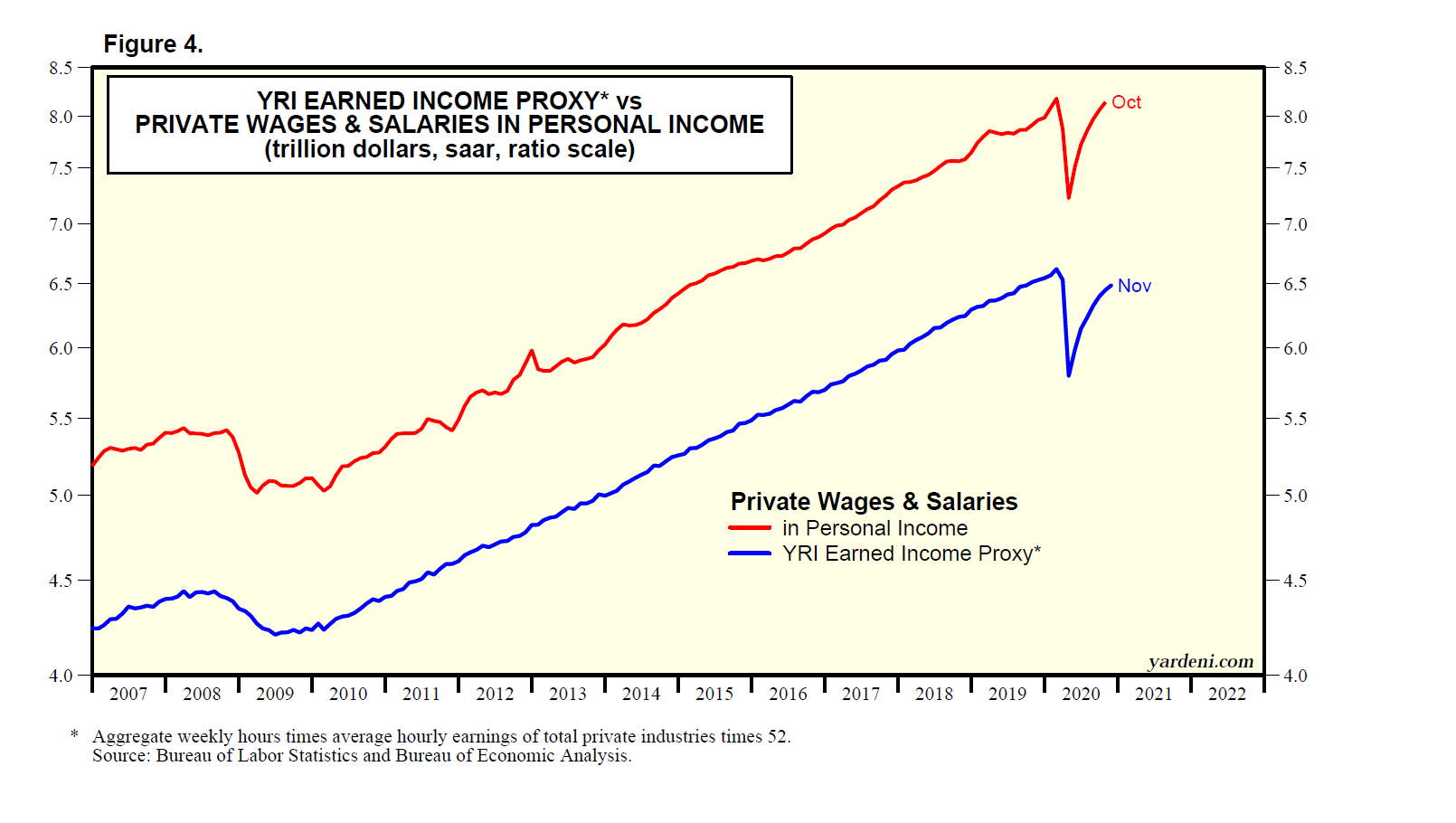 We also raised our real GDP forecast yesterday to 10% (saar) during Q4-2020 to reflect the strength in the Atlanta Fed’s GDPNow tracking model (currently showing 11.2%). We lowered our outlook for the first half of 2021 to reflect renewed lockdown restrictions during the third wave of the pandemic. We boosted the second half’s growth rates, assuming that widespread vaccinations during the first half will boost the lagging service providers significantly starting next summer. (See YRI Economic Forecasts.) As a result of our revisions, we see real GDP fully recovering by mid-2021 (Fig. 3).