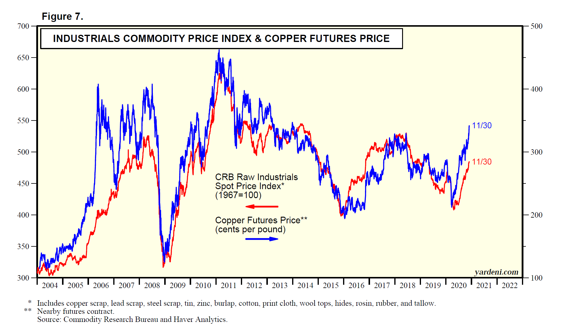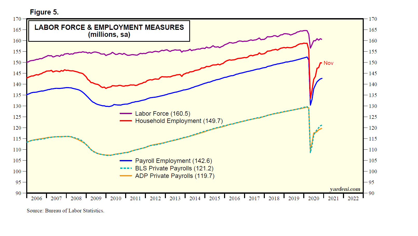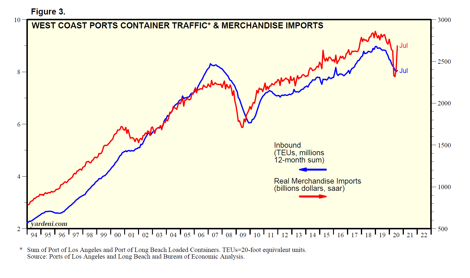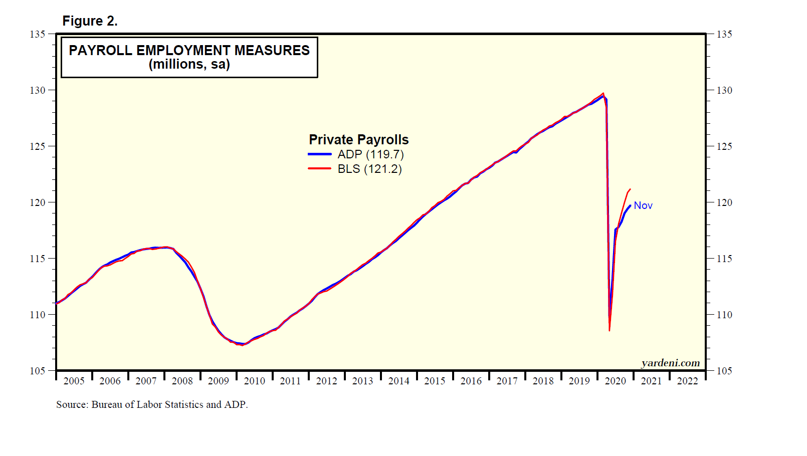 We also raised our real GDP forecast yesterday to 10% (saar) during Q4-2020 to reflect the strength in the Atlanta Fed’s GDPNow tracking model (currently showing 11.2%). We lowered our outlook for the first half of 2021 to reflect renewed lockdown restrictions during the third wave of the pandemic. We boosted the second half’s growth rates, assuming that widespread vaccinations during the first half will boost the lagging service providers significantly starting next summer. (See YRI Economic Forecasts.) As a result of our revisions, we see real GDP fully recovering by mid-2021 (Fig. 3).