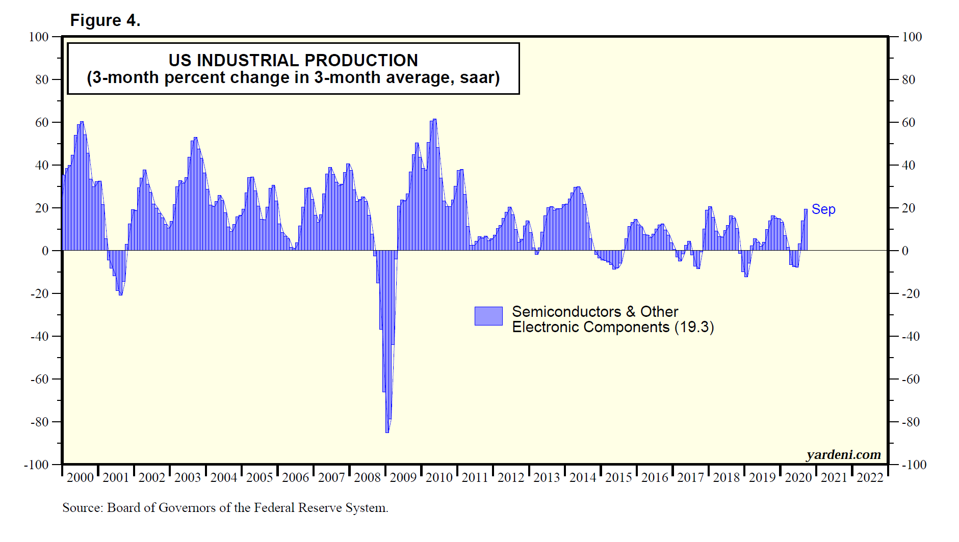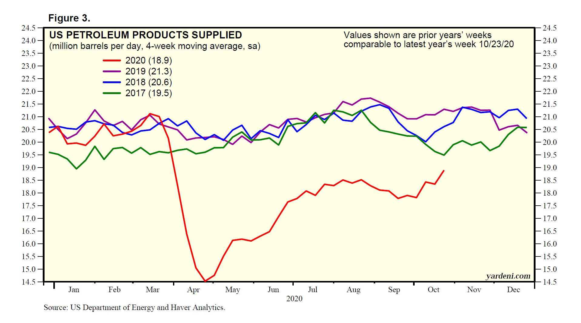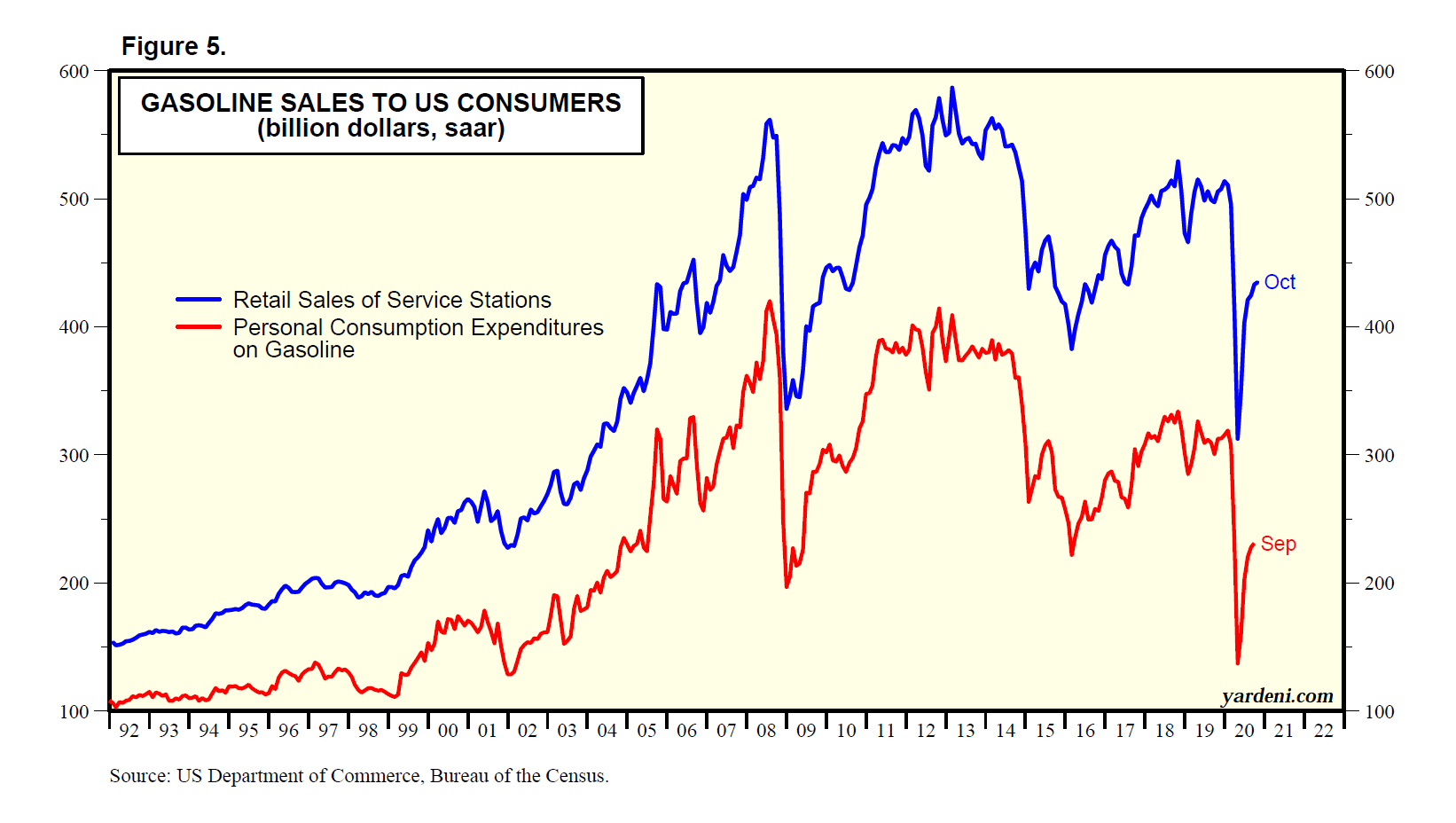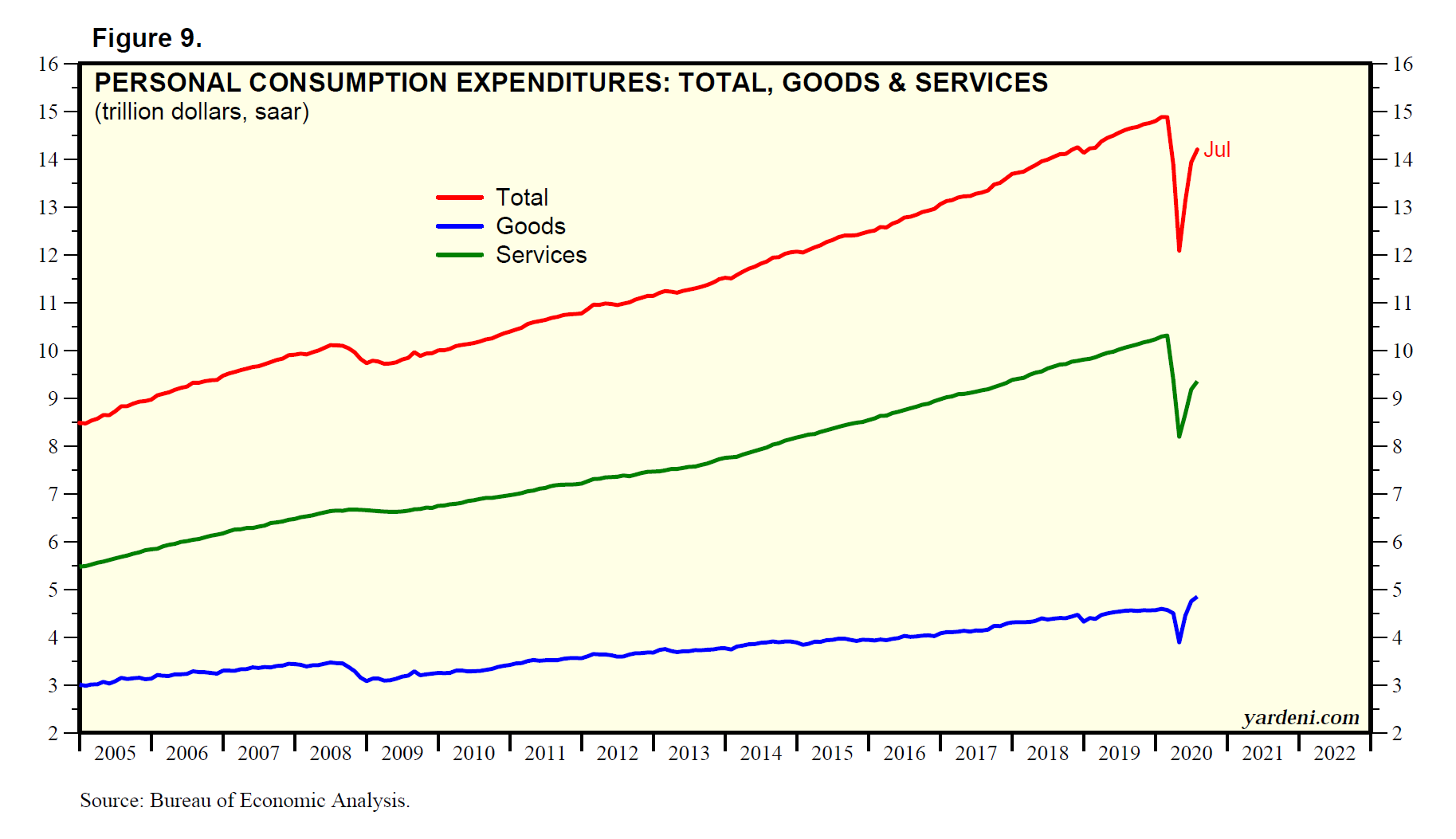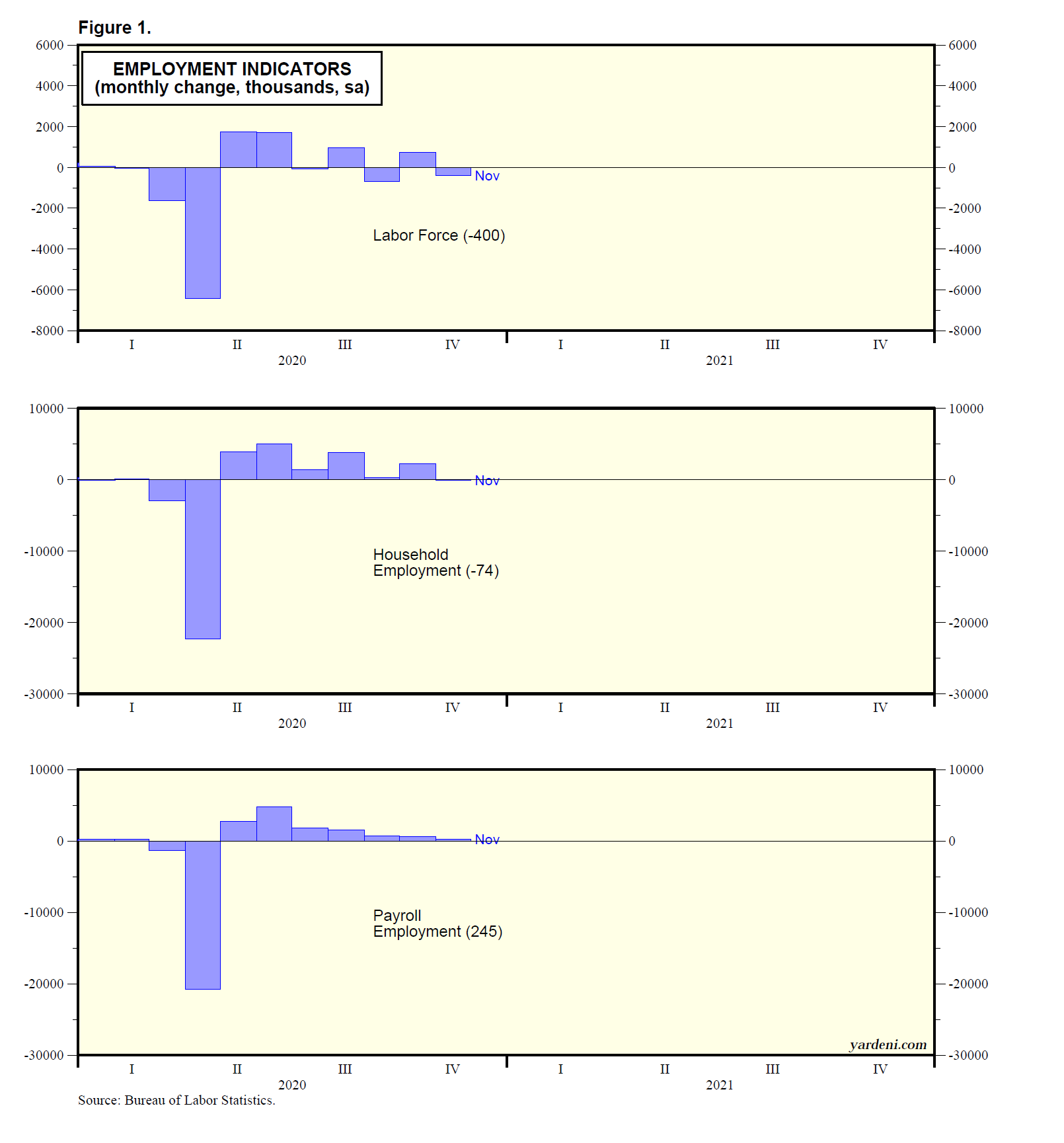 We also raised our real GDP forecast yesterday to 10% (saar) during Q4-2020 to reflect the strength in the Atlanta Fed’s GDPNow tracking model (currently showing 11.2%). We lowered our outlook for the first half of 2021 to reflect renewed lockdown restrictions during the third wave of the pandemic. We boosted the second half’s growth rates, assuming that widespread vaccinations during the first half will boost the lagging service providers significantly starting next summer. (See YRI Economic Forecasts.) As a result of our revisions, we see real GDP fully recovering by mid-2021 (Fig. 3).