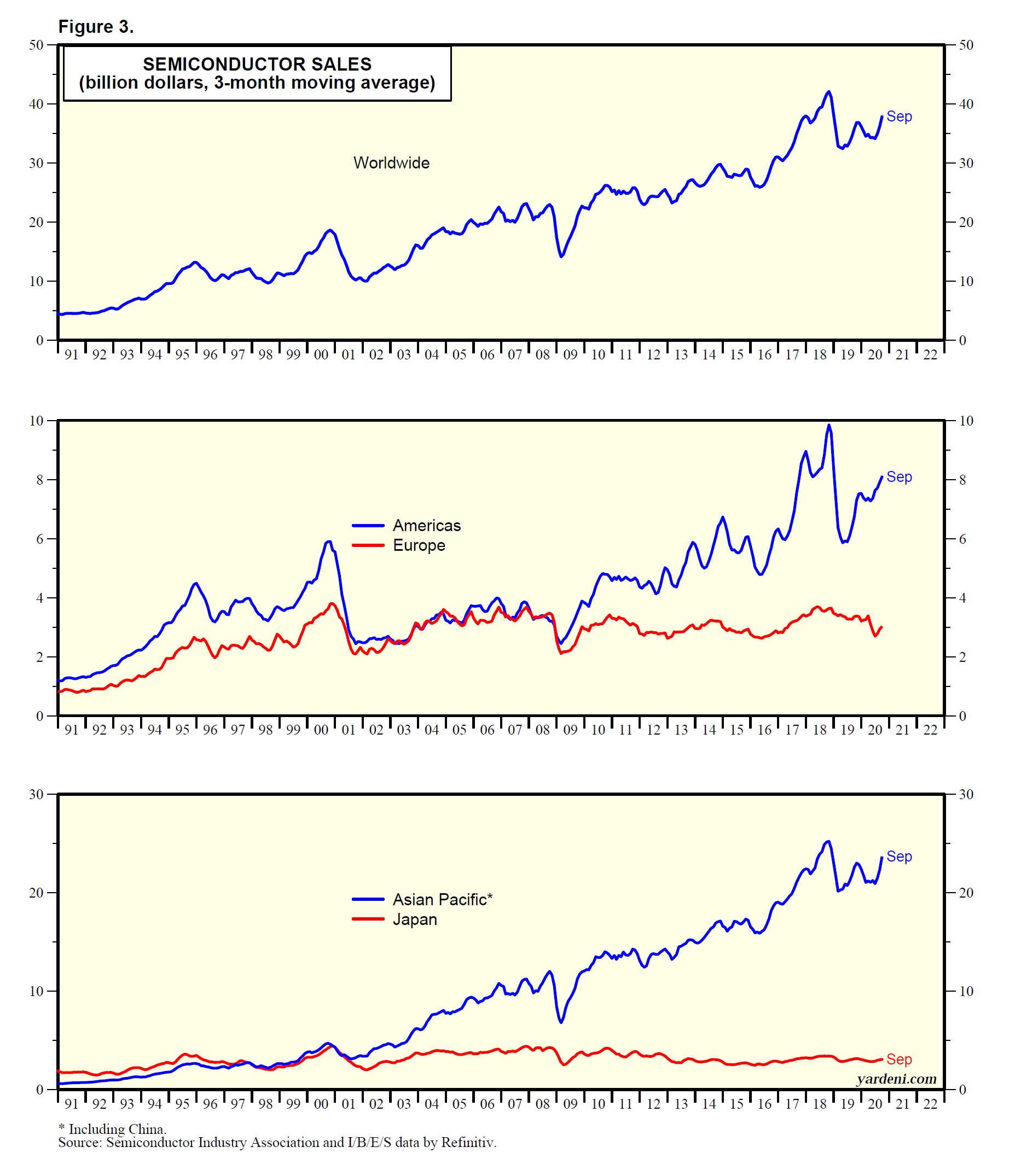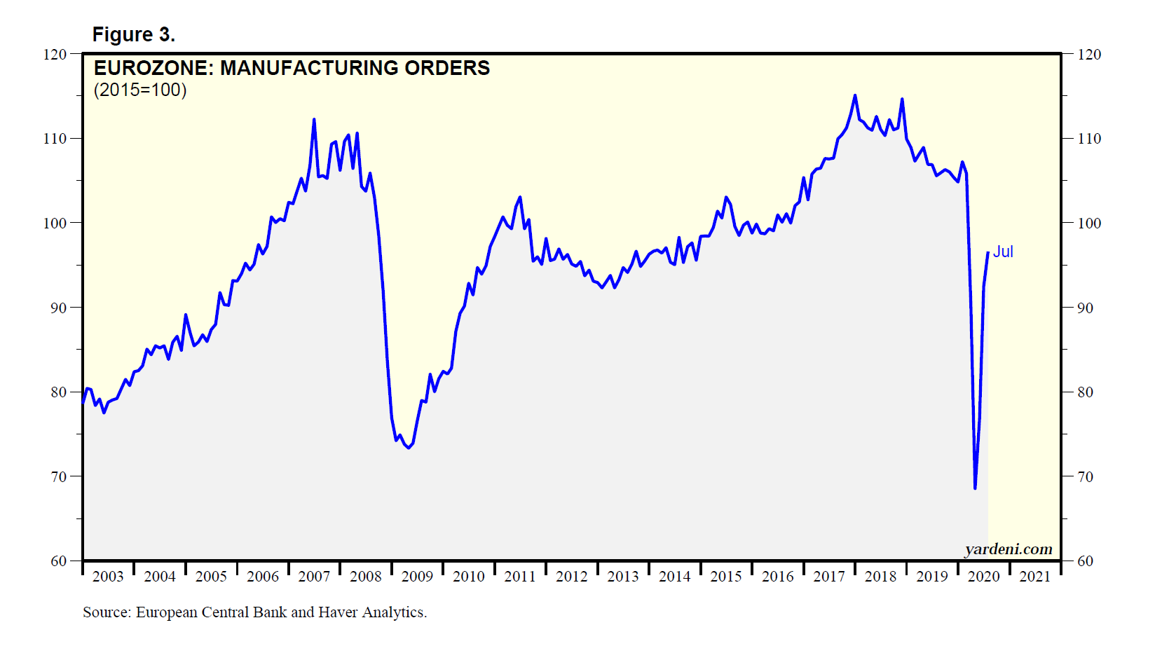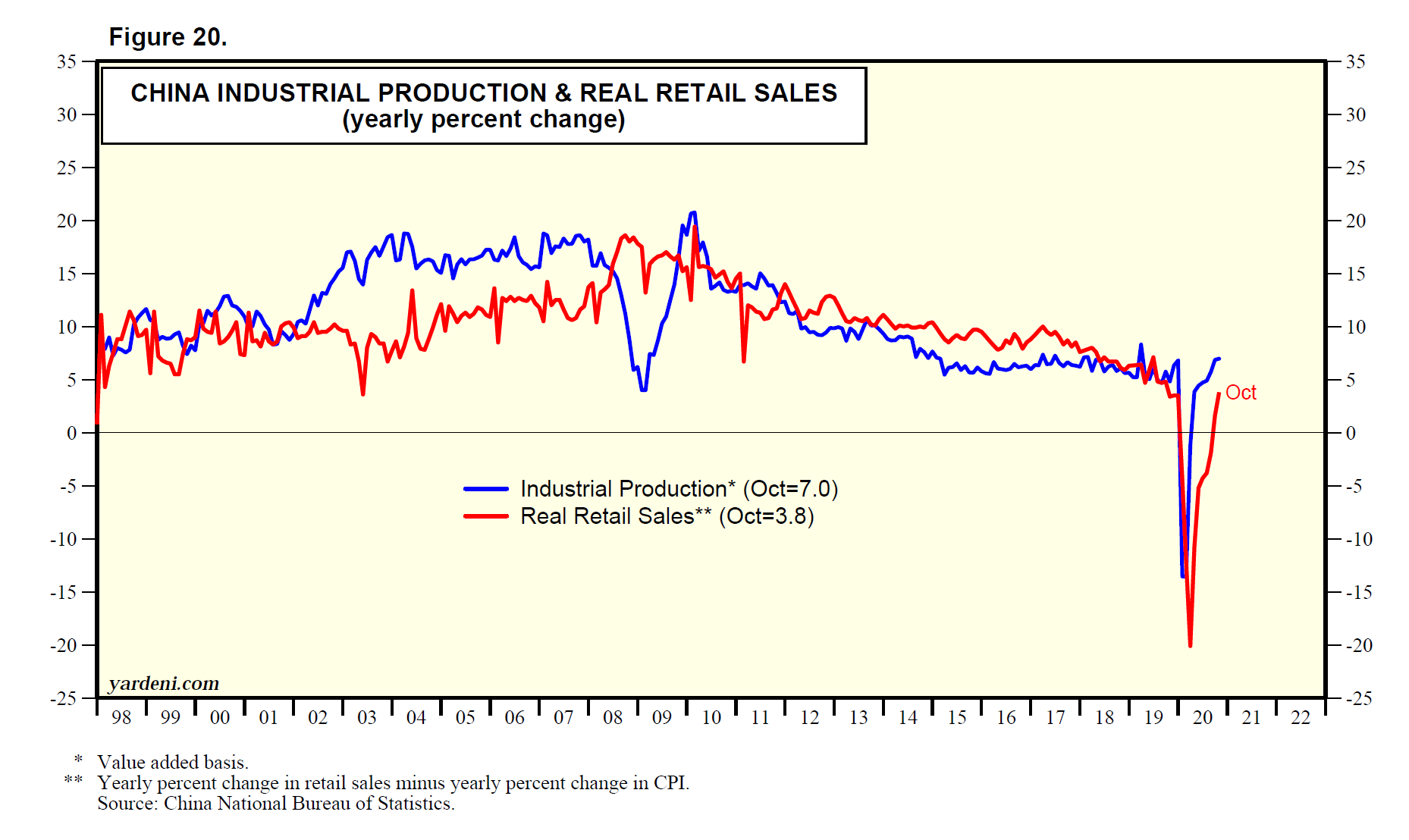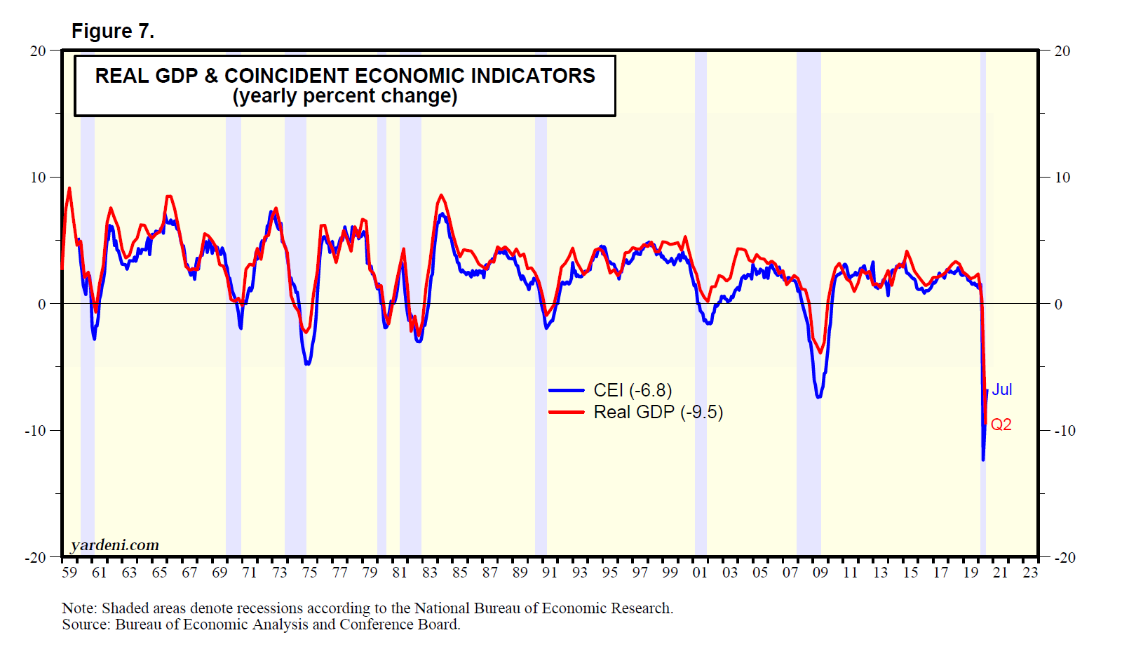 We also raised our real GDP forecast yesterday to 10% (saar) during Q4-2020 to reflect the strength in the Atlanta Fed’s GDPNow tracking model (currently showing 11.2%). We lowered our outlook for the first half of 2021 to reflect renewed lockdown restrictions during the third wave of the pandemic. We boosted the second half’s growth rates, assuming that widespread vaccinations during the first half will boost the lagging service providers significantly starting next summer. (See YRI Economic Forecasts.) As a result of our revisions, we see real GDP fully recovering by mid-2021 (Fig. 3).