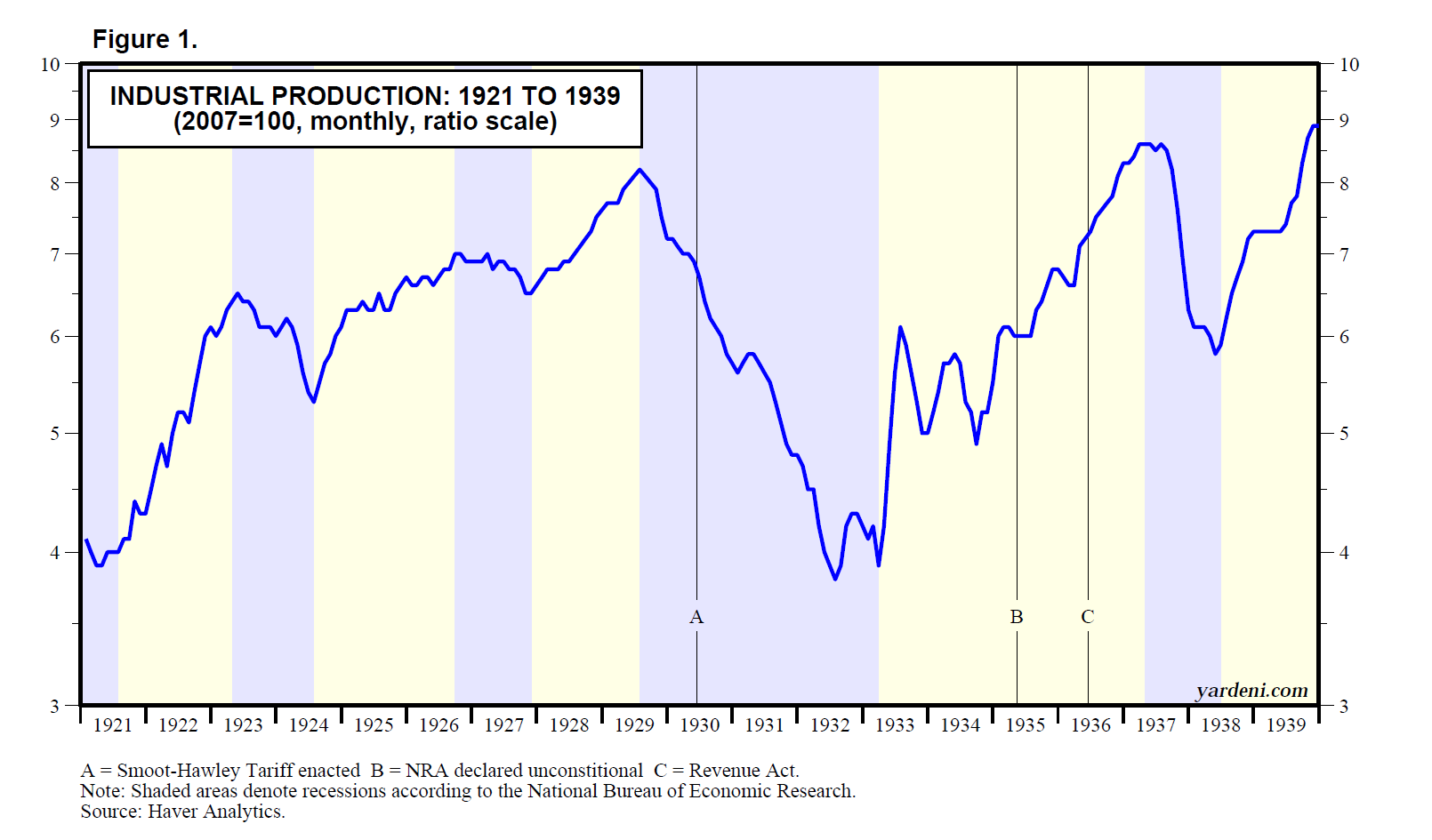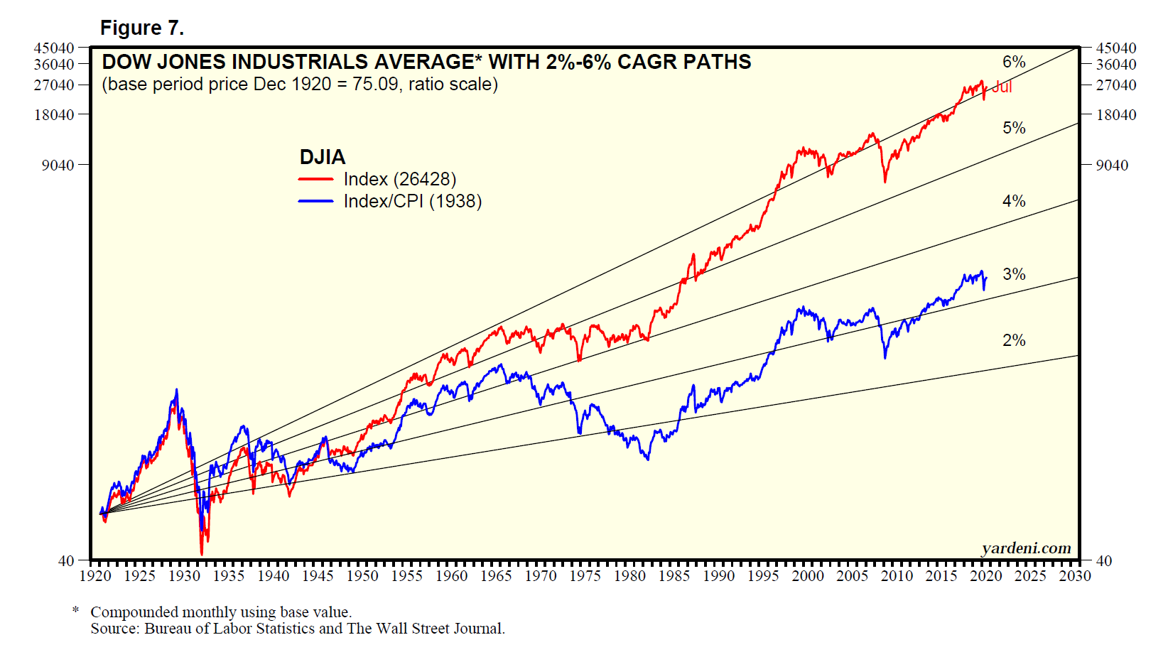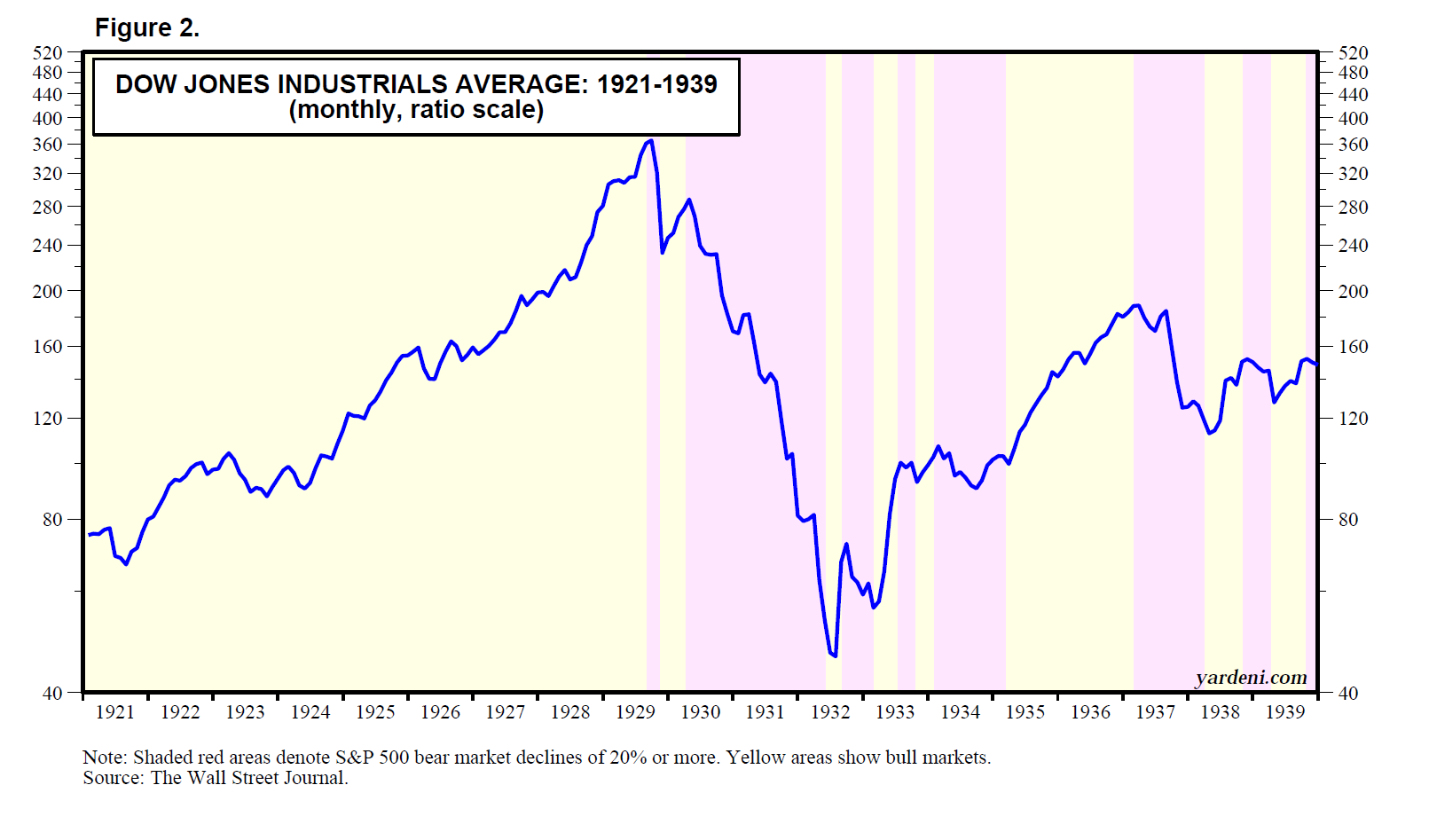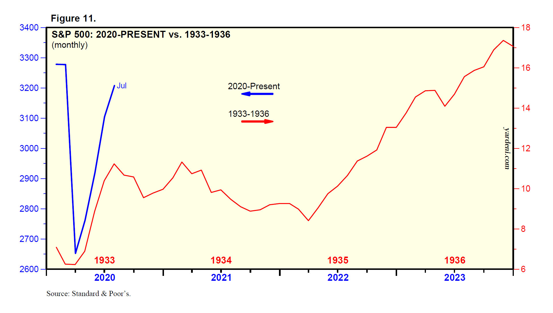 So the Roaring ’20s remains a viable scenario. The problem is that that decade was followed by the Great Depression of the 1930s; if history repeats that pattern, we can party for another 10 years. Then again, it’s hard to imagine another decade ahead that is as bullish as the previous Roaring ’10s. The S&P 500 is now up 378% since the start of the bull market in March 2009 (Fig. 2). This is currently the second best bull market since the late 1920s. In first place still is the bull market of the 1990s, with a gain of 582% in the S&P 500. (See S&P 500 Bull Markets Since 1928.) By the way, the available monthly average data show that the S&P 500 rose 340% during the Roaring ‘20s (Fig. 3).