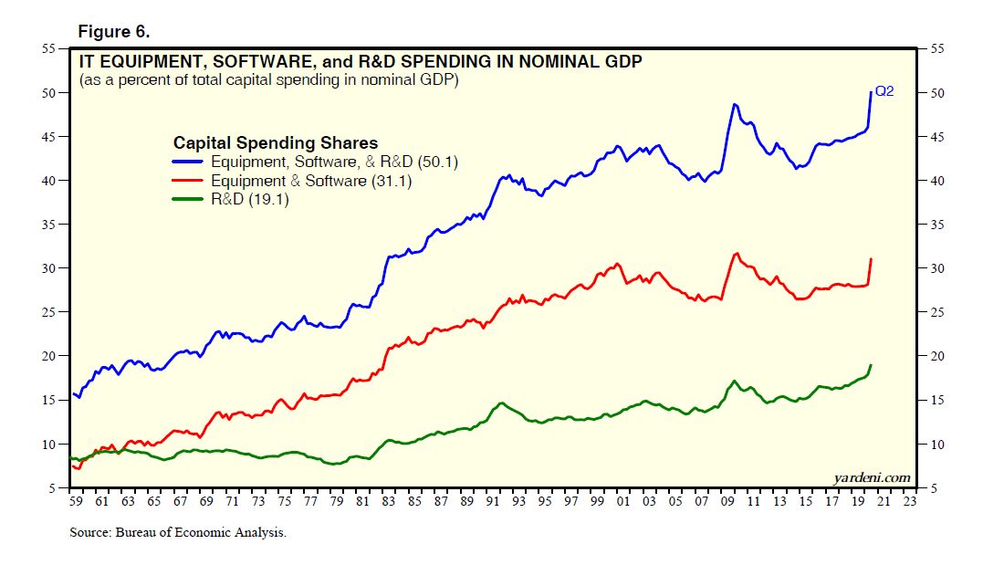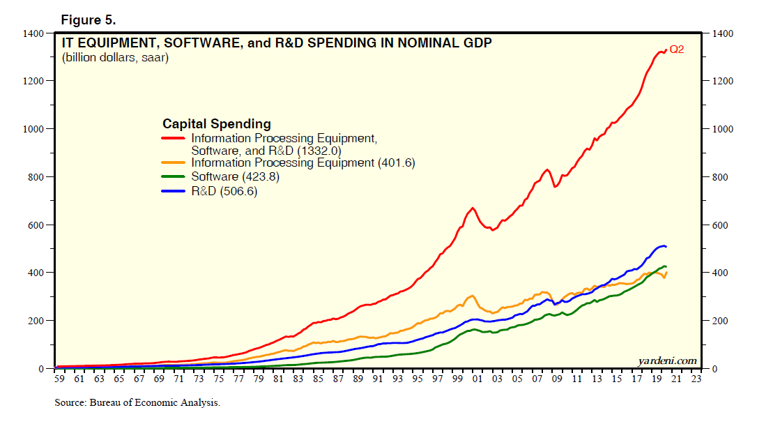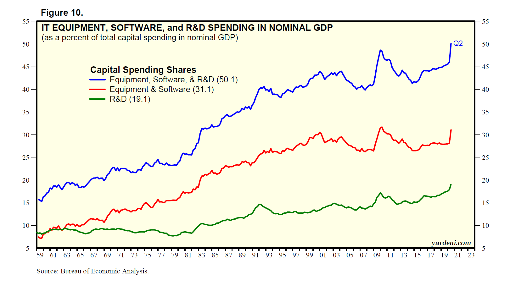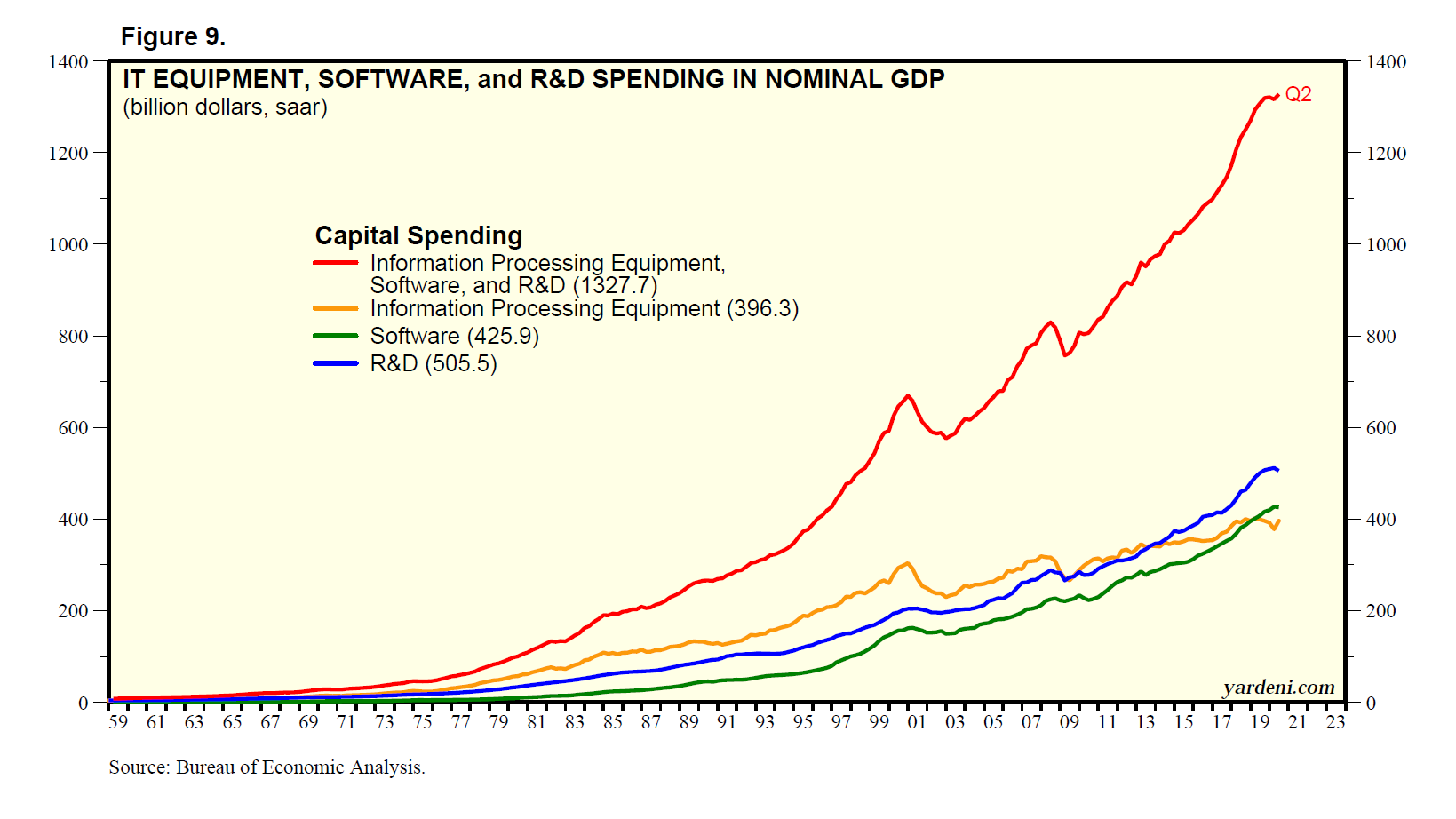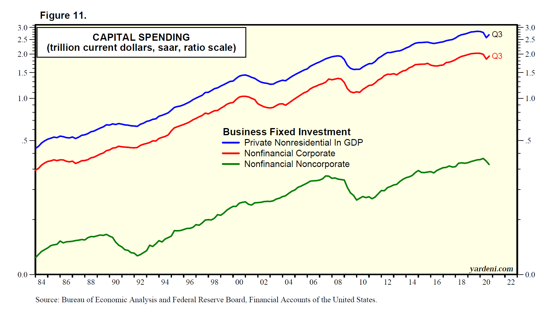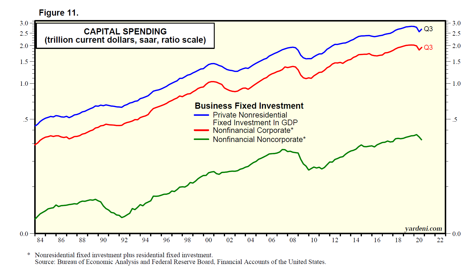 Corporate Finance IV: Capital Spending. Just as impressive is the rebound in current-dollar capital spending, which not surprisingly tracks corporate cash flow closely. This is particularly so for nonfinancial corporate cash flow versus nonfinancial corporate capital spending, both using data compiled by the Fed (Fig. 10). Nonfinancial corporate capital spending accounts for most of nonresidential fixed investment in the GDP accounts (Fig. 11). The latter has been trending higher in record-high territory since Q4-2011. In current dollars and real dollars, it has increased 68% and 58% since the start of the expansions during Q4-2009 through Q3-2020, and both rebounded 5.1% q/q (not annualized) during that quarter, regaining most of the losses during the lockdown recession.