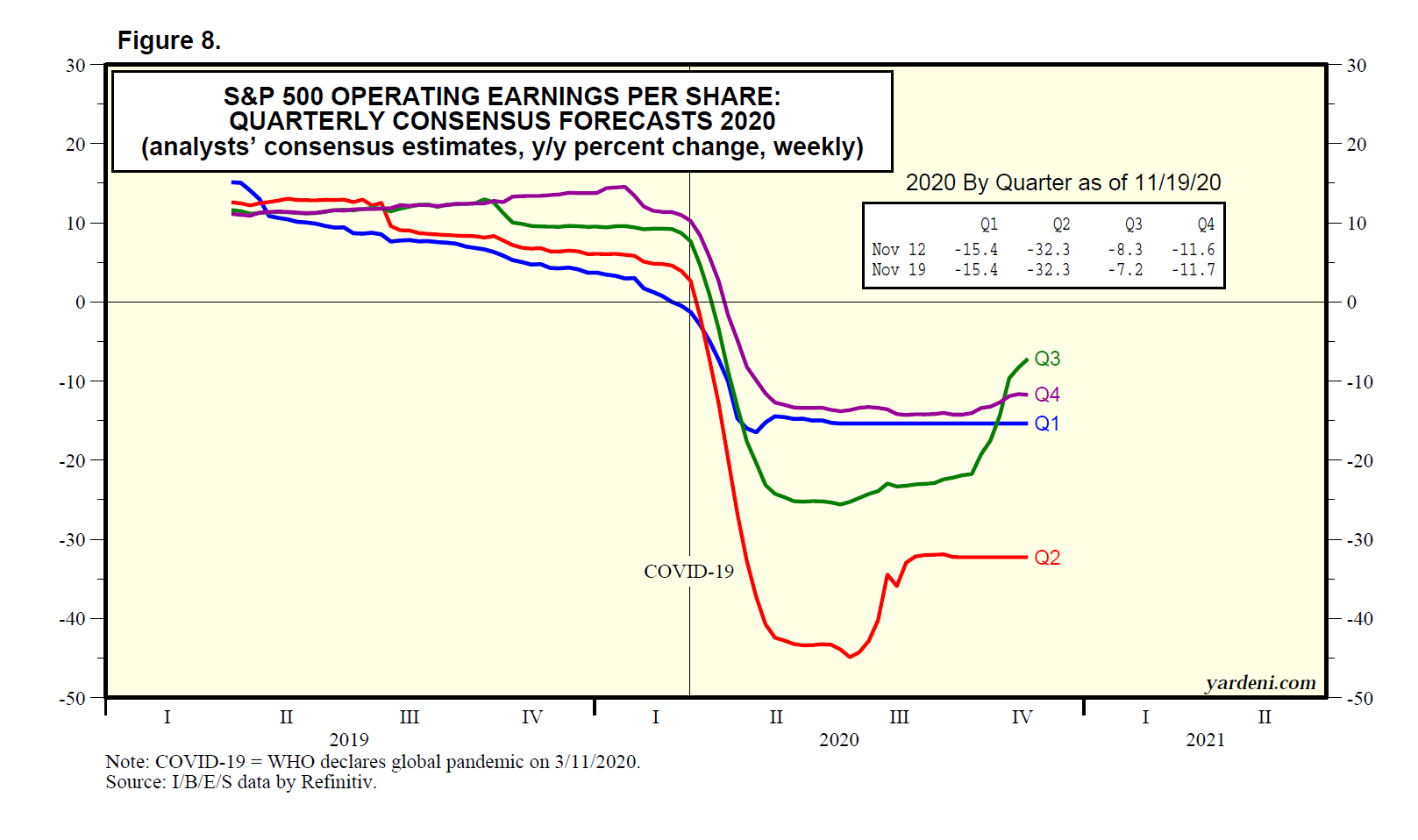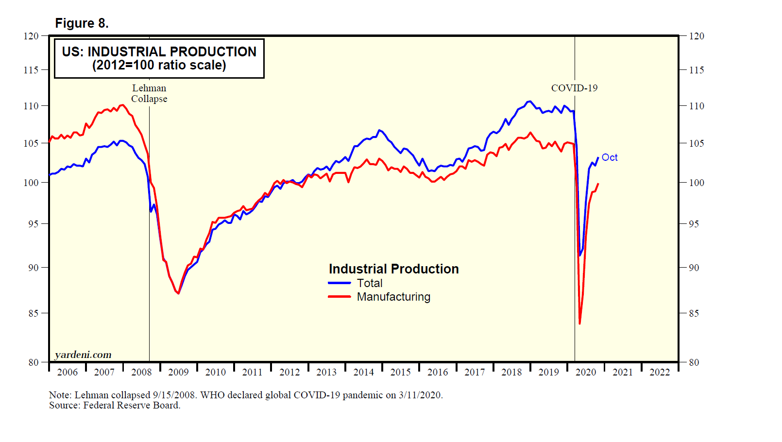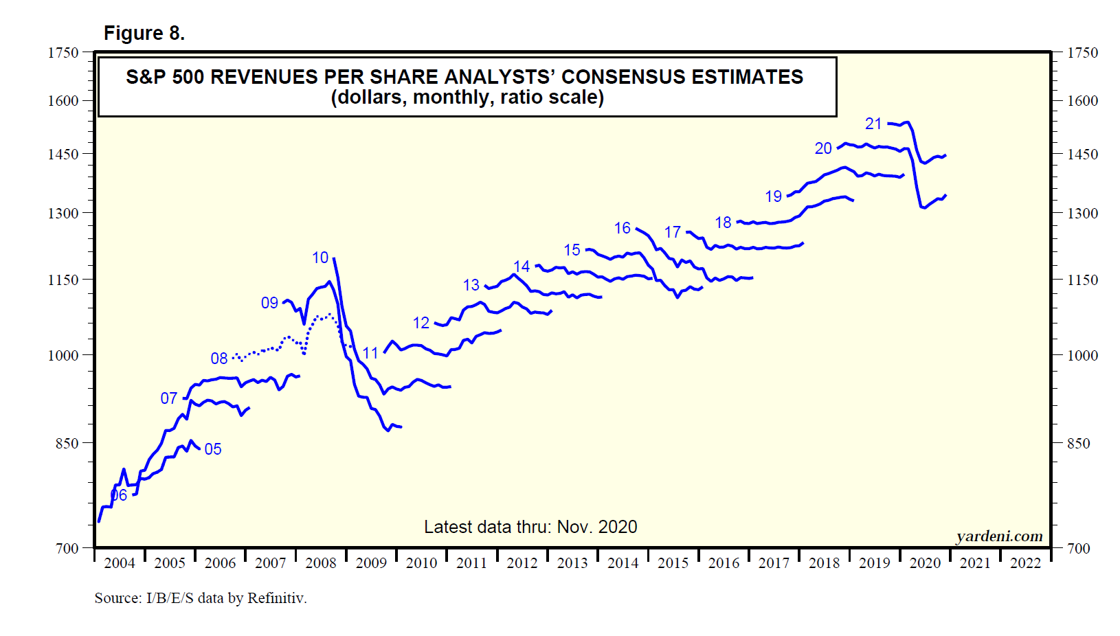 As a result, we are also raising our forecasts for S&P 500 revenues per share for 2020, 2021, and 2022 to $1,400 (still down 1.1% y/y), $1,545 (up 10.4%) and $1,625 (up 5.2%) (Fig. 7). During the December 3 week, industry analysts were projecting $1,335, $1,449, and $1,549. Both our and the analysts’ revenue scenarios would represent unusually strong rebounds from the pandemic-depressed levels earlier this year—especially compared to the more modest revenue rebound following the Great Financial Crisis (GFC) (Fig. 8). (See YRI S&P 500 Earnings Forecast.)