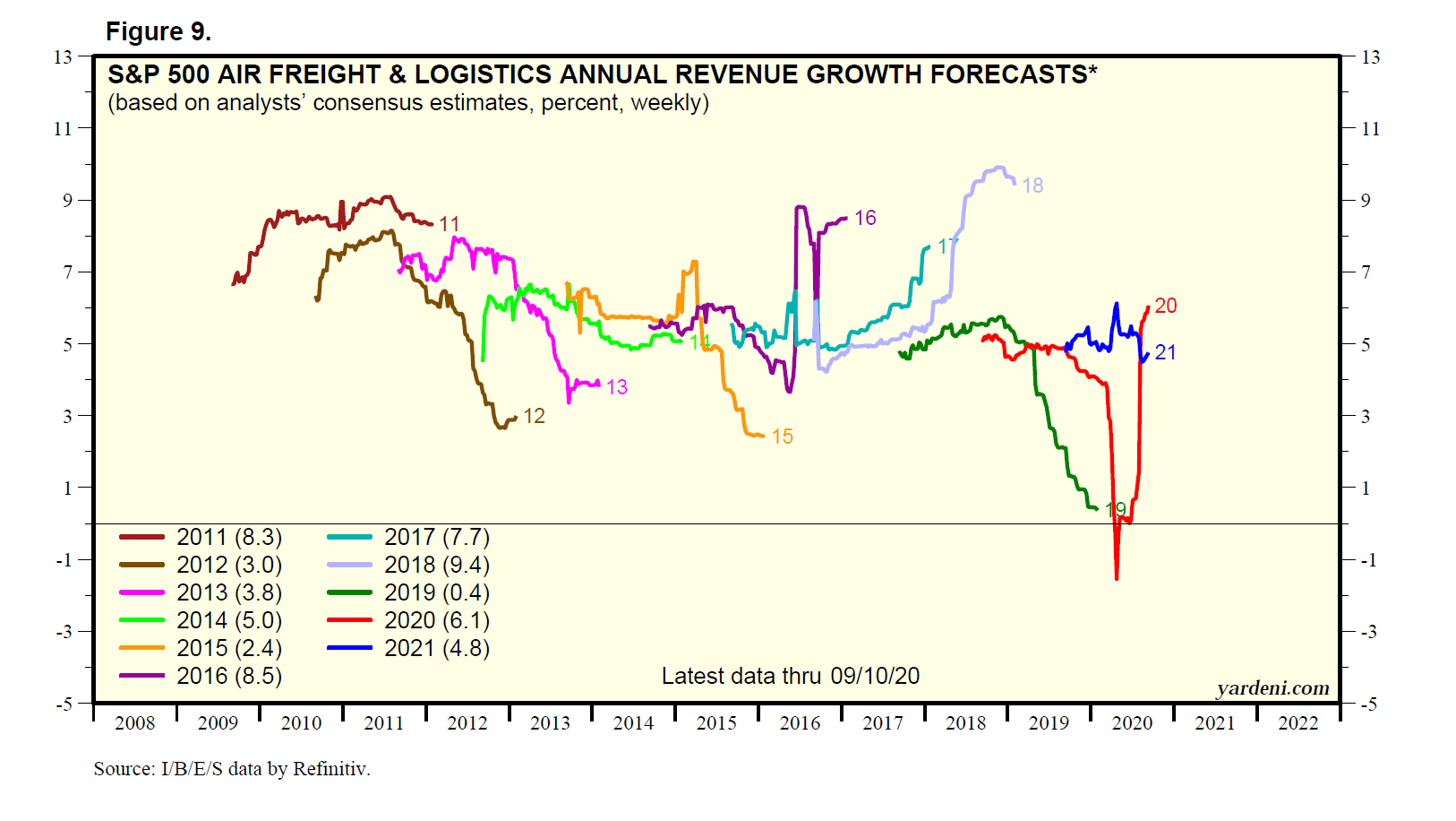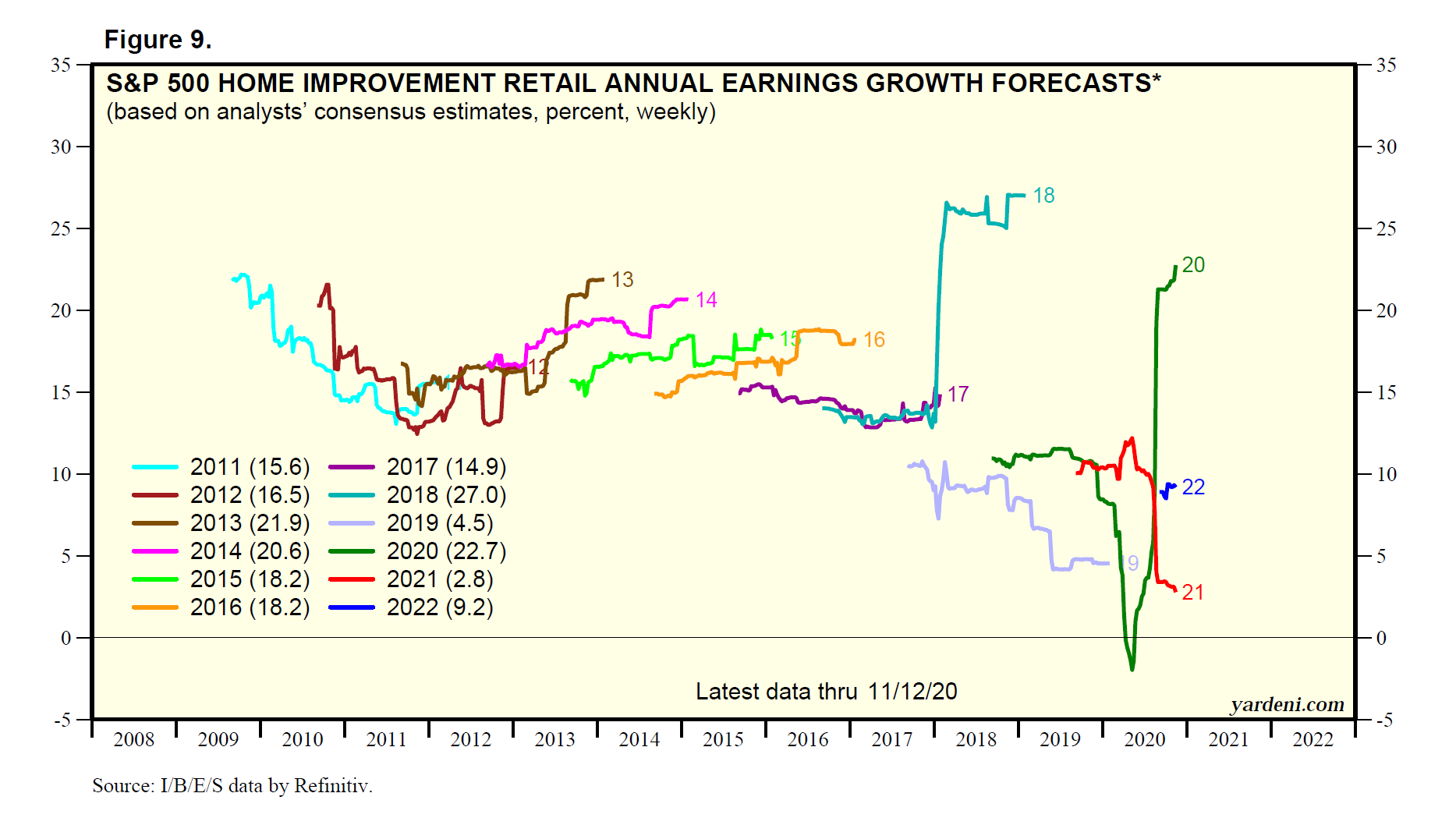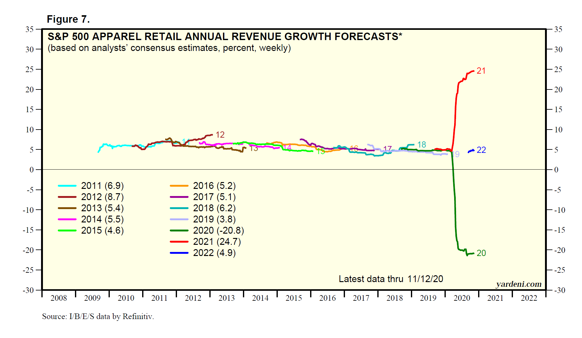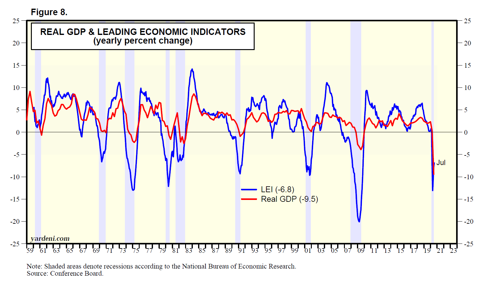 As a result, we are also raising our forecasts for S&P 500 revenues per share for 2020, 2021, and 2022 to $1,400 (still down 1.1% y/y), $1,545 (up 10.4%) and $1,625 (up 5.2%) (Fig. 7). During the December 3 week, industry analysts were projecting $1,335, $1,449, and $1,549. Both our and the analysts’ revenue scenarios would represent unusually strong rebounds from the pandemic-depressed levels earlier this year—especially compared to the more modest revenue rebound following the Great Financial Crisis (GFC) (Fig. 8). (See YRI S&P 500 Earnings Forecast.)