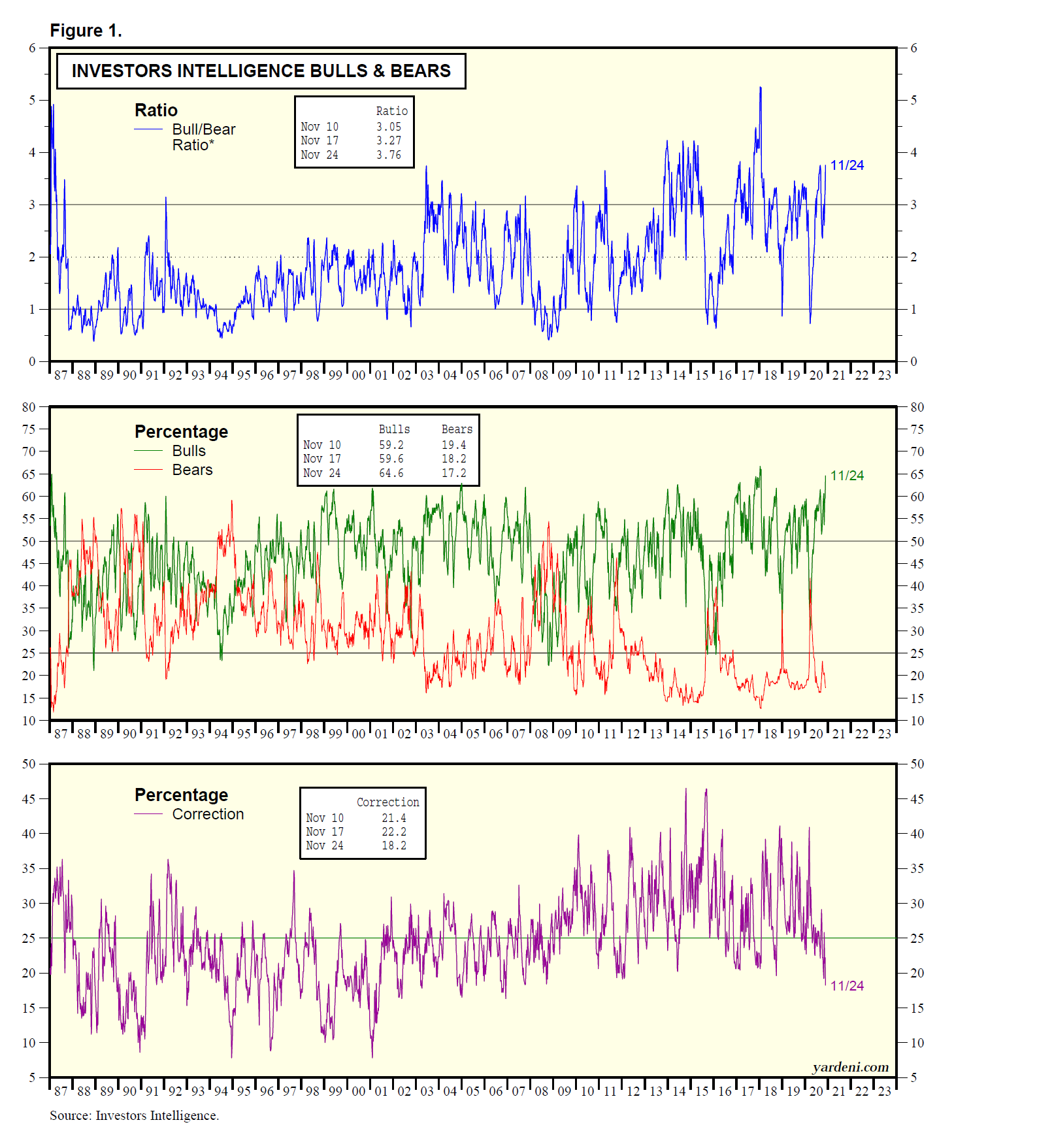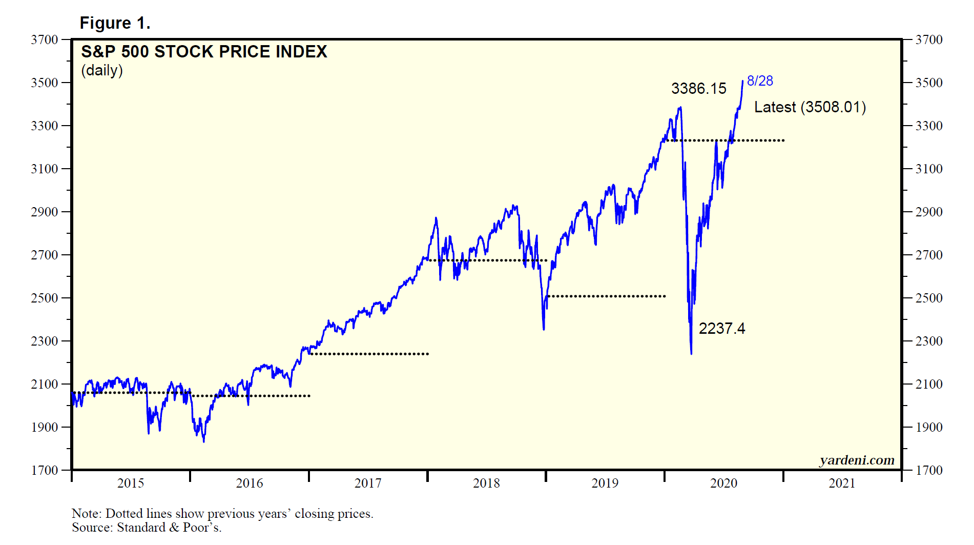 Strategy I: Infectious Bull. There are too many bulls. That’s often a contrary indicator suggesting that a correction, if not a bear market, is imminent. Occasionally, however, it has also confirmed that a meltup is underway (Fig. 1). That was the case in 1999. Ever since the S&P 500 rose above its February 19 record high to new record highs since August 18, Joe and I have been more concerned about a meltup than a correction or a bear market (Fig. 2).