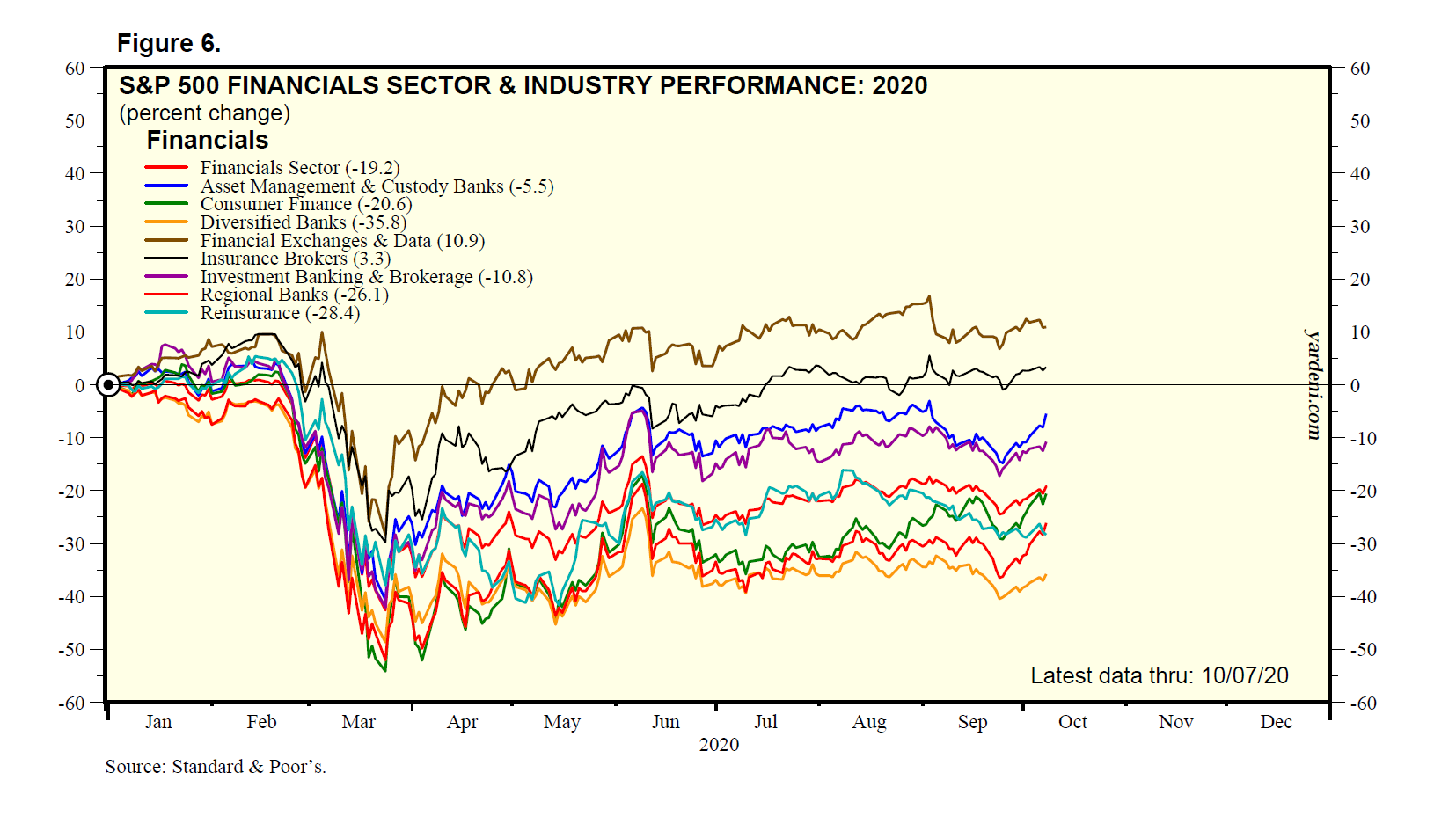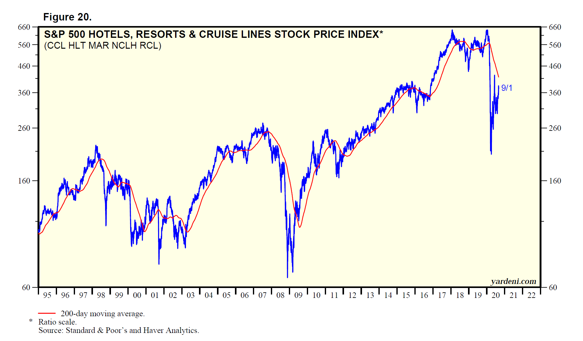 A look at the top-performing industries since September 2 also makes clear investors’ willingness to bet on an economic recovery. Here are the top 10 S&P 500 industries from September 2 through Tuesday’s close: Copper (49.4%), Apparel, Accessories & Luxury Goods (37.4), Real Estate Services (34.8), Automobile Manufacturers (33.4), Semiconductor Equipment (32.9), Oil & Gas Equipment & Services (28.3), Diversified Chemicals (28.3), Hotel & Resort REITs (27.1), Airlines (26.6), and Consumer Finance (26.3). Just missing the top ten cut off are Regional Banks (25.0%), Industrial Conglomerates (22.2), Hotels, Resorts & Cruise Lines (21.1), and Steel (19.2).
