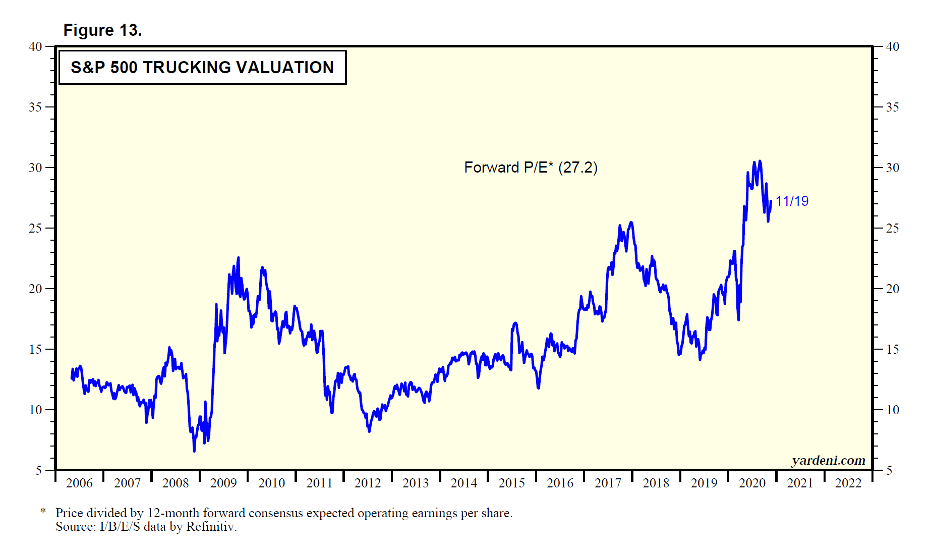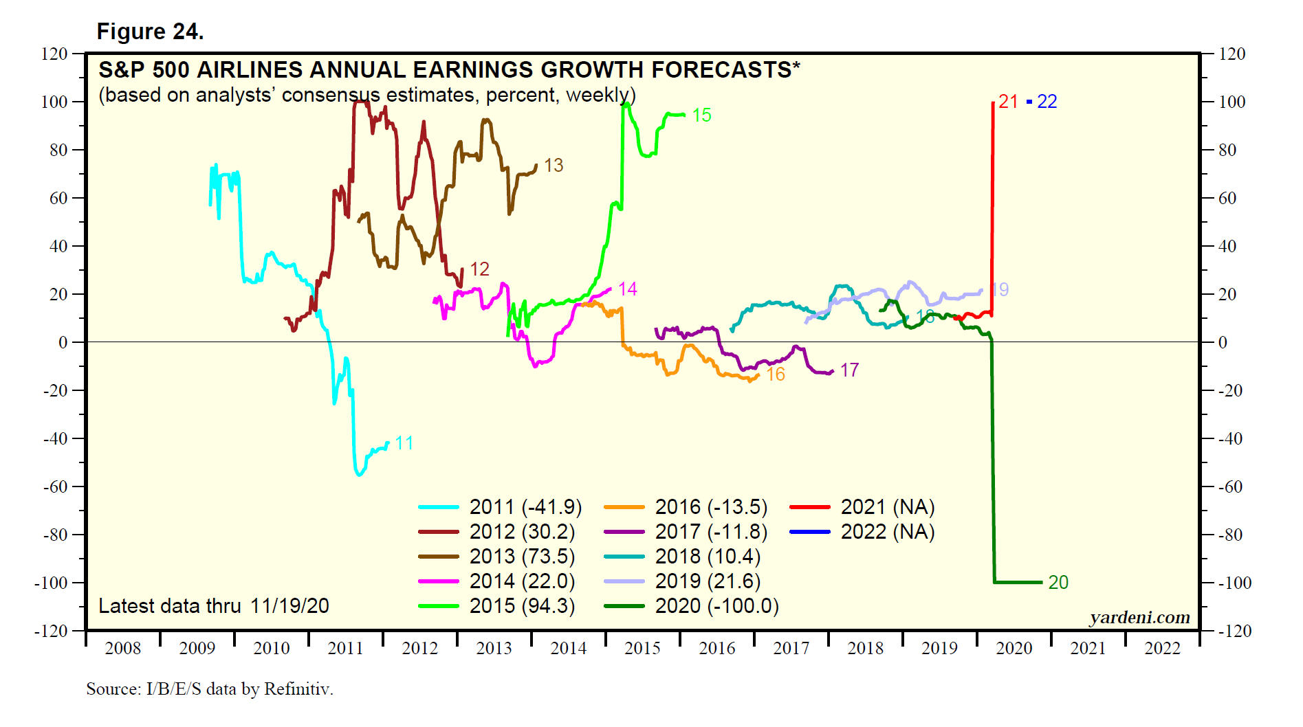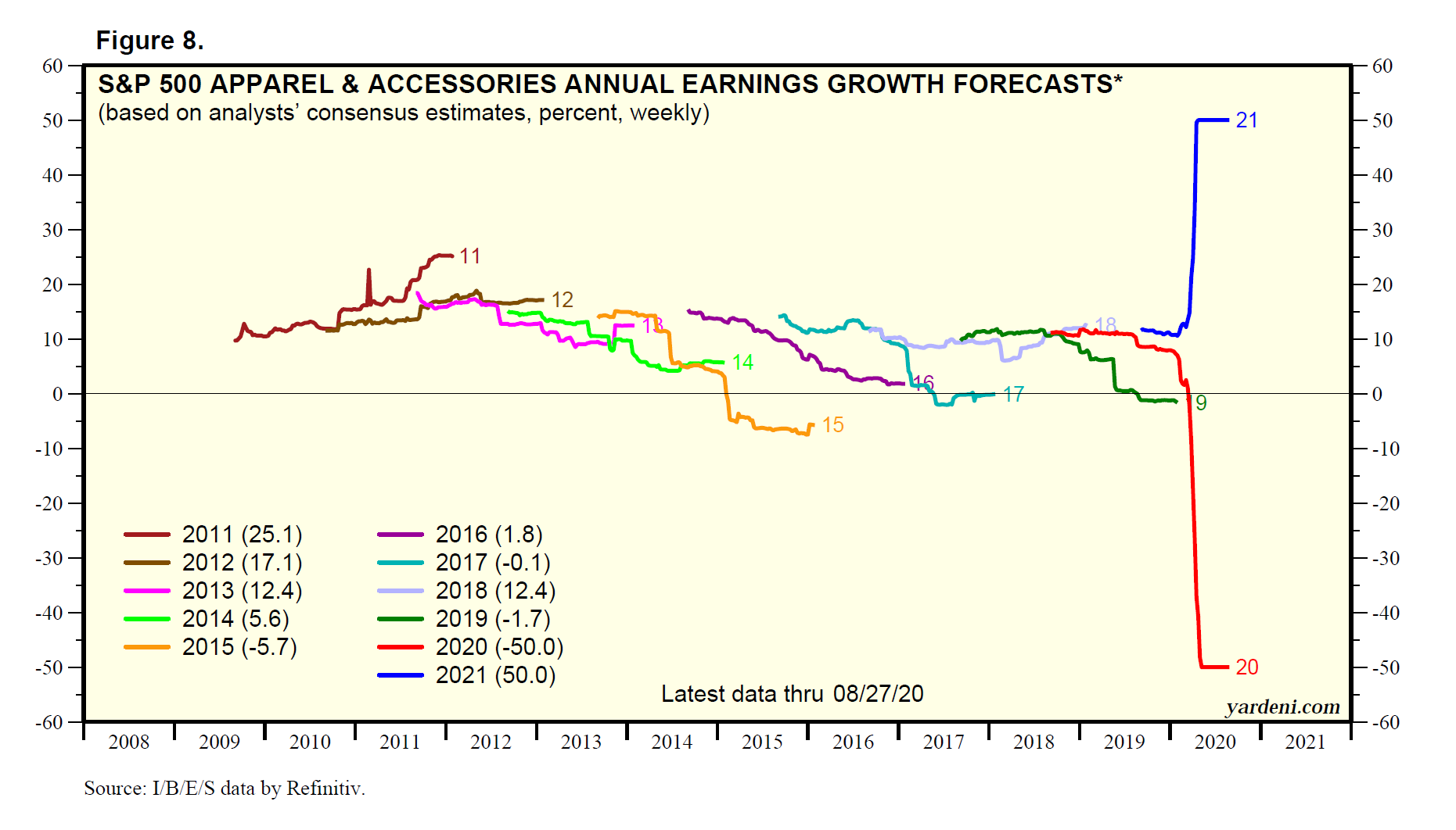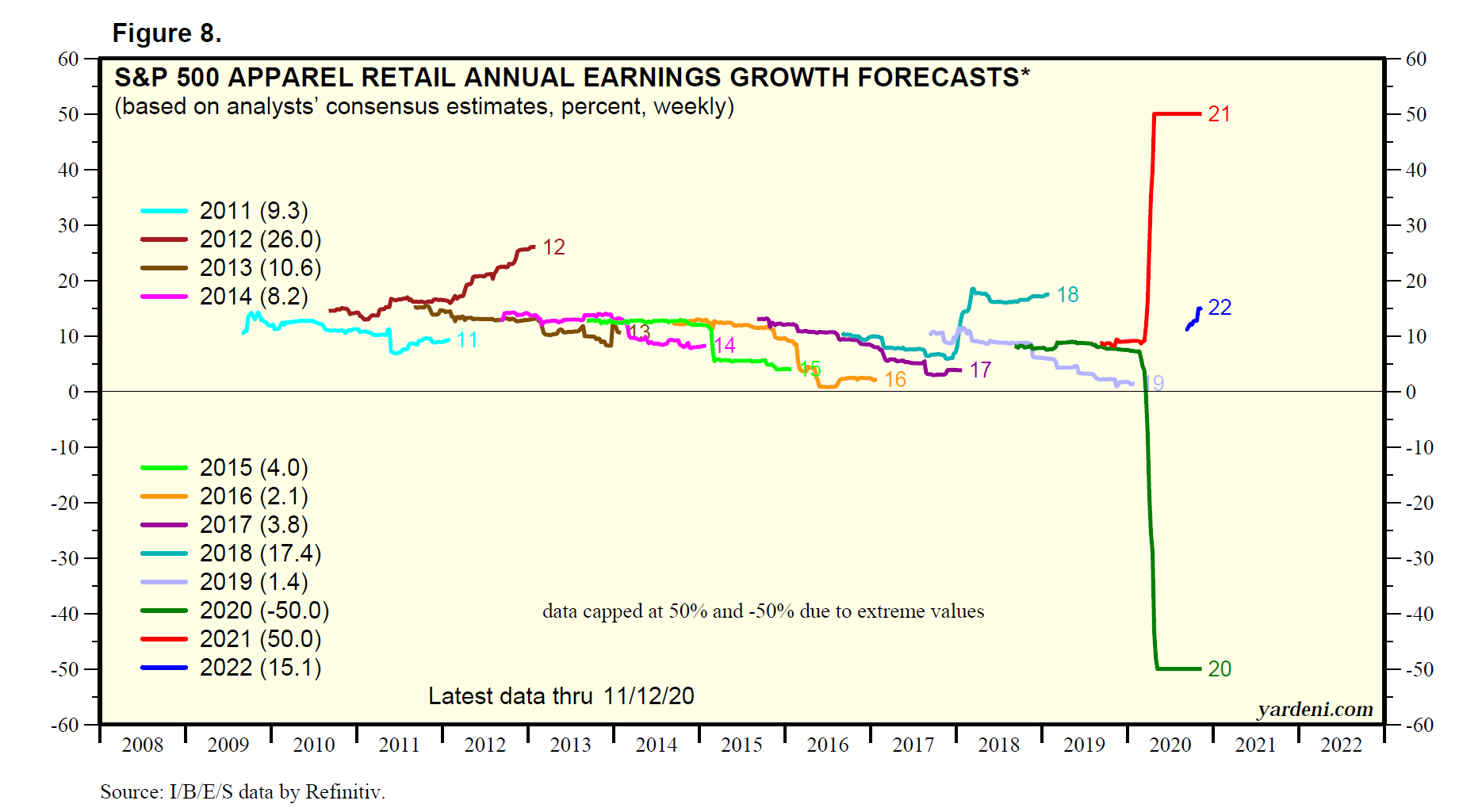 The industries with the fastest expected earnings growth in 2021 look a lot like the list of industries that have had the best stock performance since September 2: Apparel Retail (441.7%), Copper (262.3), Apparel & Accessories (228.4), Consumer Finance (145.4), Automobile Manufacturers (102.0), Reinsurance (87.9), Auto Parts & Equipment (86.4), Commodity Chemicals (69.3), Gold (68.1), and Restaurants (50.2).
