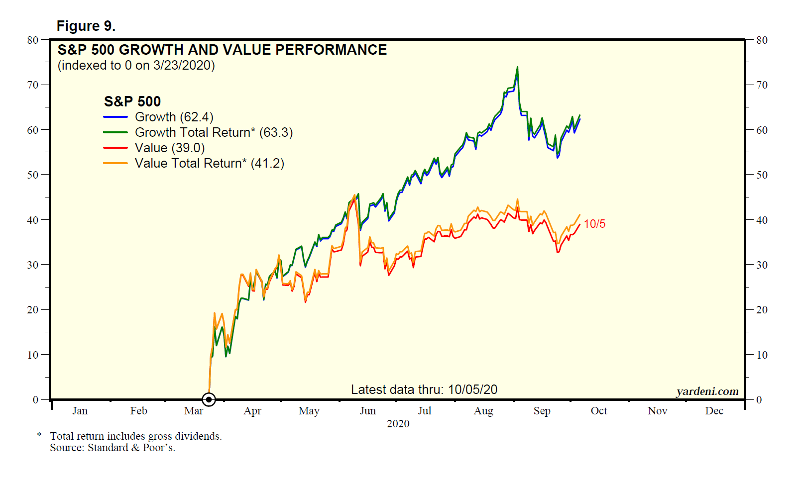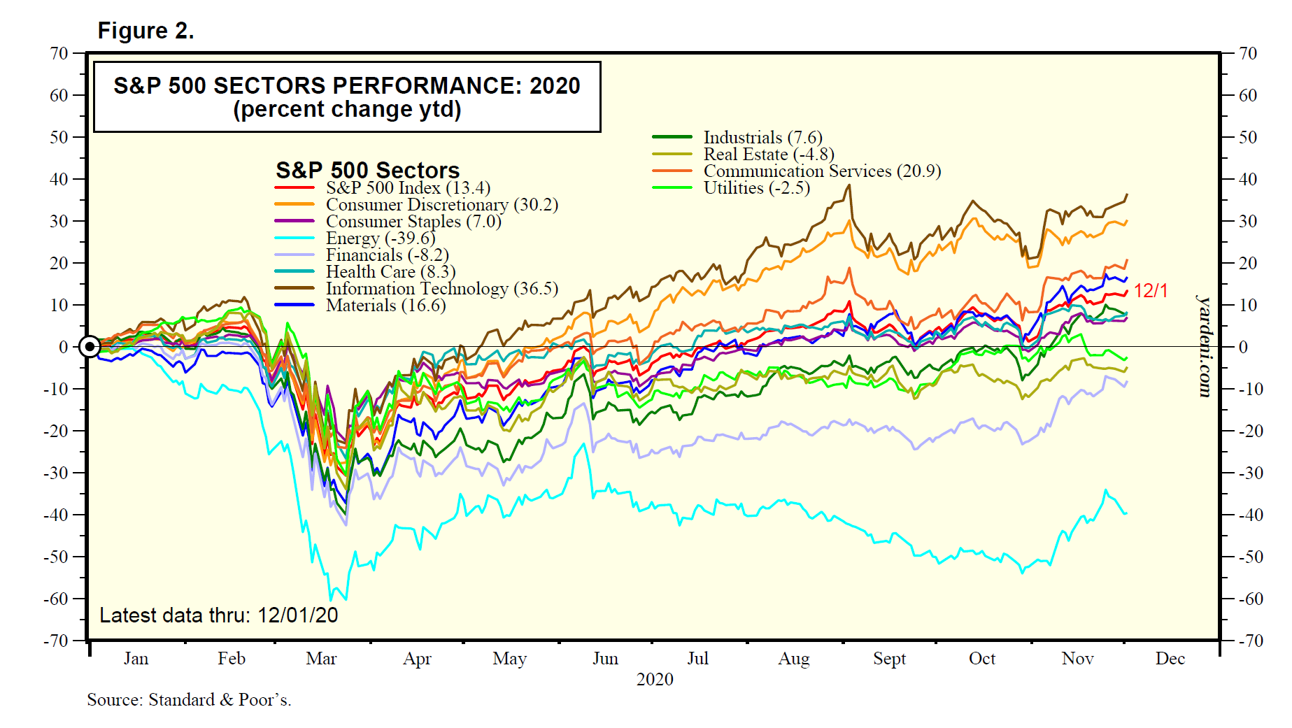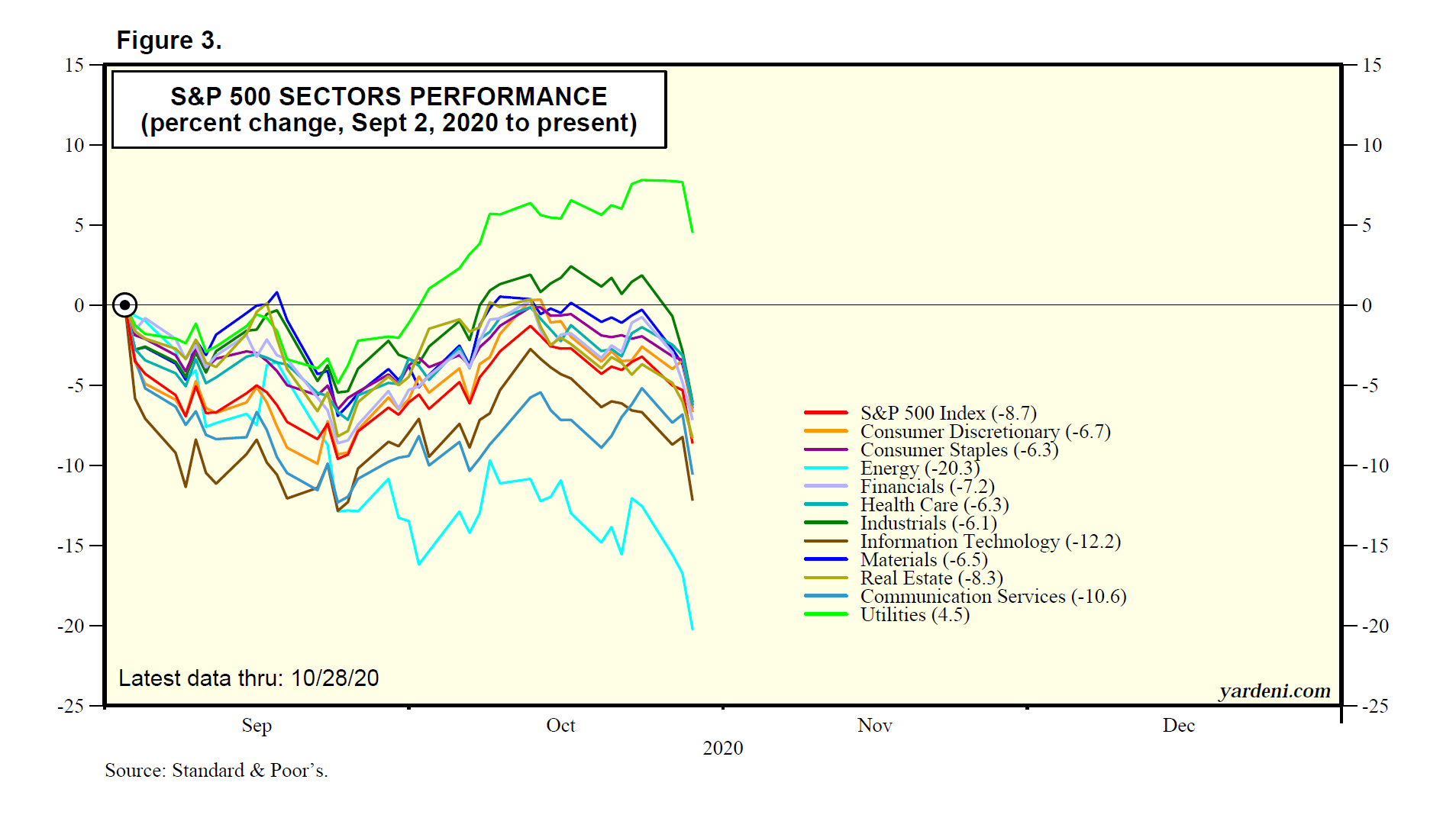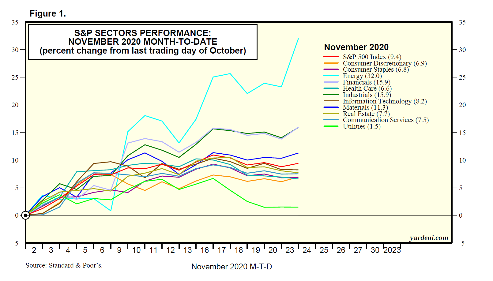 The market’s optimism since September 2 is apparent in the cyclical sectors that have dramatically outperformed the broader index. Here’s the S&P 500 performance derby from September 2 through Tuesday’s close: Energy (14.6%), Financials (12.1), Industrials (11.2), Materials (7.4), Utilities (4.3), S&P 500 (3.2), Communication Services (2.7), Health Care (2.2), Consumer Staples (0.7), Information Technology (-0.3), Consumer Discretionary (-0.3), and Real Estate (-1.4) (Table 1).