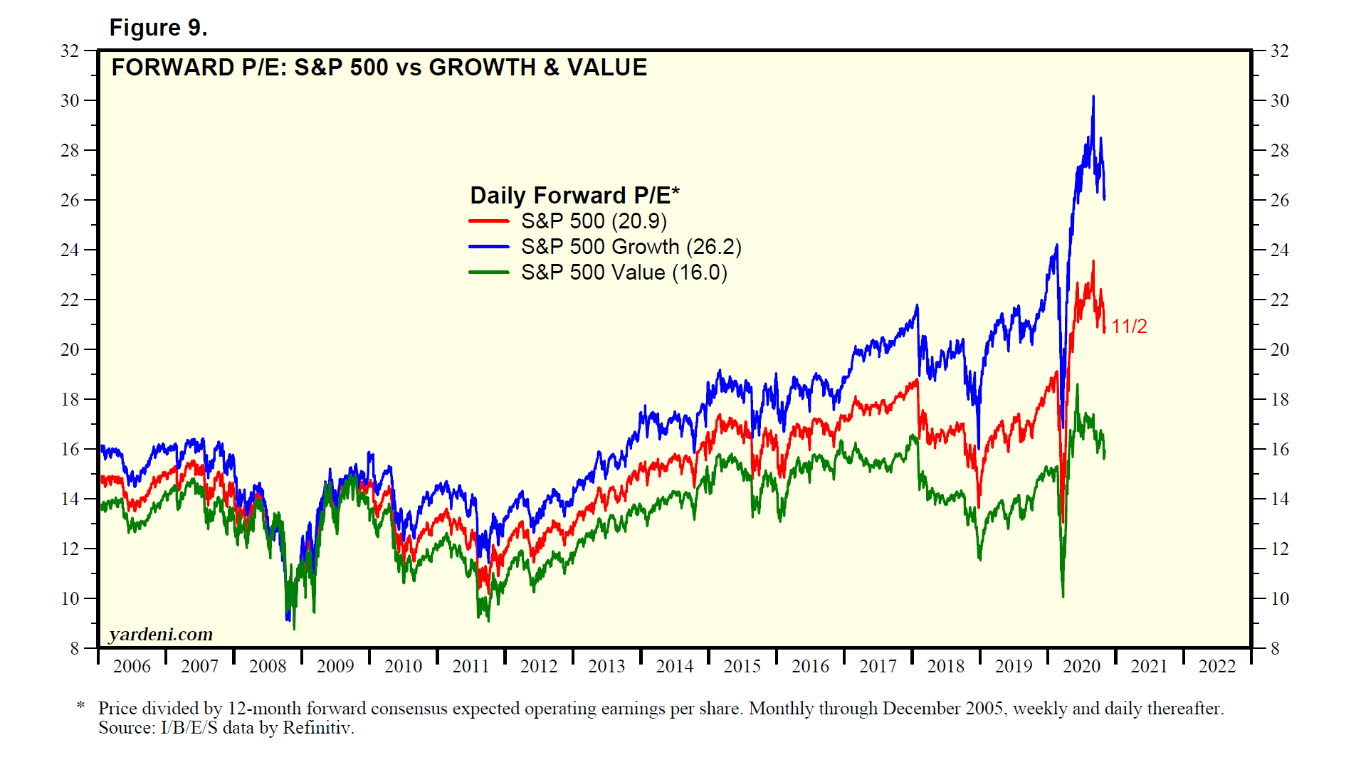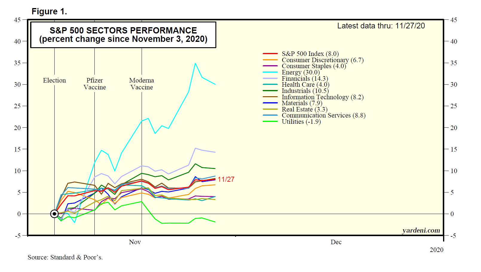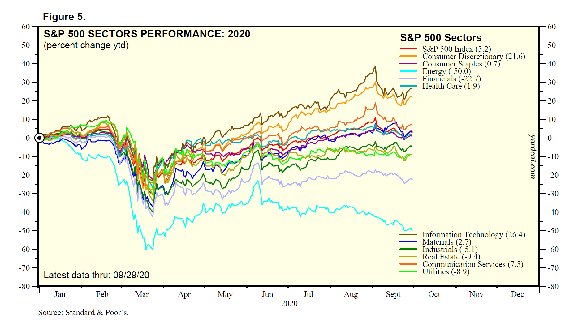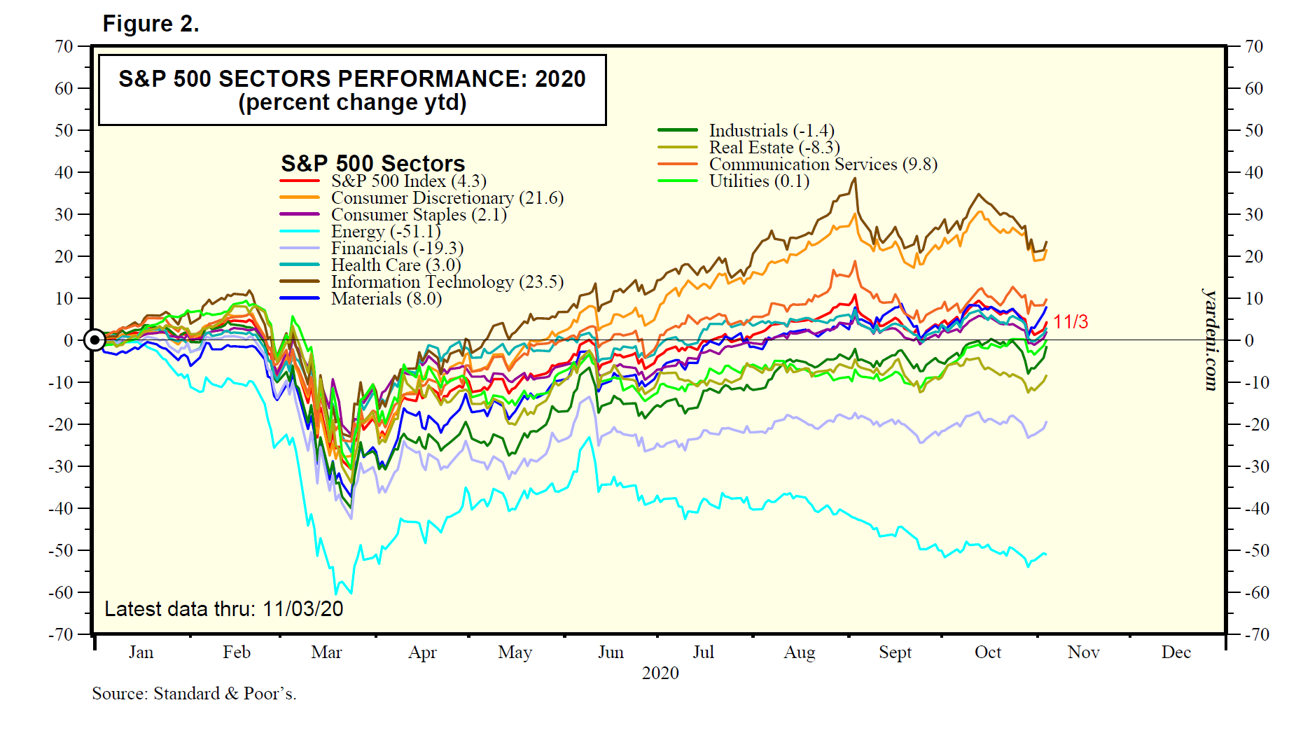 The market’s optimism since September 2 is apparent in the cyclical sectors that have dramatically outperformed the broader index. Here’s the S&P 500 performance derby from September 2 through Tuesday’s close: Energy (14.6%), Financials (12.1), Industrials (11.2), Materials (7.4), Utilities (4.3), S&P 500 (3.2), Communication Services (2.7), Health Care (2.2), Consumer Staples (0.7), Information Technology (-0.3), Consumer Discretionary (-0.3), and Real Estate (-1.4) (Table 1).