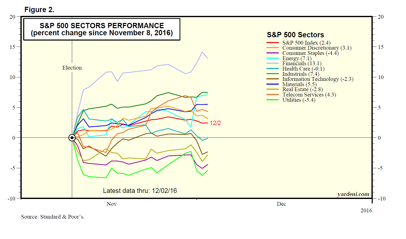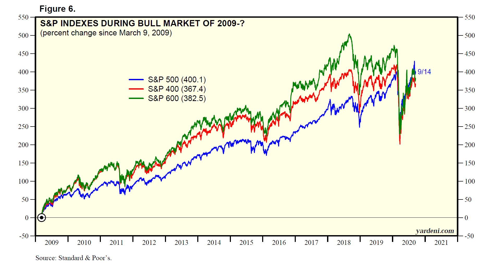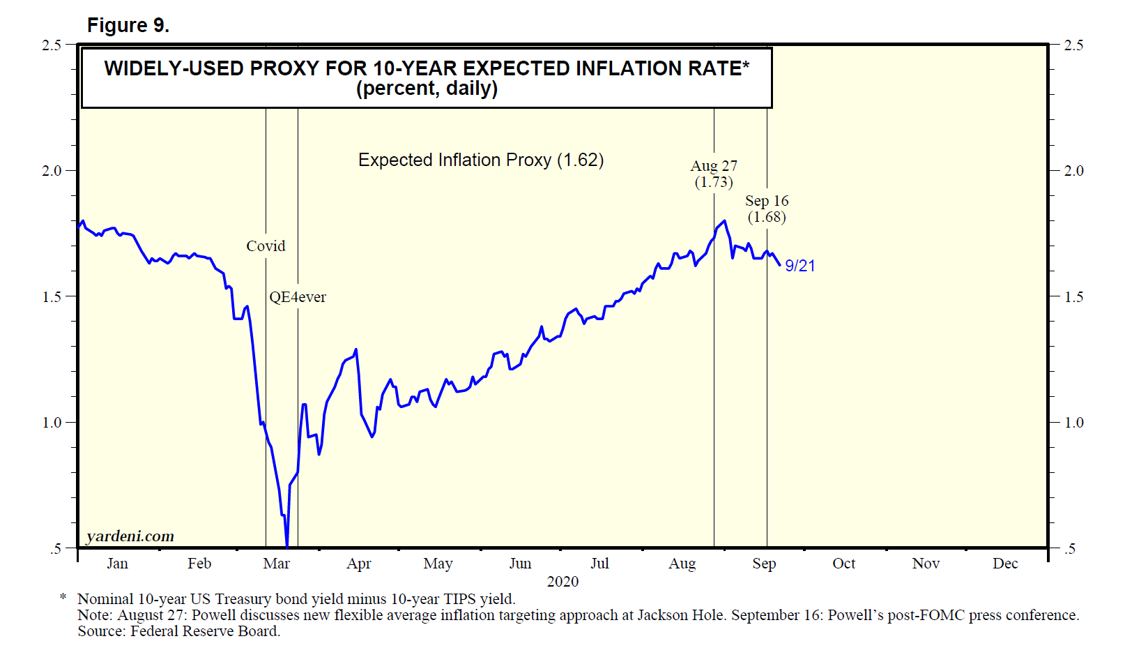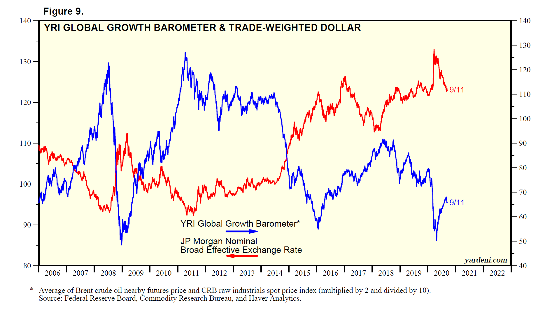 The market’s optimism since September 2 is apparent in the cyclical sectors that have dramatically outperformed the broader index. Here’s the S&P 500 performance derby from September 2 through Tuesday’s close: Energy (14.6%), Financials (12.1), Industrials (11.2), Materials (7.4), Utilities (4.3), S&P 500 (3.2), Communication Services (2.7), Health Care (2.2), Consumer Staples (0.7), Information Technology (-0.3), Consumer Discretionary (-0.3), and Real Estate (-1.4) (Table 1).