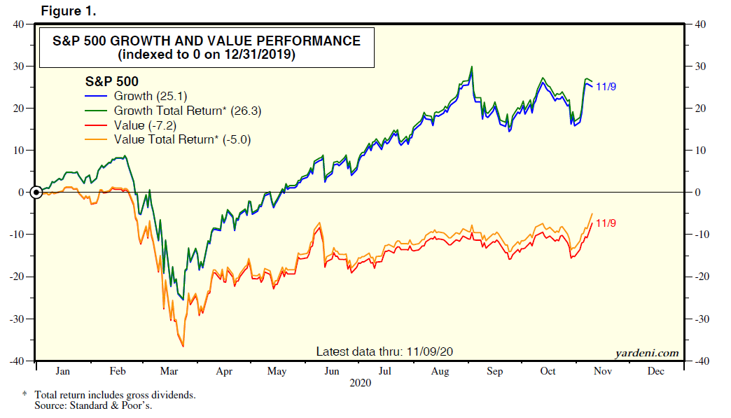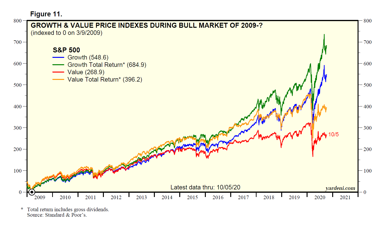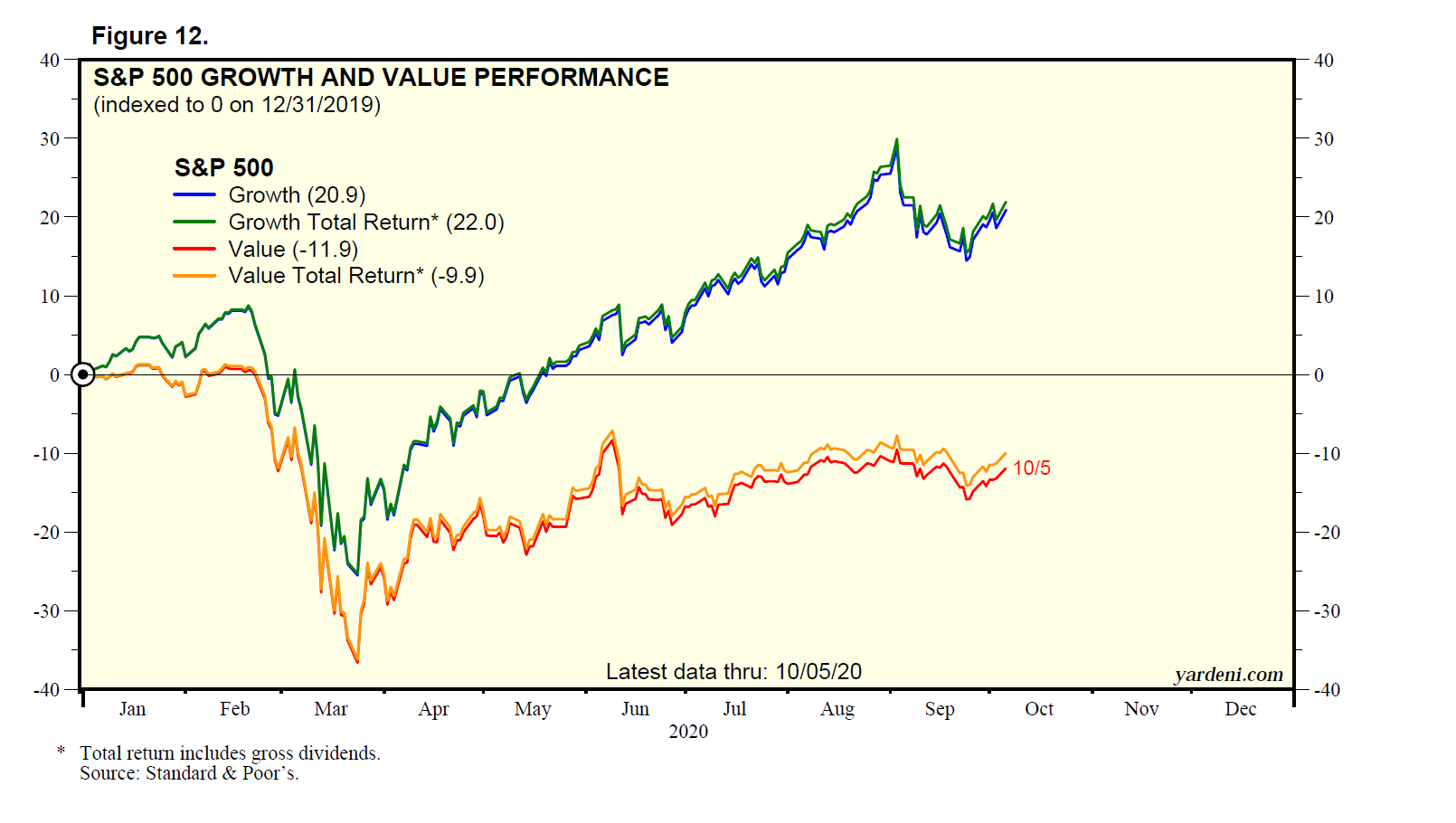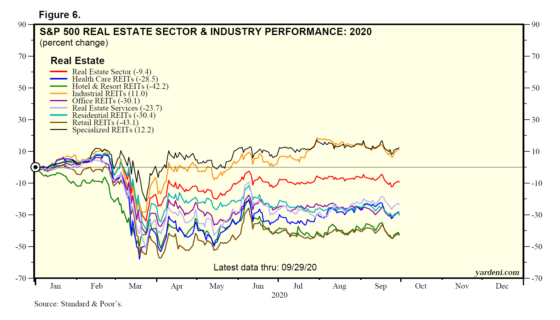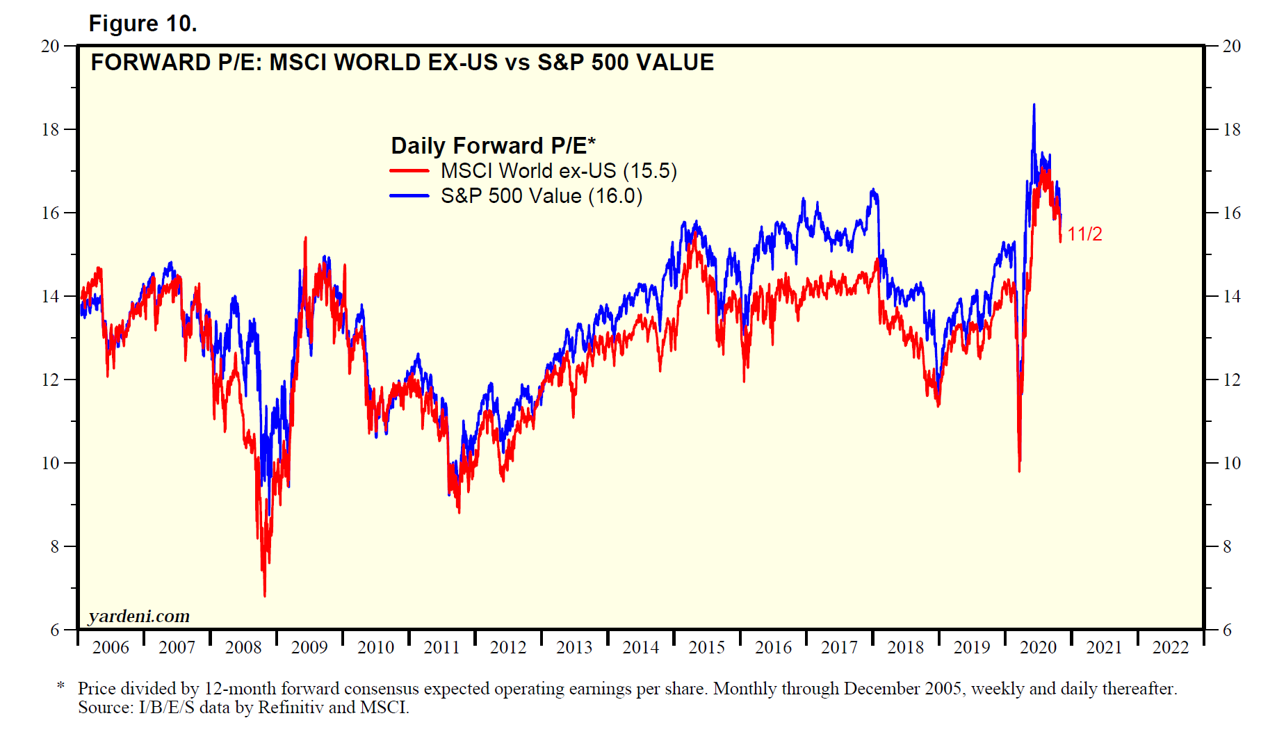 The market’s optimism since September 2 is apparent in the cyclical sectors that have dramatically outperformed the broader index. Here’s the S&P 500 performance derby from September 2 through Tuesday’s close: Energy (14.6%), Financials (12.1), Industrials (11.2), Materials (7.4), Utilities (4.3), S&P 500 (3.2), Communication Services (2.7), Health Care (2.2), Consumer Staples (0.7), Information Technology (-0.3), Consumer Discretionary (-0.3), and Real Estate (-1.4) (Table 1).