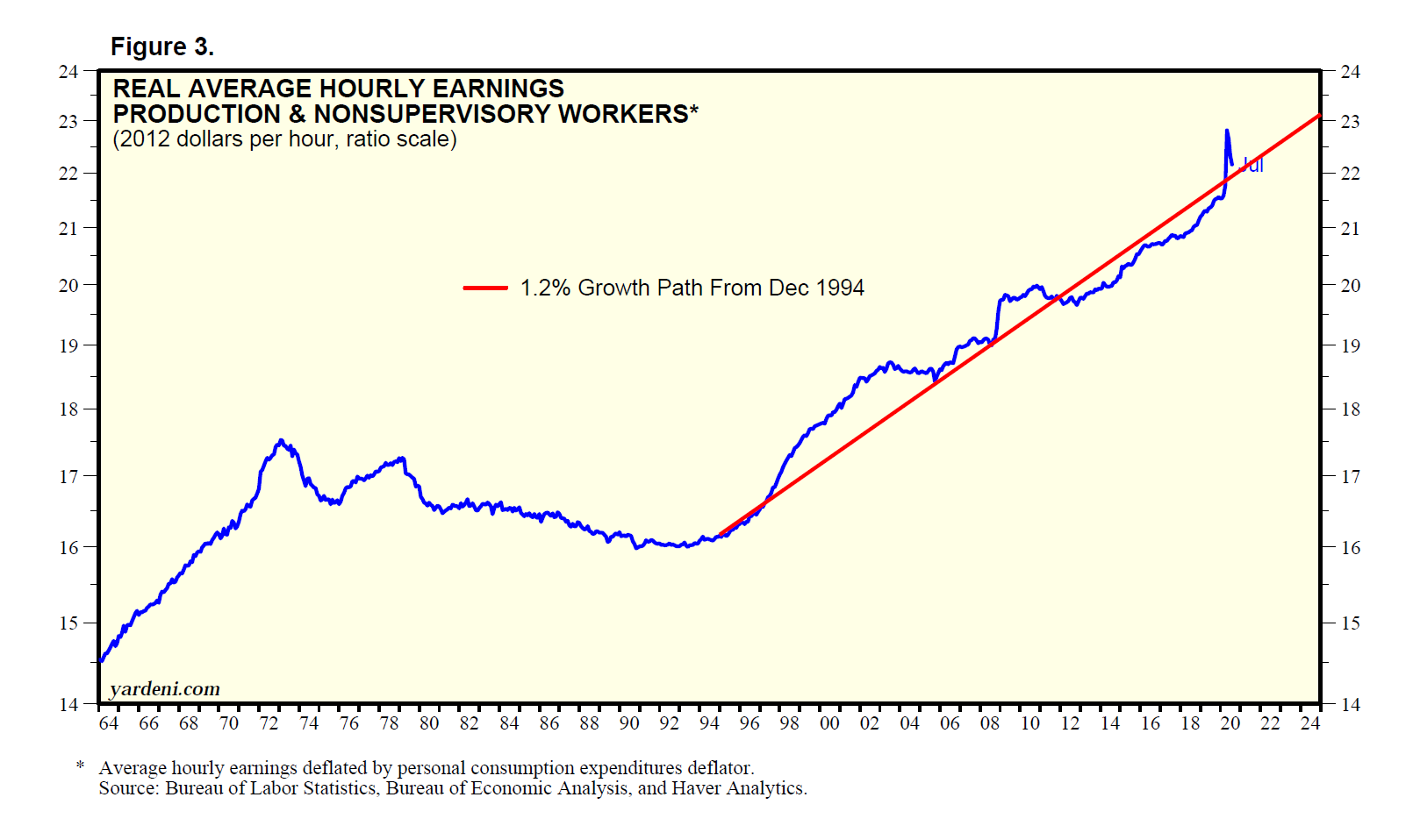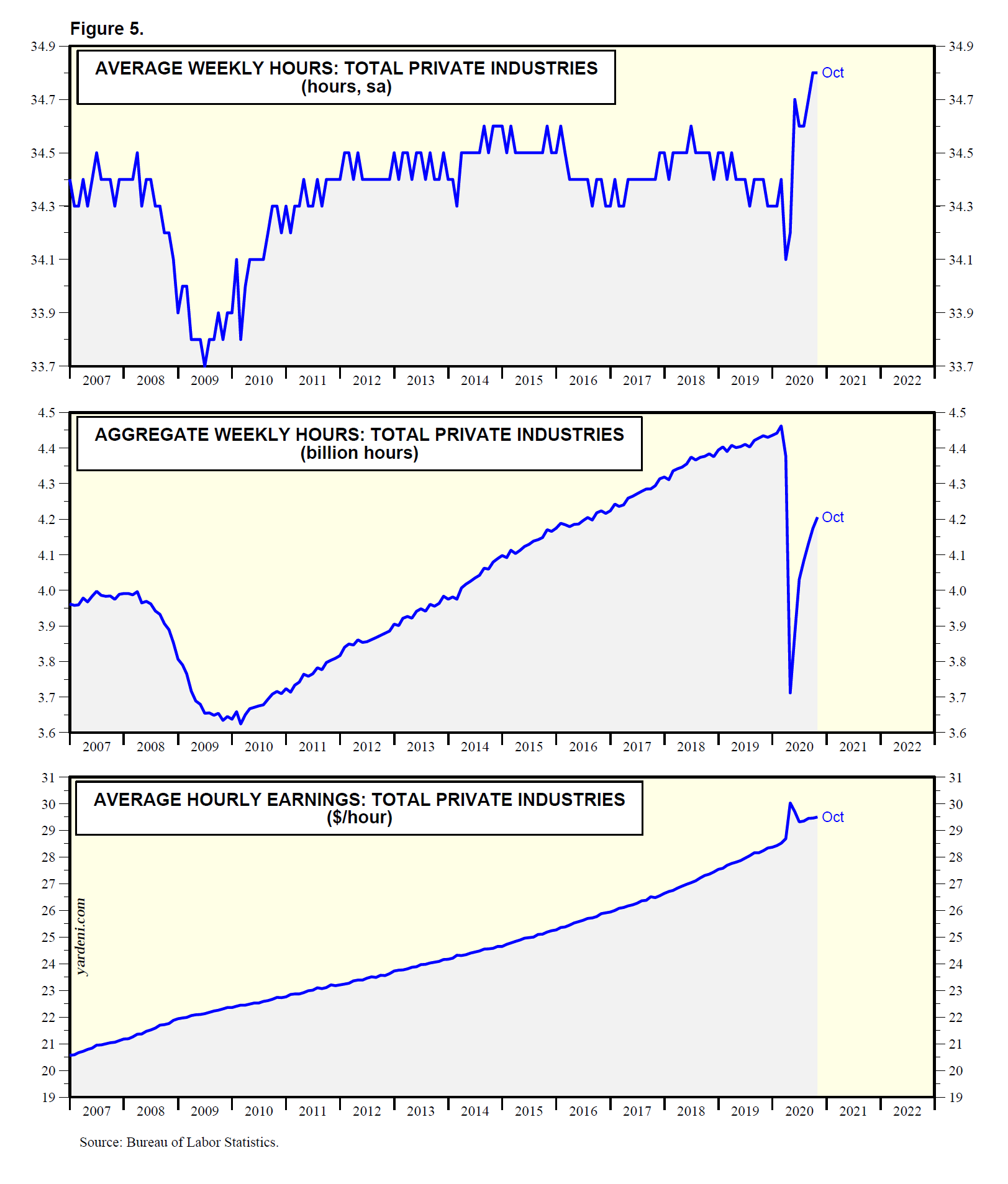 There seem to be more widespread inflationary wage pressures among services-producing industries: information services (4.5), professional & business services (4.3), leisure & hospitality (4.3), retail trade (3.9), transportation & warehousing (3.9), wholesale trade (3.7), education & health (3.6), financial services (3.3), and utilities (0.0). We believe that other than in the education & health industry, competitive pressures will make it hard for services industries with the most wage pressures to pass them on to prices.