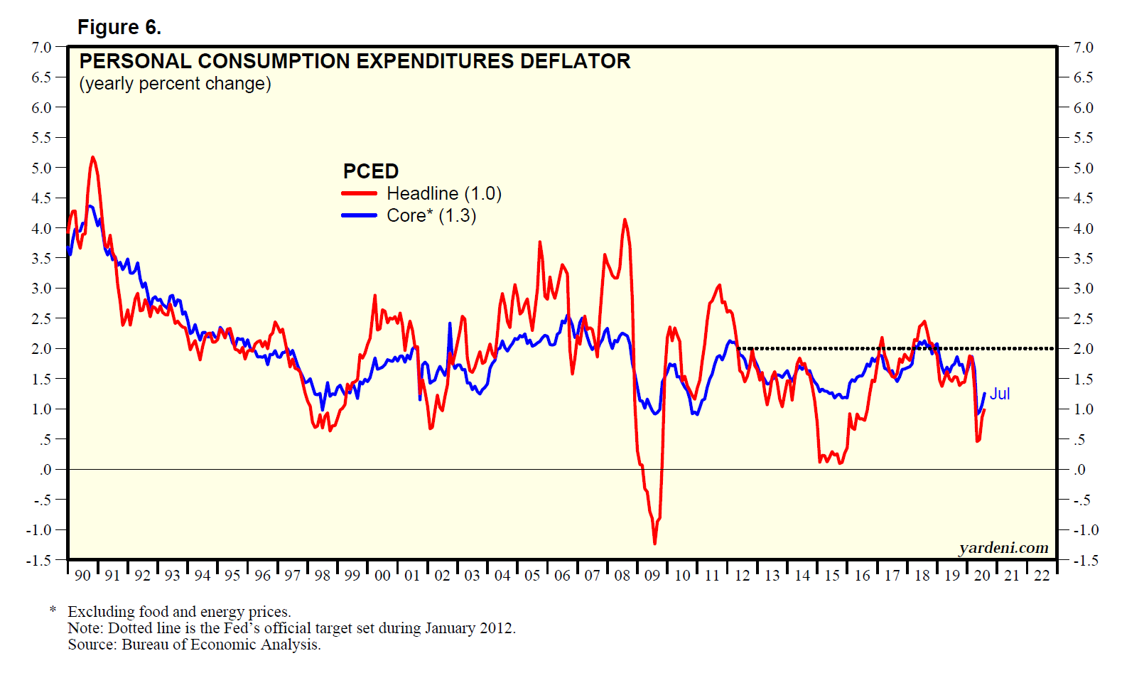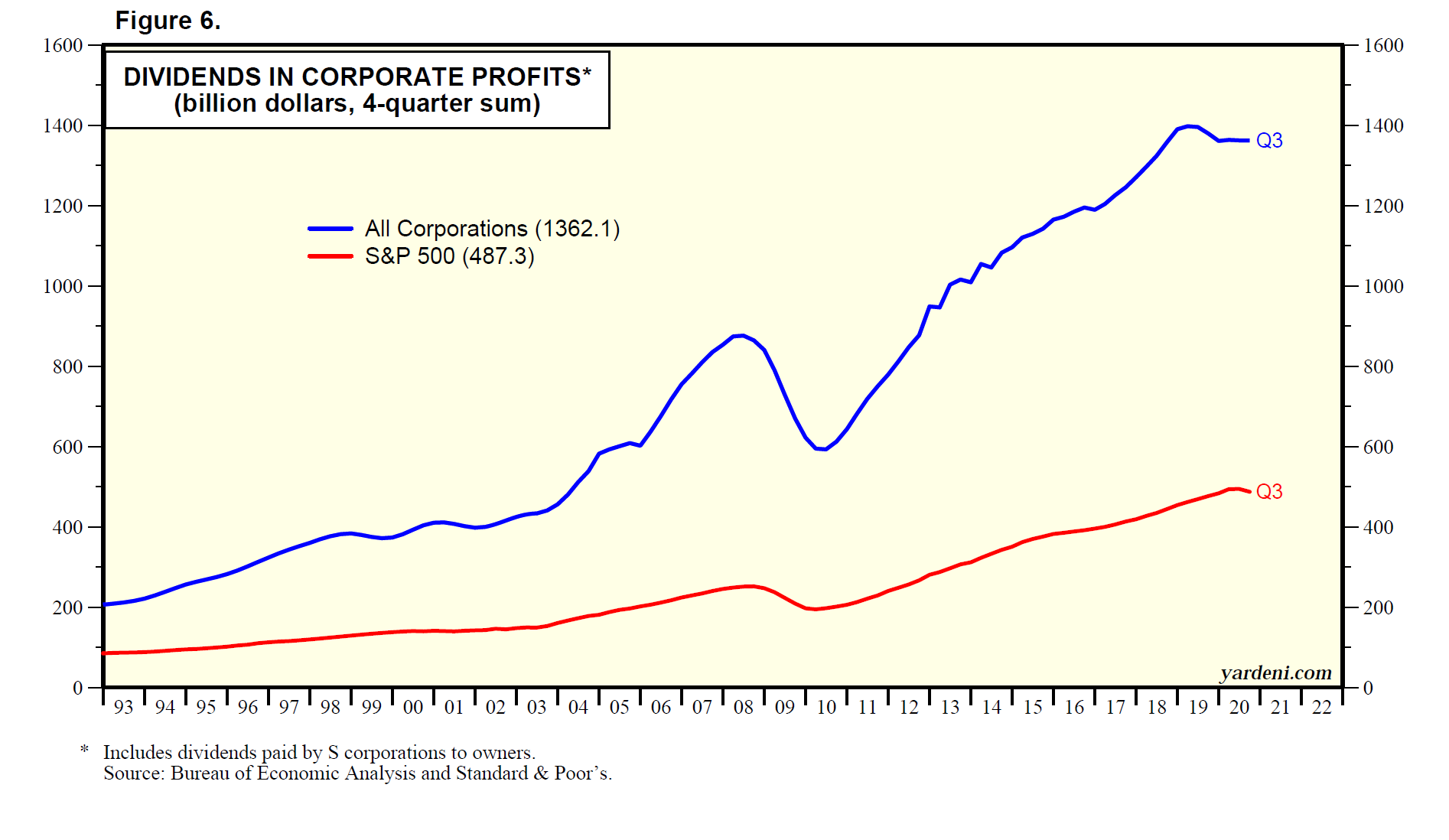 (3) Corporate profits. Reflecting the rebound in revenues and margins, the NIPA data show that after-tax book profits (reported on a tax-accounting basis) jumped 36.6% q/q (not annualized) during Q3 (Fig. 6). It’s at a new record high, though not much above its range-bound performance from 2012 through 2019. It is up only 13% since Q1-2012 through Q3-2020; yet the S&P 500’s reported earnings per share is up 43.8%, and the S&P 500’s aggregate after-tax reported earnings is up 31.9%, over this same period.