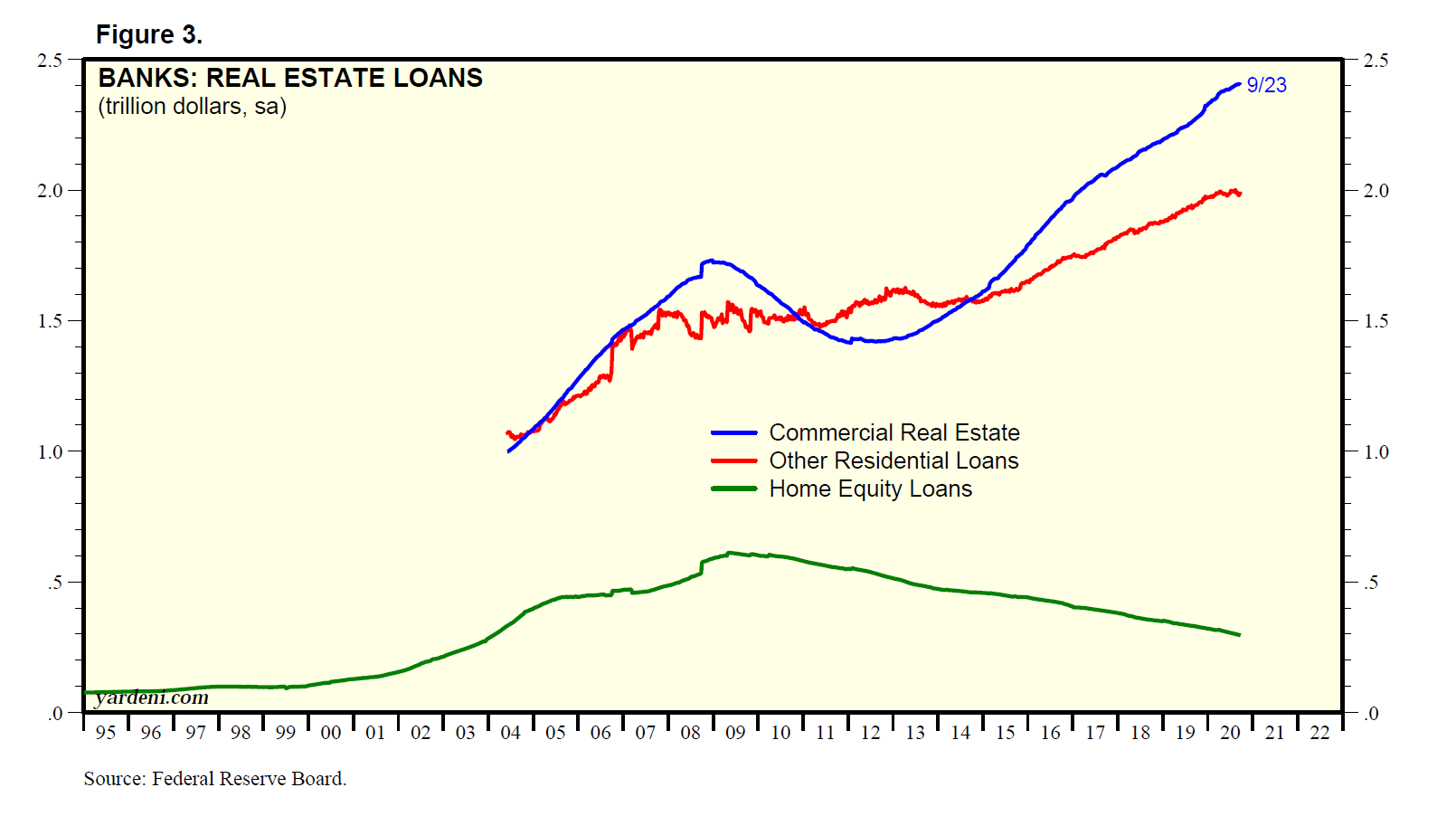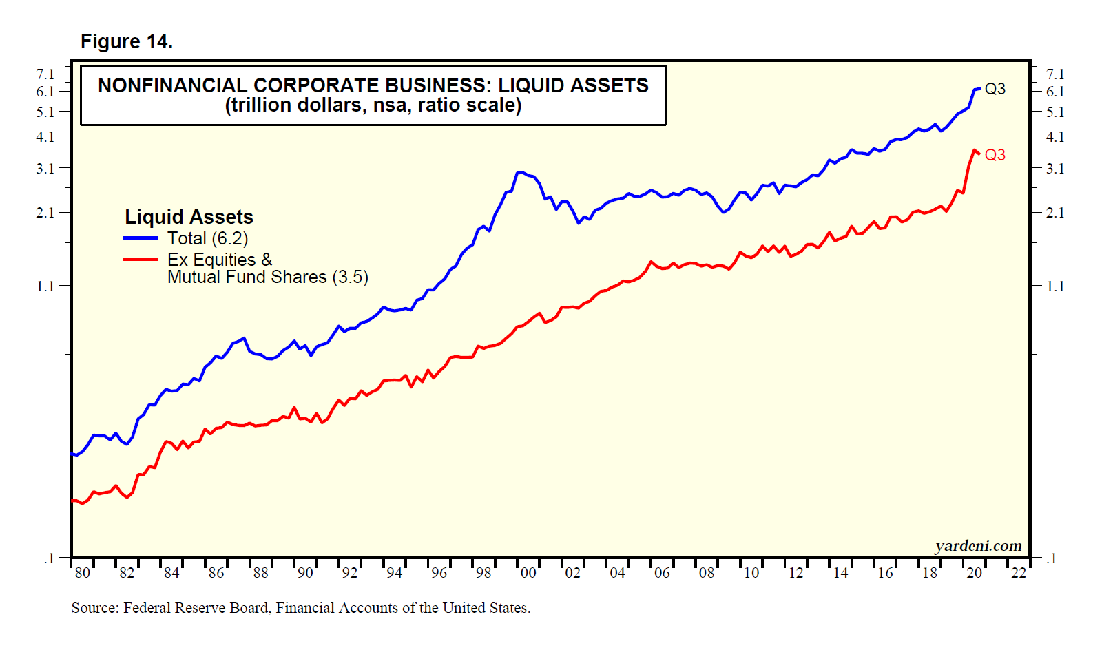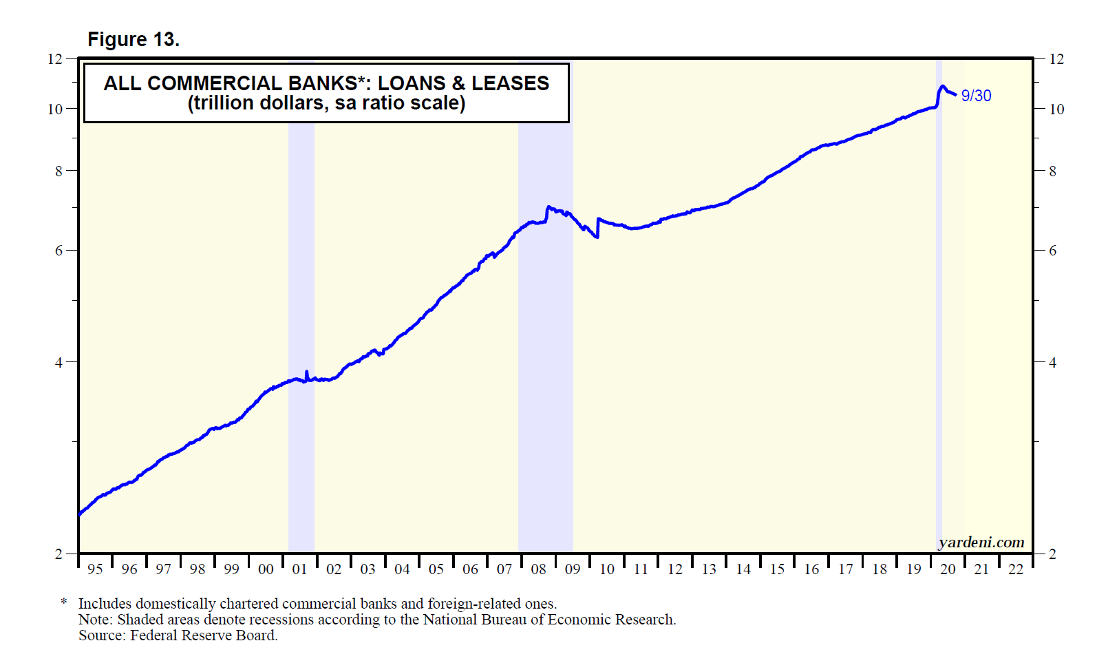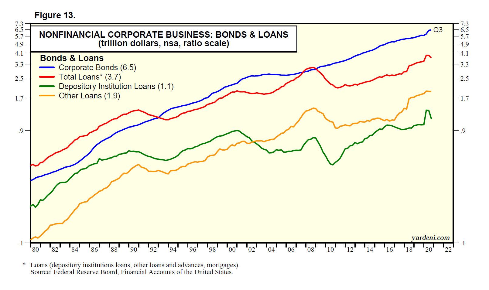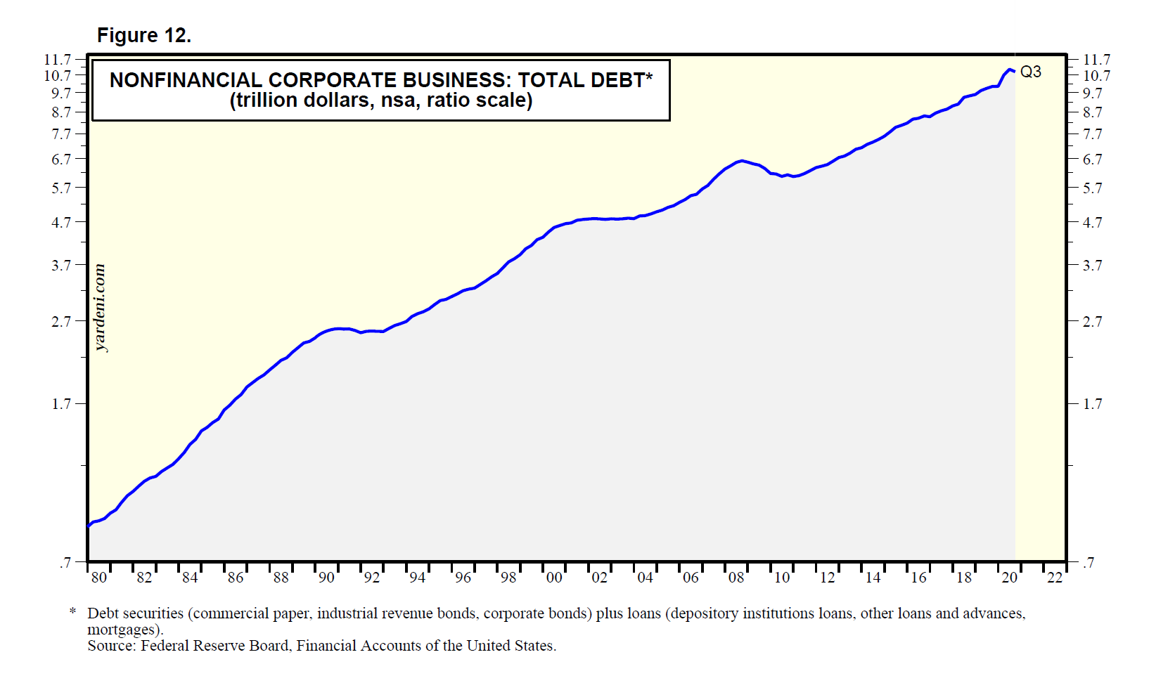 (1) Debt and liquid assets. Nonfinancial corporate (NFC) debt jumped $0.3 trillion during Q2 to a record $11.1 trillion (Fig. 12). It edged down to $10.9 trillion during Q3. NFC bonds edged up to a record $6.5 trillion, while loans edged down to $3.7 trillion (Fig. 13).