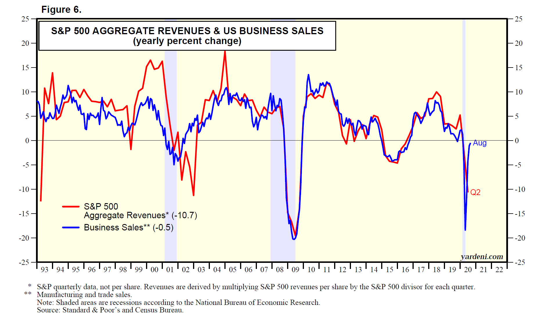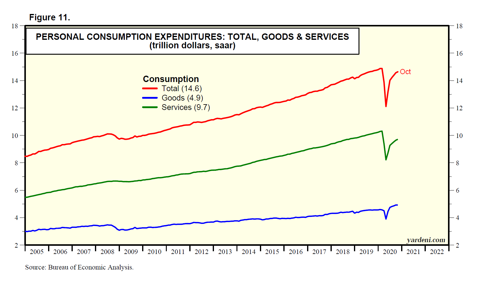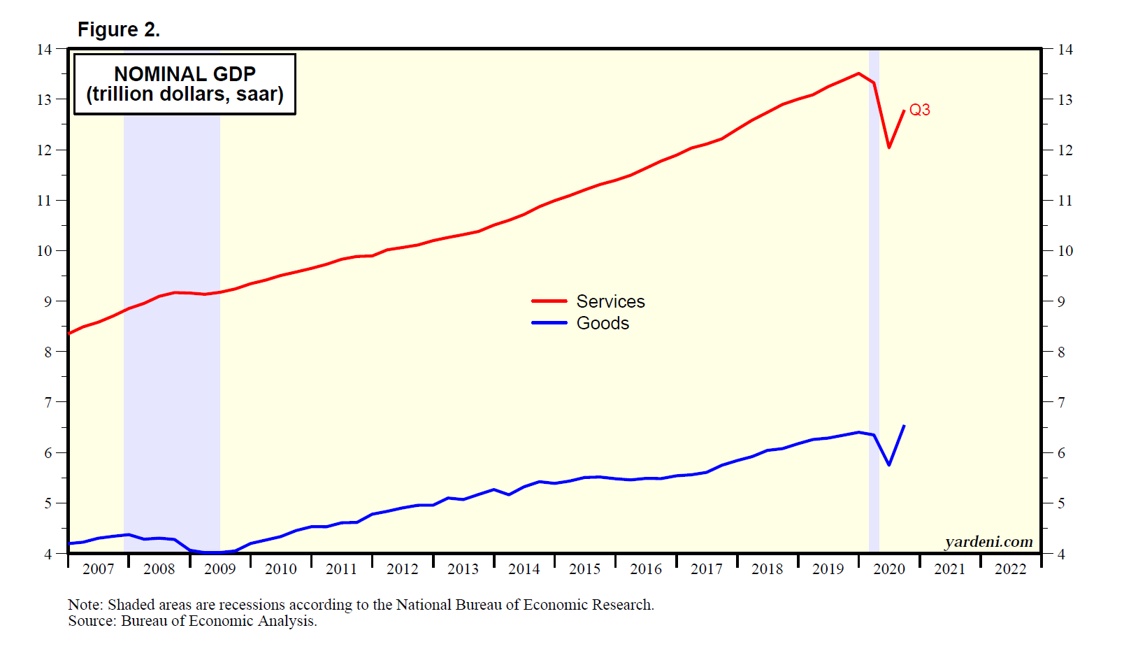 (1) Revenues & GDP. Corporate revenues have rebounded smartly along with real and nominal GDP. S&P 500 aggregate revenues rose 10.1% q/q during Q3 following a drop of 14.7% during the first half of the year (Fig. 1). Nominal GDP increased 8.4% (not annualized) during Q3 following a 10.2% drop during the first two quarters of the year. The revenues rebound has been led by goods-producing industries, while many service-providing ones have remained pandemic challenged. Business sales of goods have fully recovered since they bottomed in April through October. Nominal GDP of goods rose to a record high during Q3, while GDP of services remained 5.4% below the Q4-2019 peak (Fig. 2).