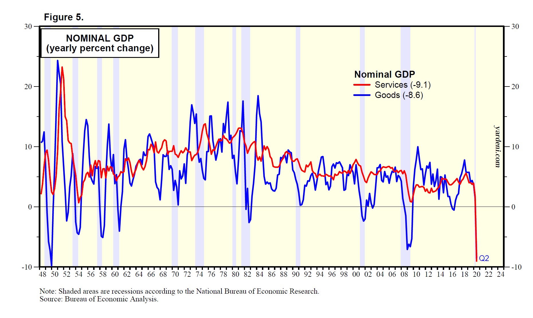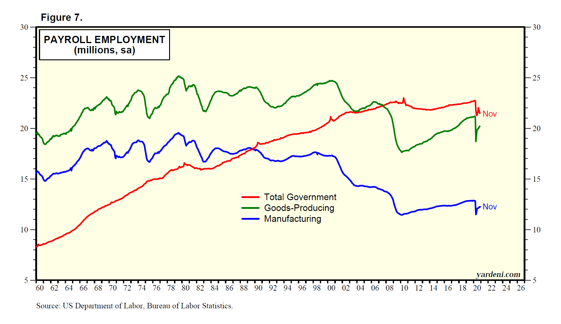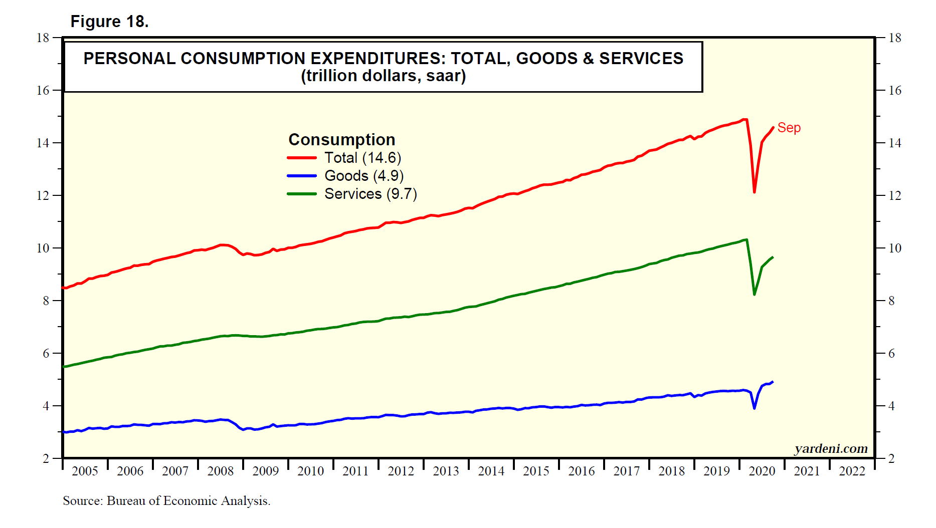 (1) Revenues & GDP. Corporate revenues have rebounded smartly along with real and nominal GDP. S&P 500 aggregate revenues rose 10.1% q/q during Q3 following a drop of 14.7% during the first half of the year (Fig. 1). Nominal GDP increased 8.4% (not annualized) during Q3 following a 10.2% drop during the first two quarters of the year. The revenues rebound has been led by goods-producing industries, while many service-providing ones have remained pandemic challenged. Business sales of goods have fully recovered since they bottomed in April through October. Nominal GDP of goods rose to a record high during Q3, while GDP of services remained 5.4% below the Q4-2019 peak (Fig. 2).