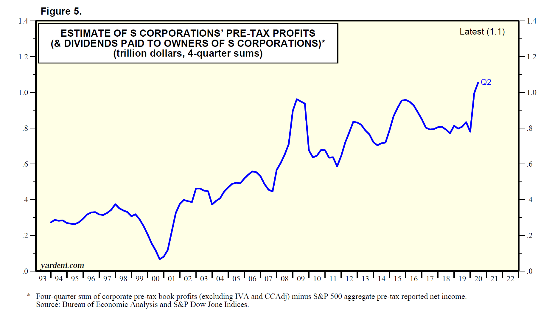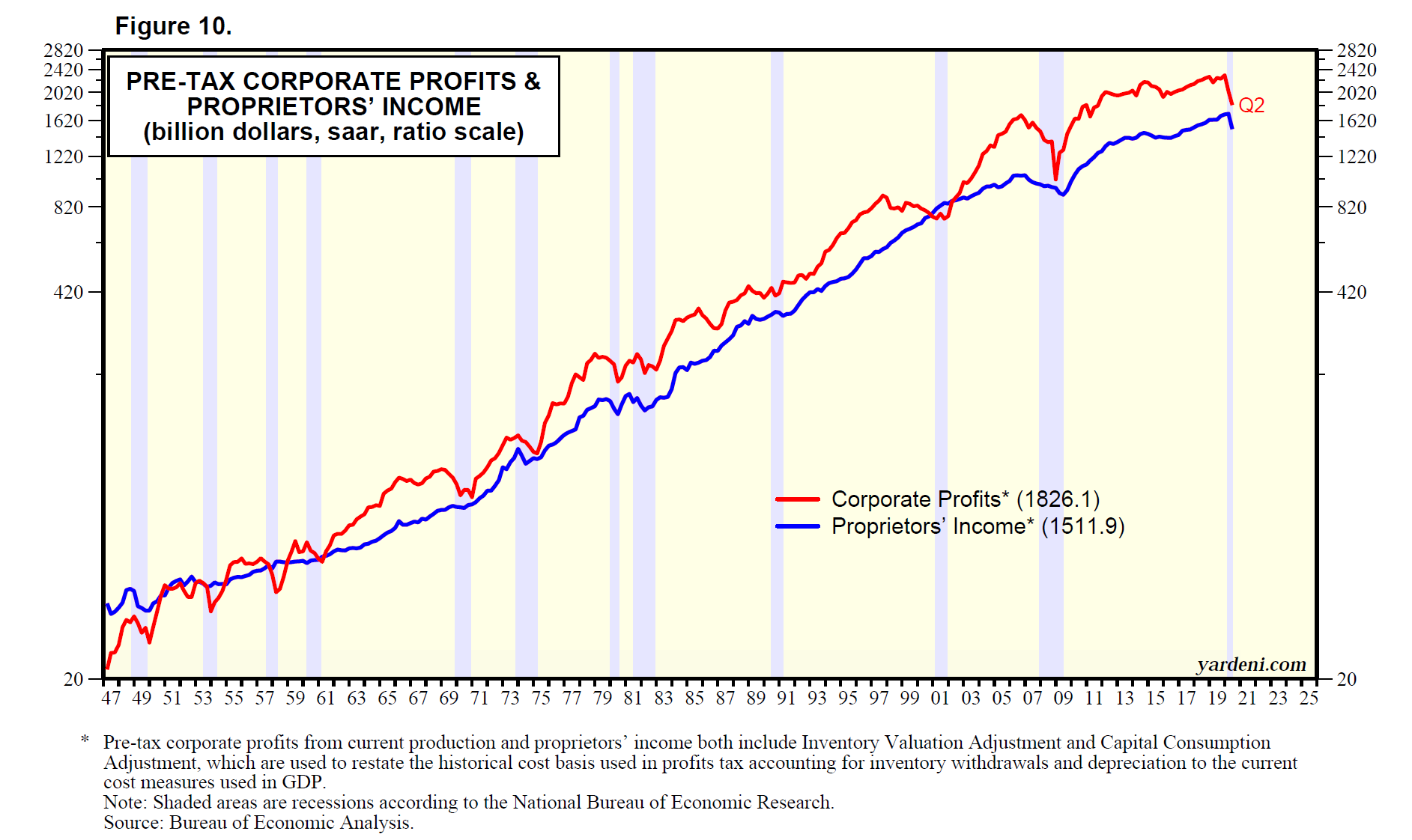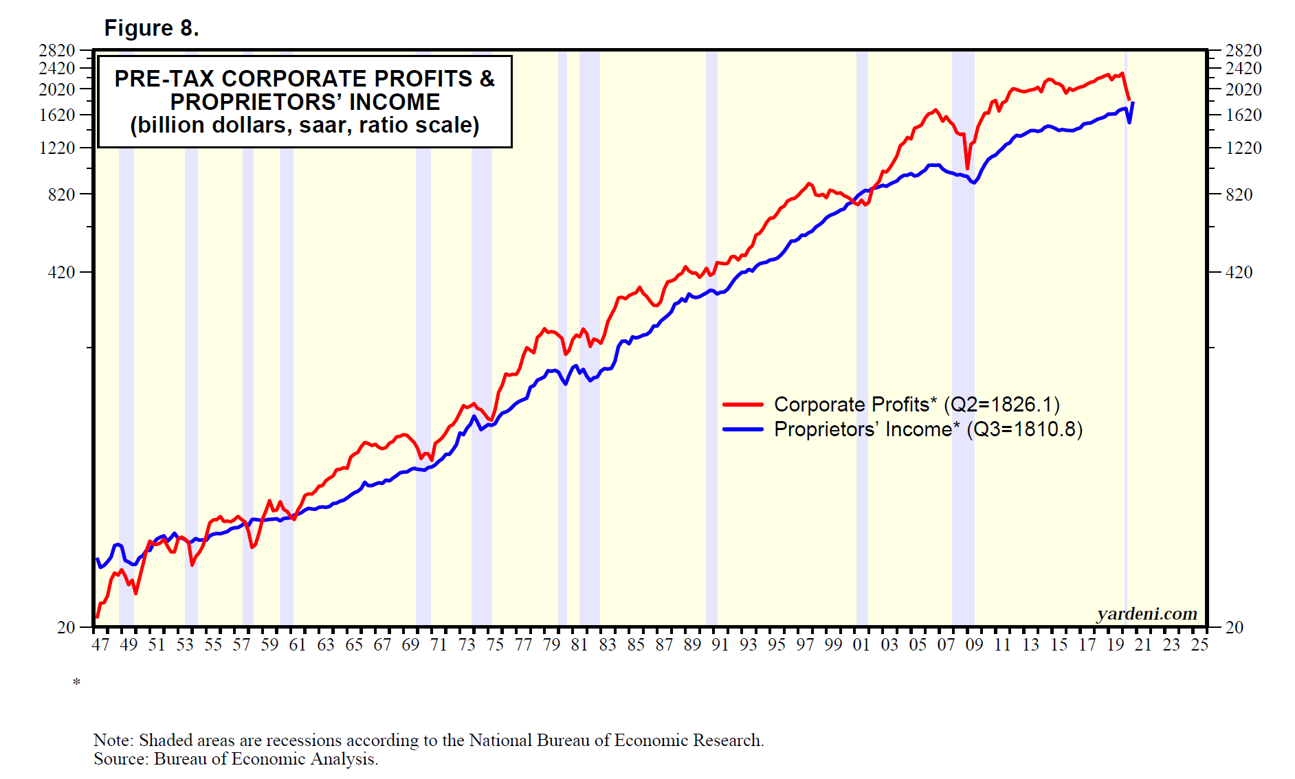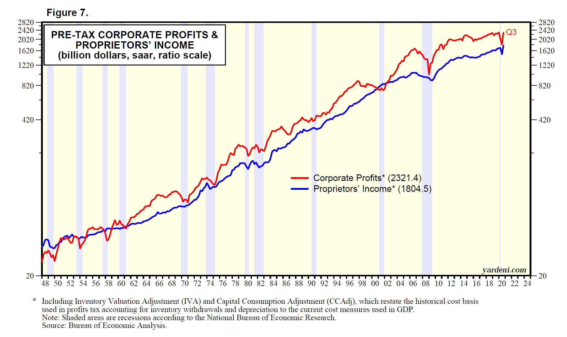 Interestingly, in the National Income and Product Accounts (NIPA), proprietors’ pre-tax income is almost as large as corporate profits (Fig. 7 and Fig. 8). The former is currently running around 80% of the latter. Both having been trending higher at an annual growth rate of about 6%-7%.