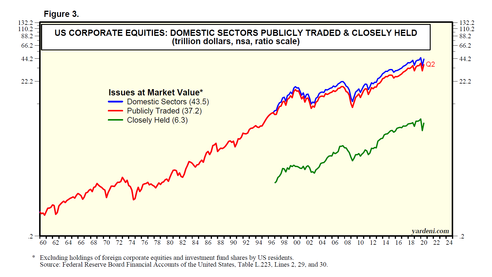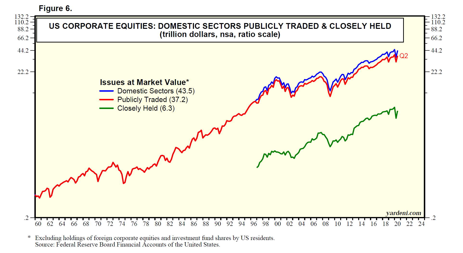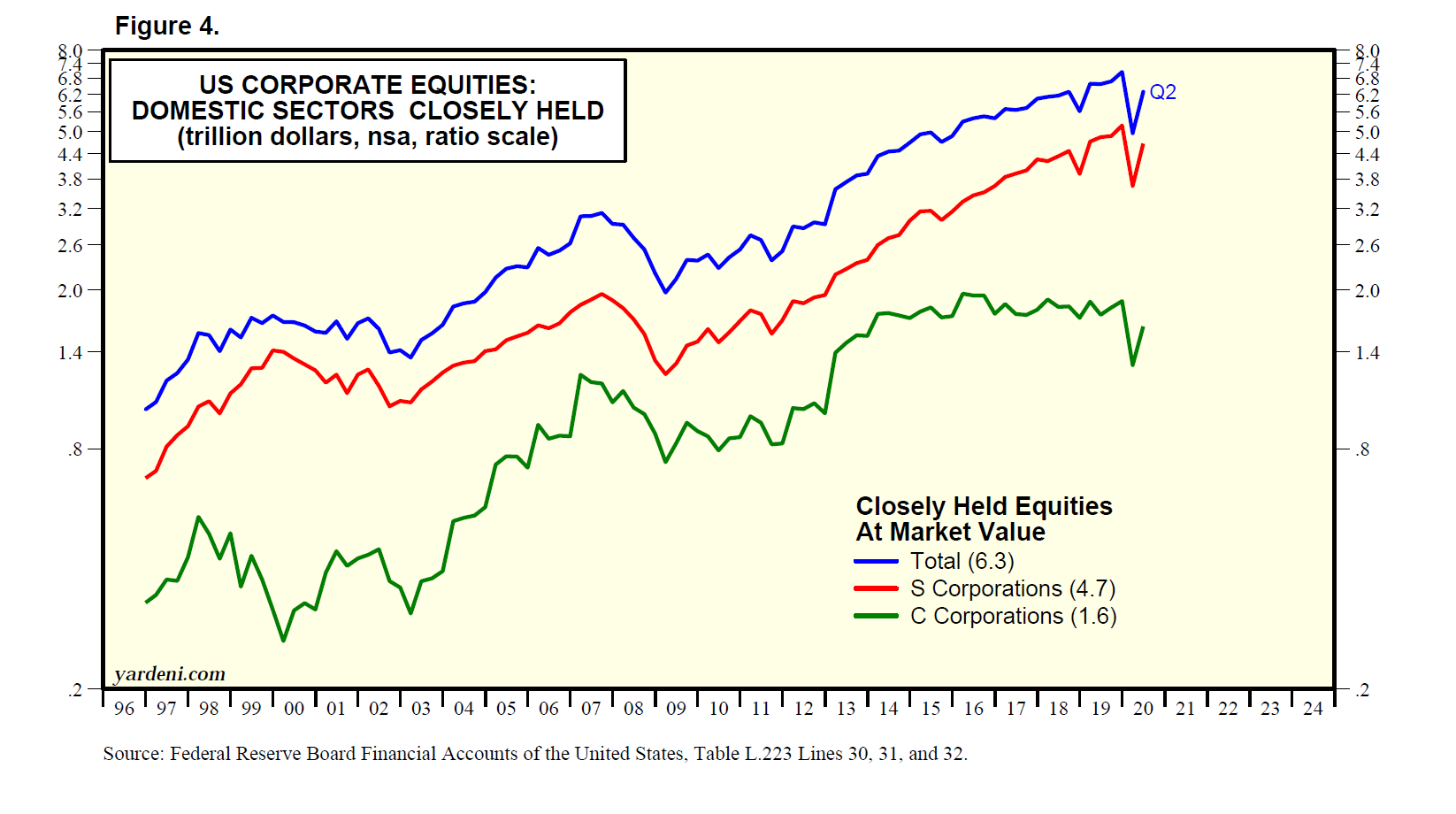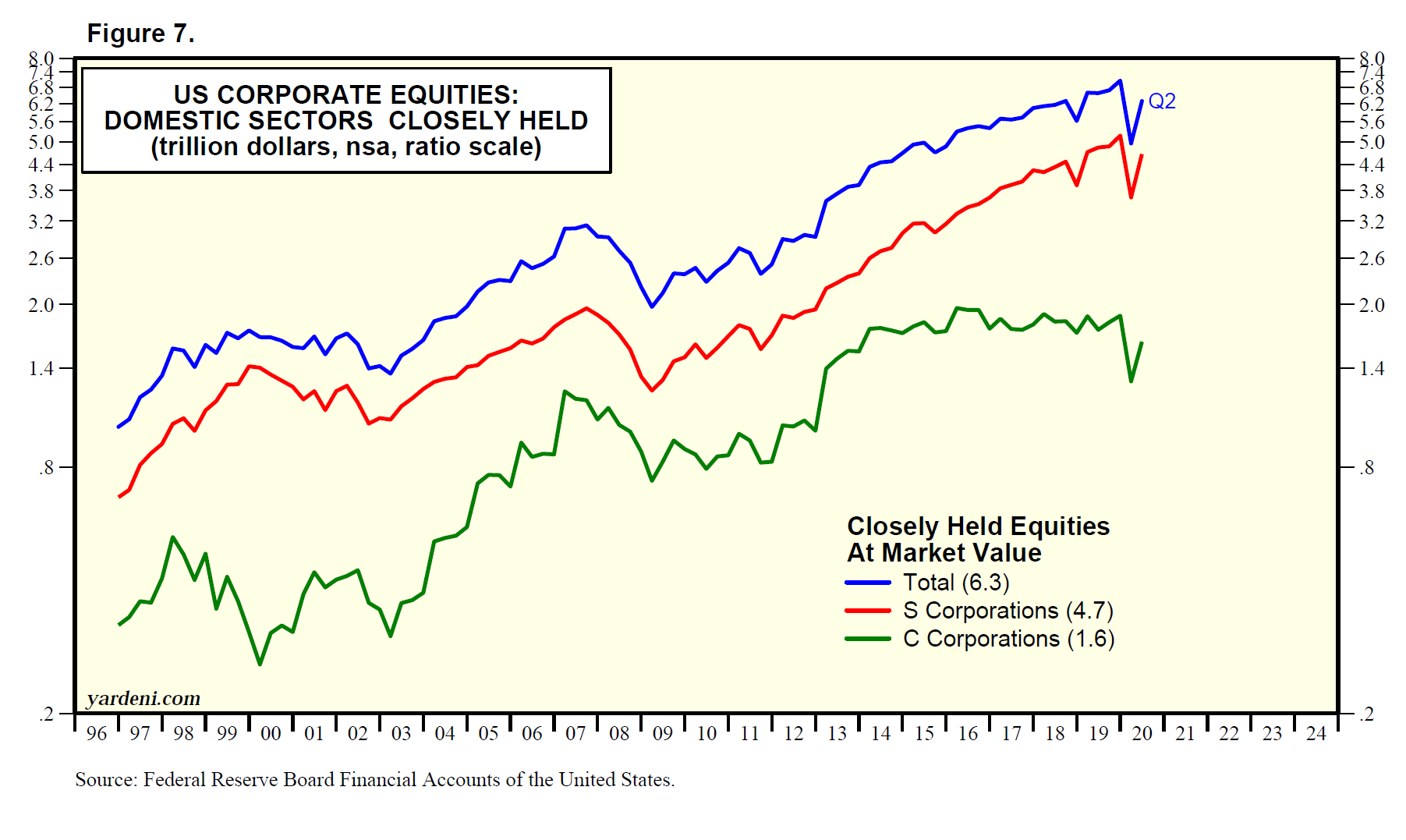 Interestingly, in the National Income and Product Accounts (NIPA), proprietors’ pre-tax income is almost as large as corporate profits (Fig. 7 and Fig. 8). The former is currently running around 80% of the latter. Both having been trending higher at an annual growth rate of about 6%-7%.