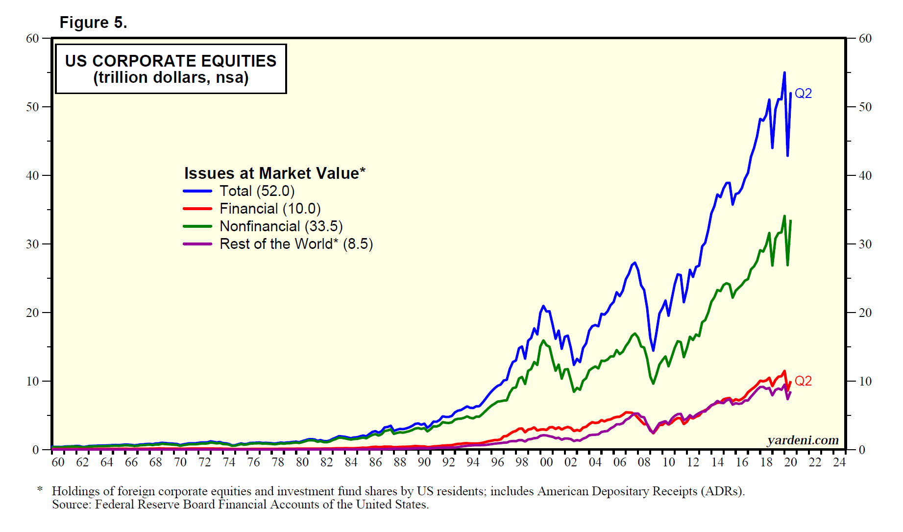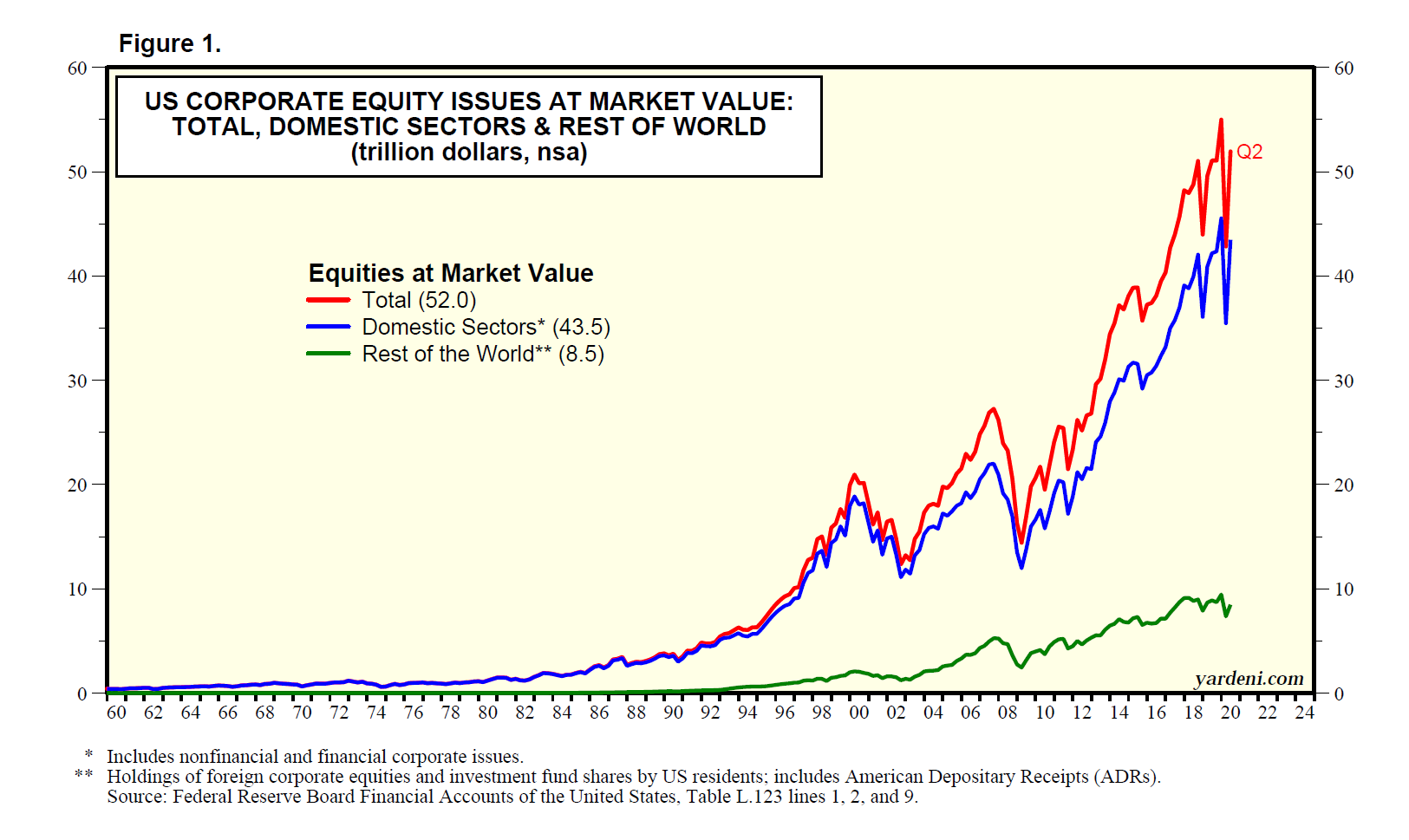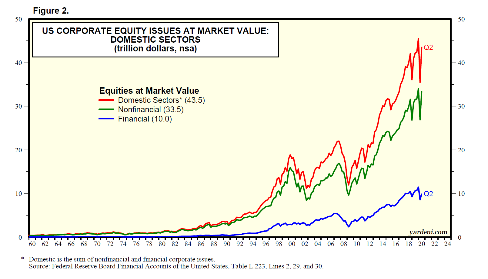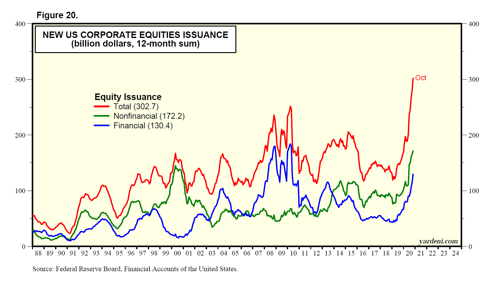 Corporate Finance VI: Stock Issuance & Buybacks. The Fed also tracks monthly corporate stock issuance by both financial and nonfinancial corporations (Fig. 20). Total issuance rose to a record $302 billion over the 12 months through October, led by a record $172 billion in NFC stock issuance and a $130 billion increase in stocks issued by financial corporations. Data available only through June show that NFC equity issuance over the 12 months through that month reflected a record gain of $125 billion in seasoned equity offerings and $22 billion in IPOs (Fig. 21).