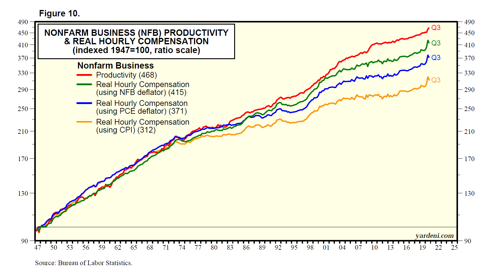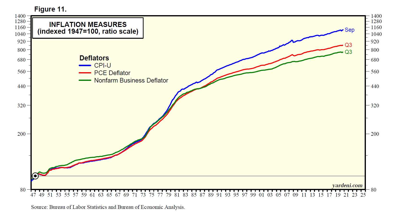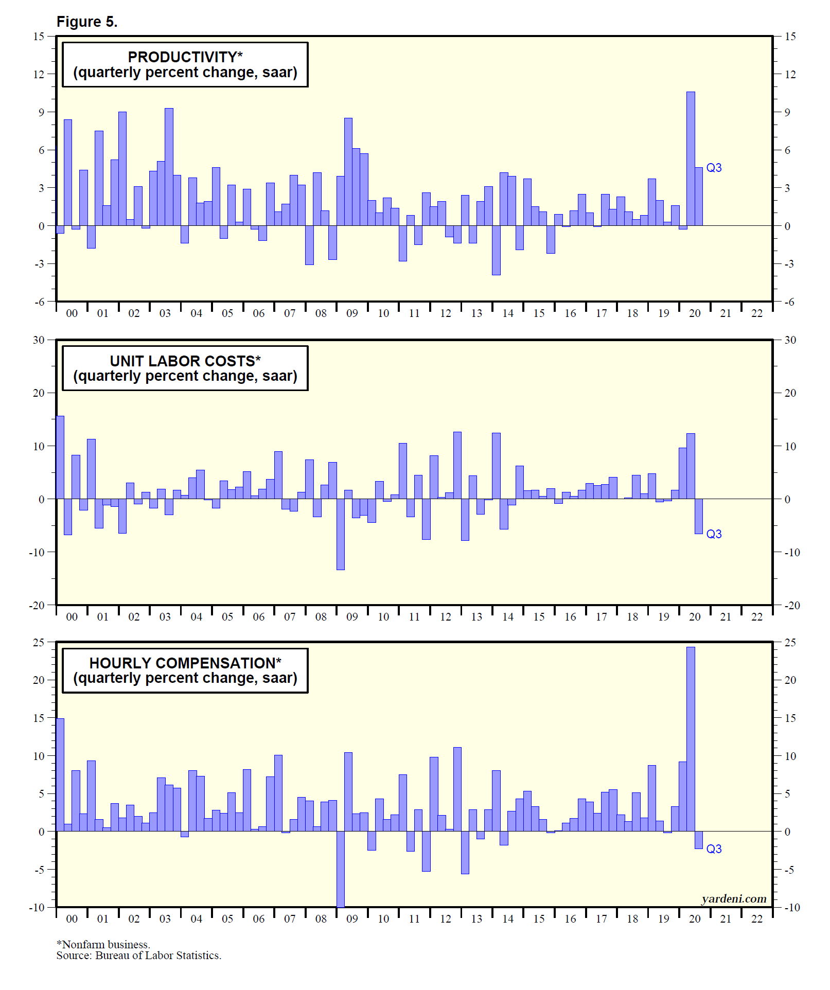(2) Profit margin & productivity. During Q3, S&P 500 revenues rose faster than costs. As a result, both reported and operating margins are almost back to where they were at the end of last year before the pandemic hit (Fig. 4). During Q3, nonfarm business productivity rose 4.6% (saar), following a 10.6% jump during Q2 (Fig. 5). Unit labor costs fell 6.6% during Q3. The latest compensation data are very funky, showing a jump of 24.3% (saar) during Q2 and a drop of 2.3% during Q3, mostly because low-wage workers bore the brunt of the layoffs during Q2. Nevertheless, we believe that the pandemic accelerated the pace of technological innovation and adoption in ways that will continue to significantly boost productivity, thus keeping a lid on labor costs and boosting margins.