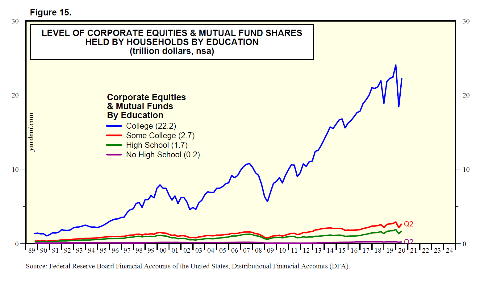 (4) Connecting the disconnect. We are just thinking out loud, but the apparent disconnect between stable income inequality and worsening economic mobility may have to do with the growing share of higher-paying jobs on the income scale that rely on technology. It’s not so simple for workers to move up the income escalator if they don’t possess the skills or access to relevant education and training to leverage technology. In the past, moving up the income scale may have had more to do with workers moving into a supervisory or management position in a field in which they had gained knowledge and experience. Today, organizational leadership is increasingly horizontal, and the highest earners may be those who are able to most productively use technology rather than those that effectively supervise humans.