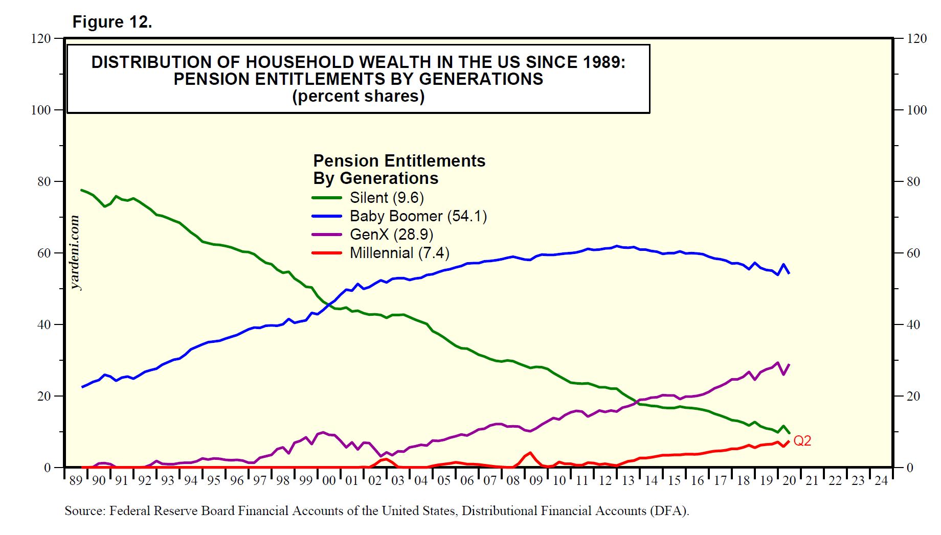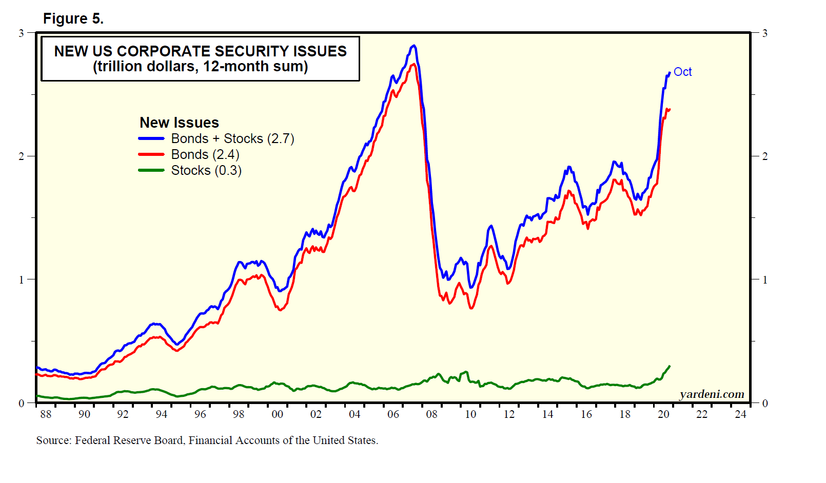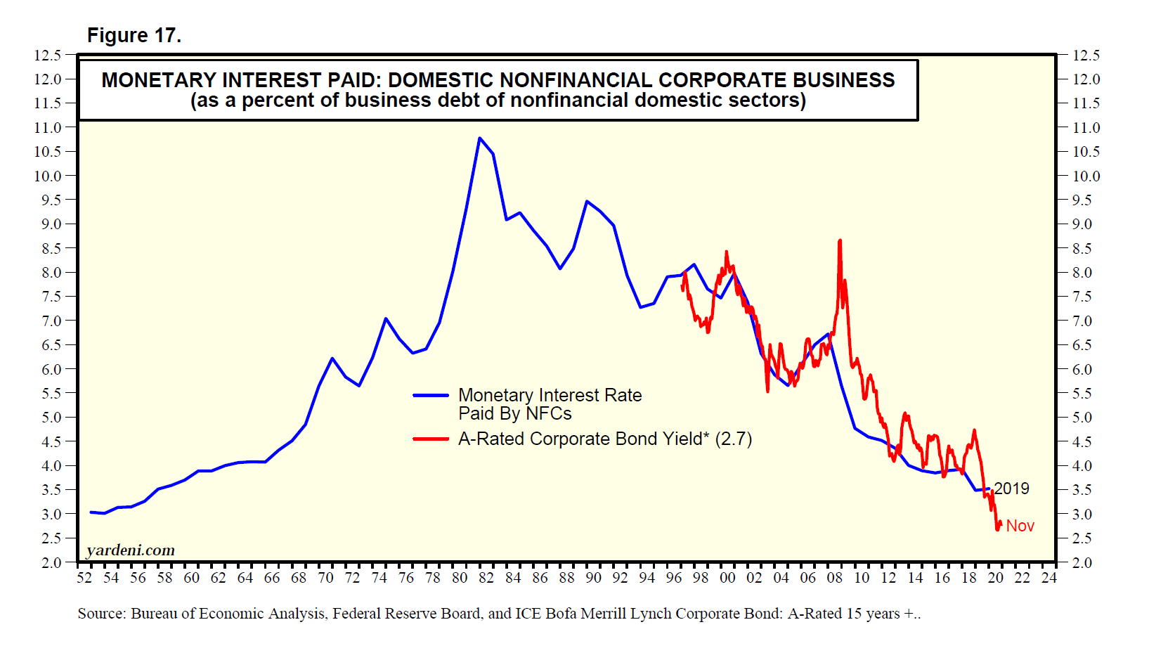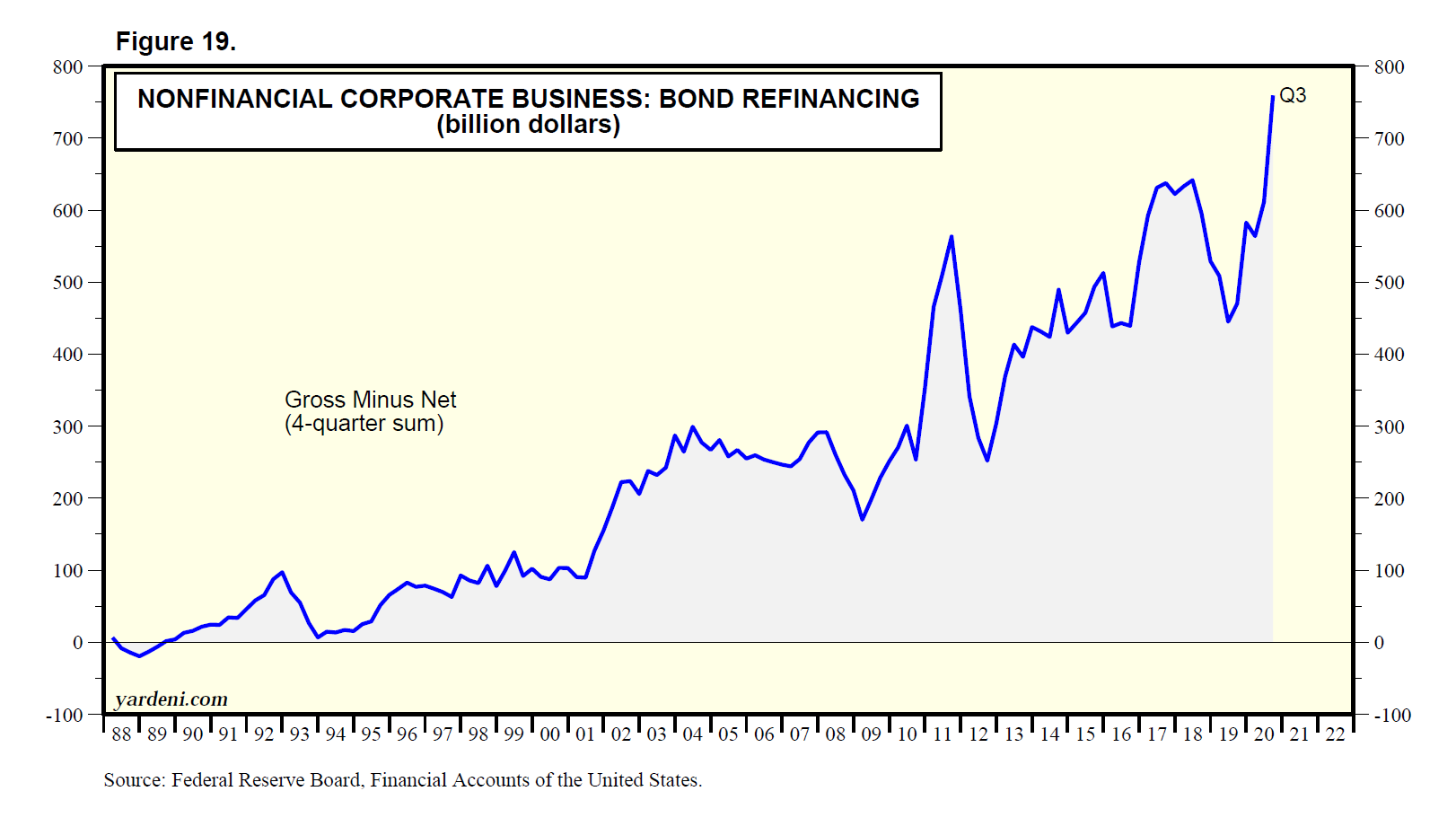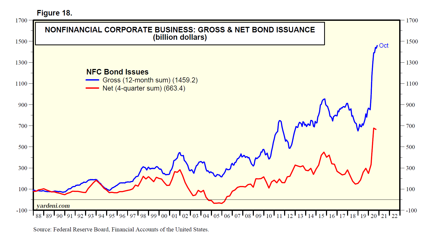(3) Refinancing outstanding bonds. The Fed compiles a monthly series on NFC gross bond issuance (Fig. 18). Over the past 12 months through October, they totaled a record $1.5 trillion. The Fed’s quarterly database shows that net issuance totaled a record $0.7 trillion over the past four quarters through Q3, implying that a record $0.8 trillion was refinanced at record-low yields (Fig. 19).