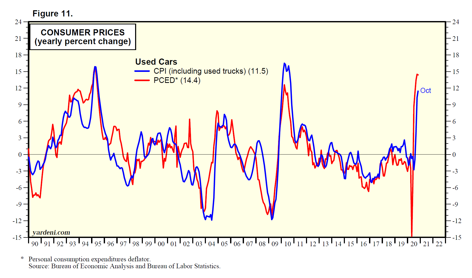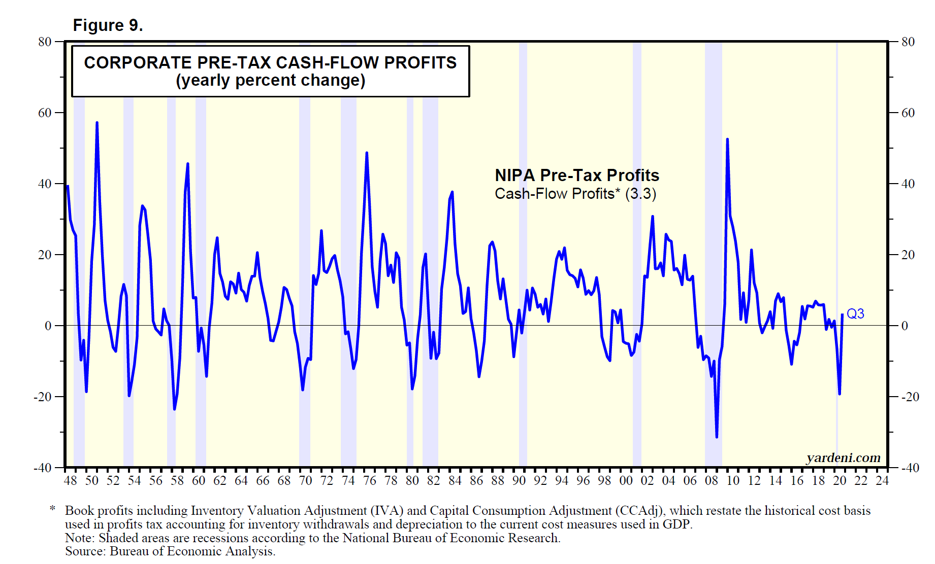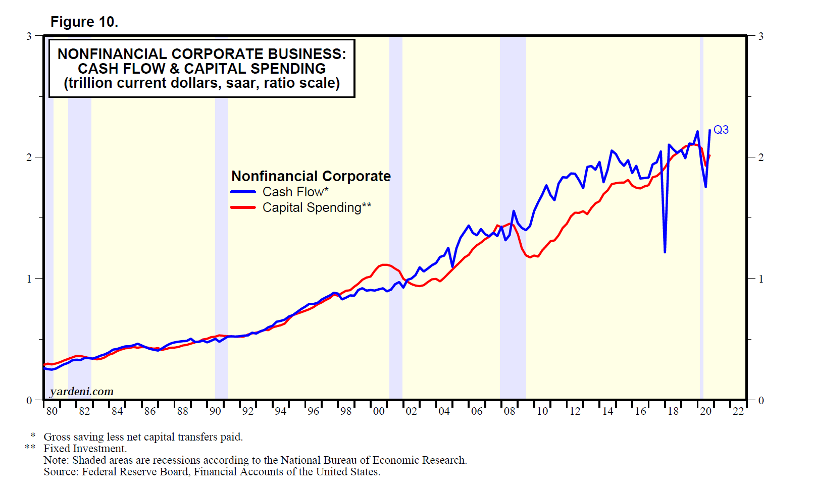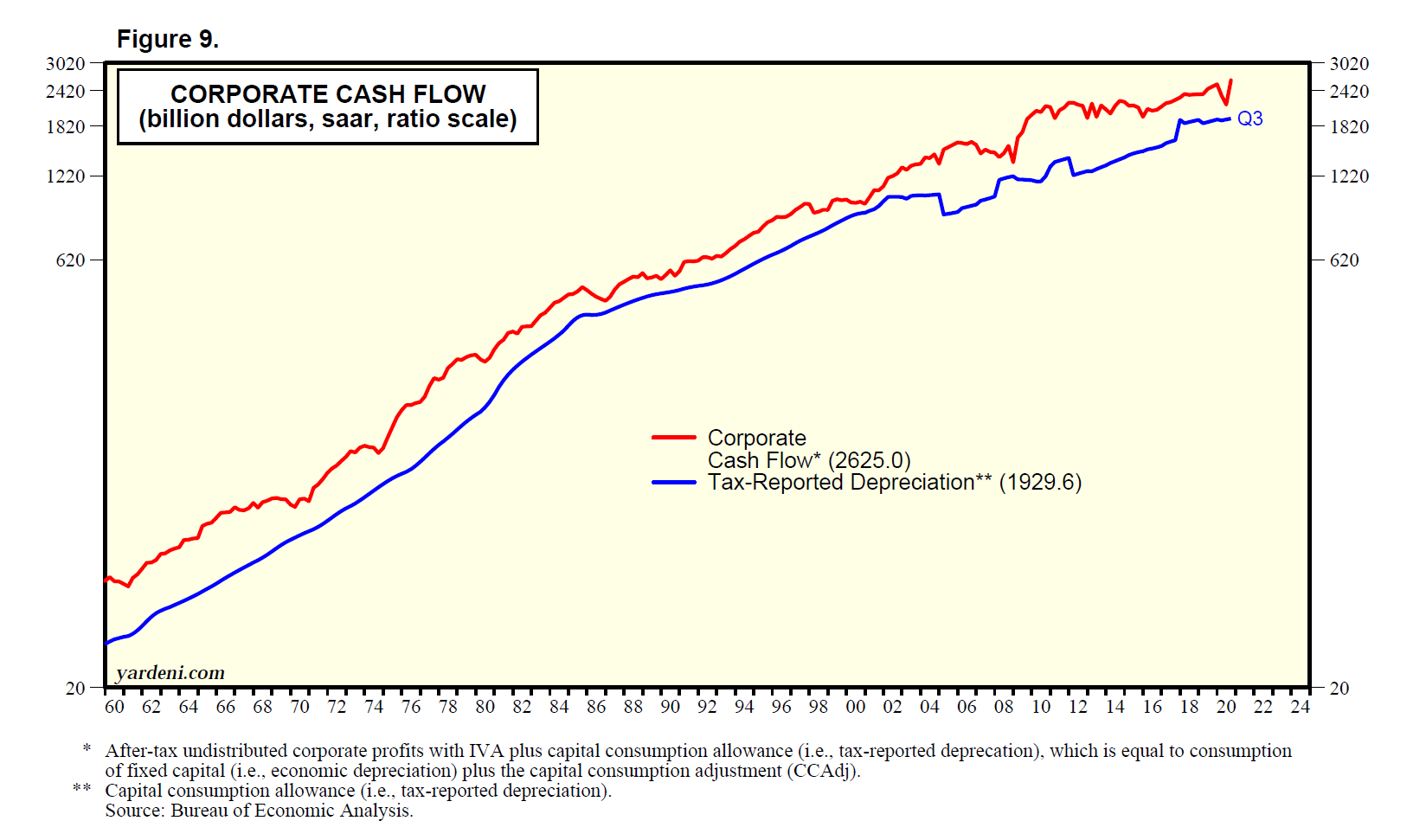 As a result of the lockdown recession, companies reduced their dividends during 2020 slightly from last year’s record high. That allowed more of the Q3 rebound in profits to show up as a 202% q/q (not annualized) bounce in undistributed cash-flow profits. This category is back to where it was before the pandemic hit. As a result, corporate cash flow, which is the sum of undistributed cash-flow profits and tax-reported depreciation, rose to a record $2.63 trillion (saar) during Q3 (Fig. 9). That’s impressive.