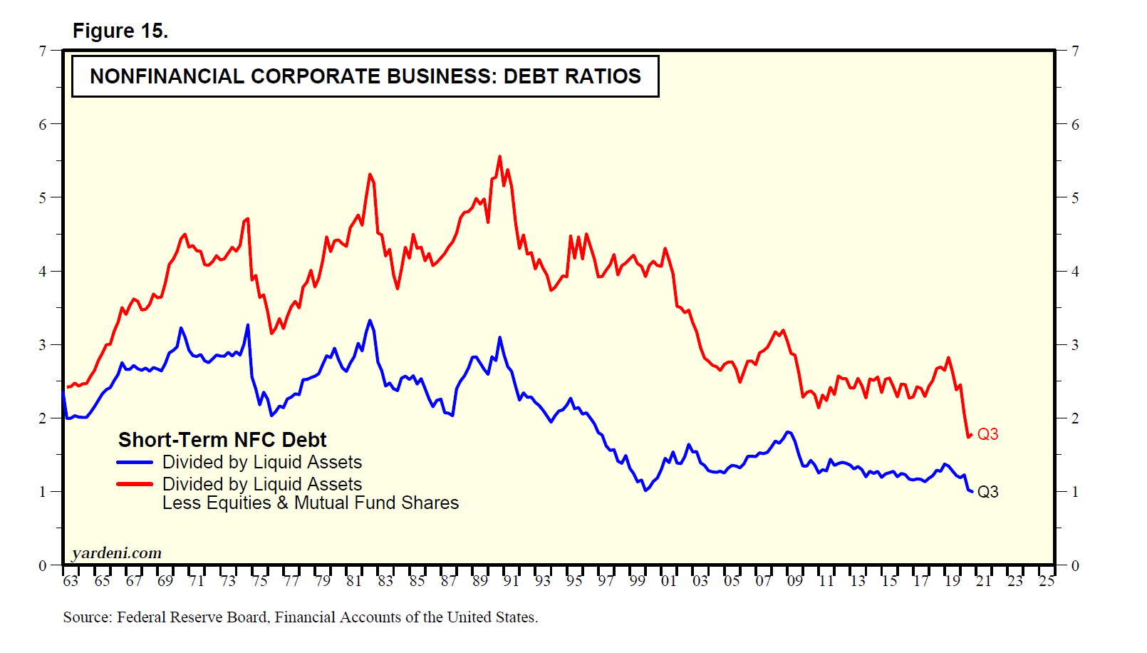The Fed report includes equities and mutual fund shares in the liquid assets held by NFCs (Fig. 14). Melissa and I prefer to exclude these items from liquid assets. On this basis, liquid assets held by NFCs jumped $0.9 trillion y/y to $3.5 trillion during Q3. The ratio of NFC short-term debt to the smaller measure of liquid assets was at a record low during Q3 (Fig. 15).
