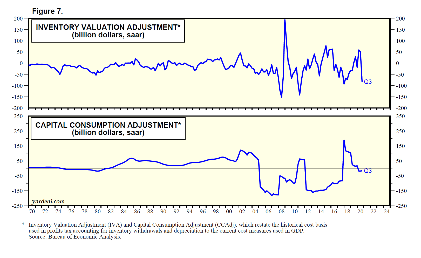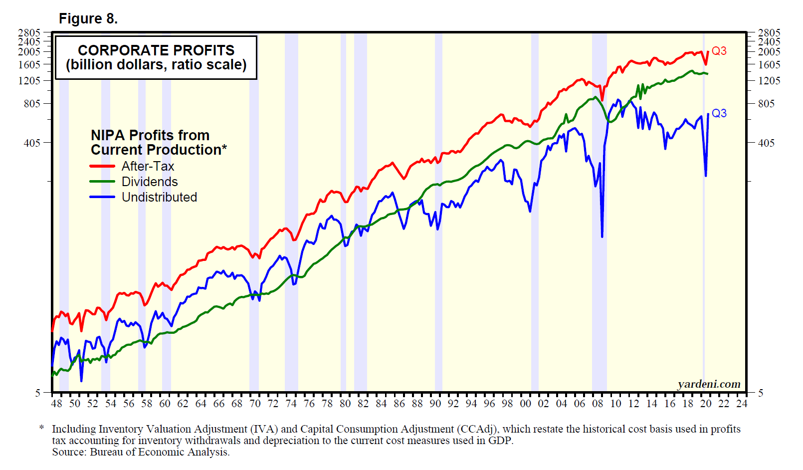 Corporate Finance III: Dividends, Retained Earnings & Cash Flow. So what are corporations doing with their profits? The NIPA accounts focus on after-tax “profits from current production,” which is book profits including the Inventory Valuation Adjustment (IVA) and Capital Consumption Adjustment (CCAdj). These two adjustments restate the historical cost basis used in profits tax accounting for inventory withdrawals and depreciation to the current cost measures used in GDP (Fig. 7). We prefer to call this measure “cash-flow profits” (Fig. 8). They are allocated to dividends and to undistributed profits.