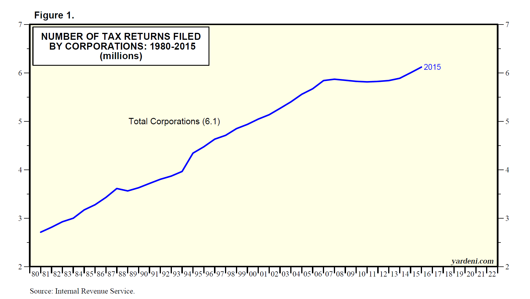 (1) The number of corporations. We have IRS data from 1980 through 2015 on the number of returns filed by business entities in America. The total number of corporations increased from 2.7 million to 6.1 million over this period (Fig. 1). These include C and S corporations. The former file corporate tax returns. Their profits are taxed at the corporate level, and the dividends they pay are taxed in individual tax returns. S corporations can have no more than 100 shareholders. Their profits are not taxed at the corporate level. Instead, they are treated as dividends and taxed in the individual income tax returns of their shareholders. That way, double taxation of income is avoided.