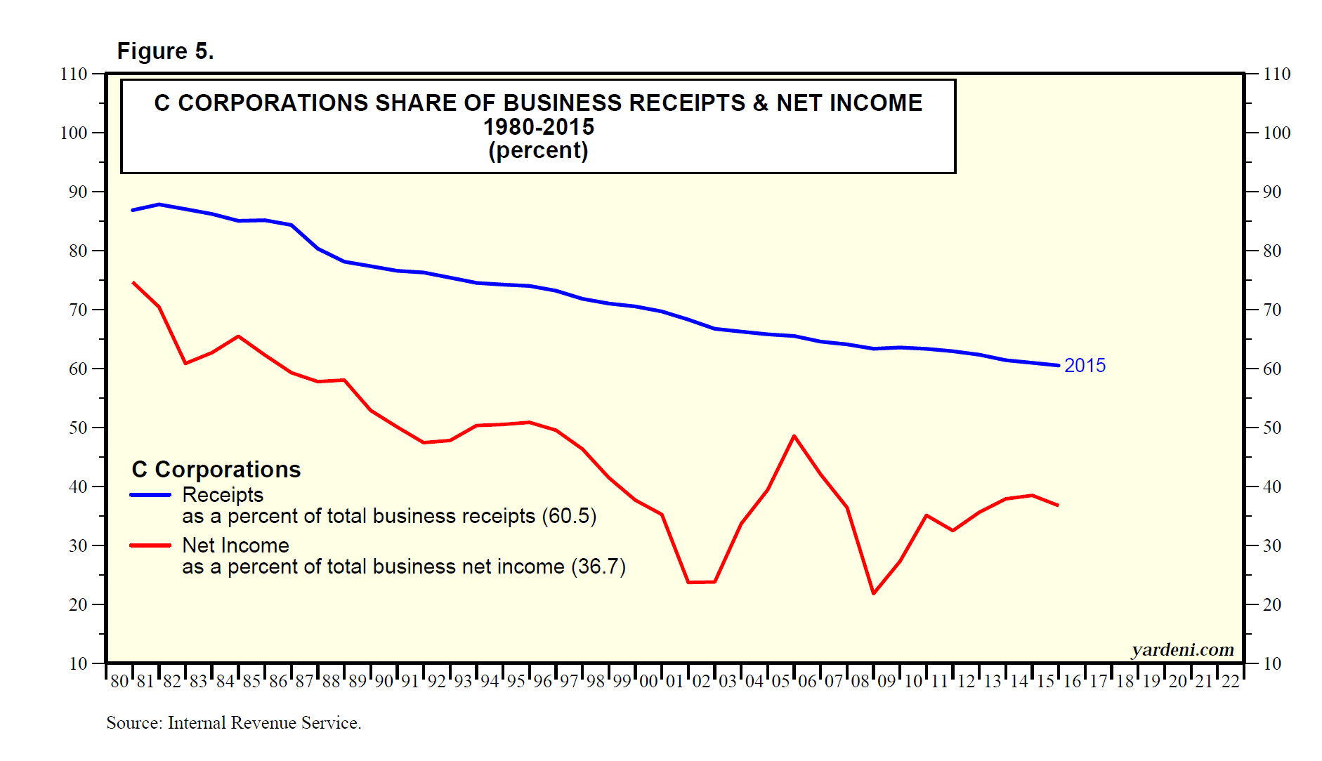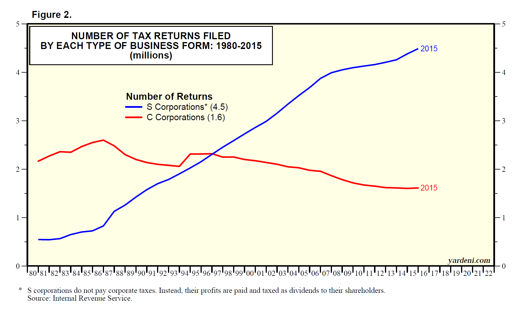 As a result, S corporations have become very popular. From 1980 through 2015, they increased 4.0 million from 0.5 million to 4.5 million, while the number of C corporations declined 0.6 million from 2.2 million to 1.6 million (Fig. 2).