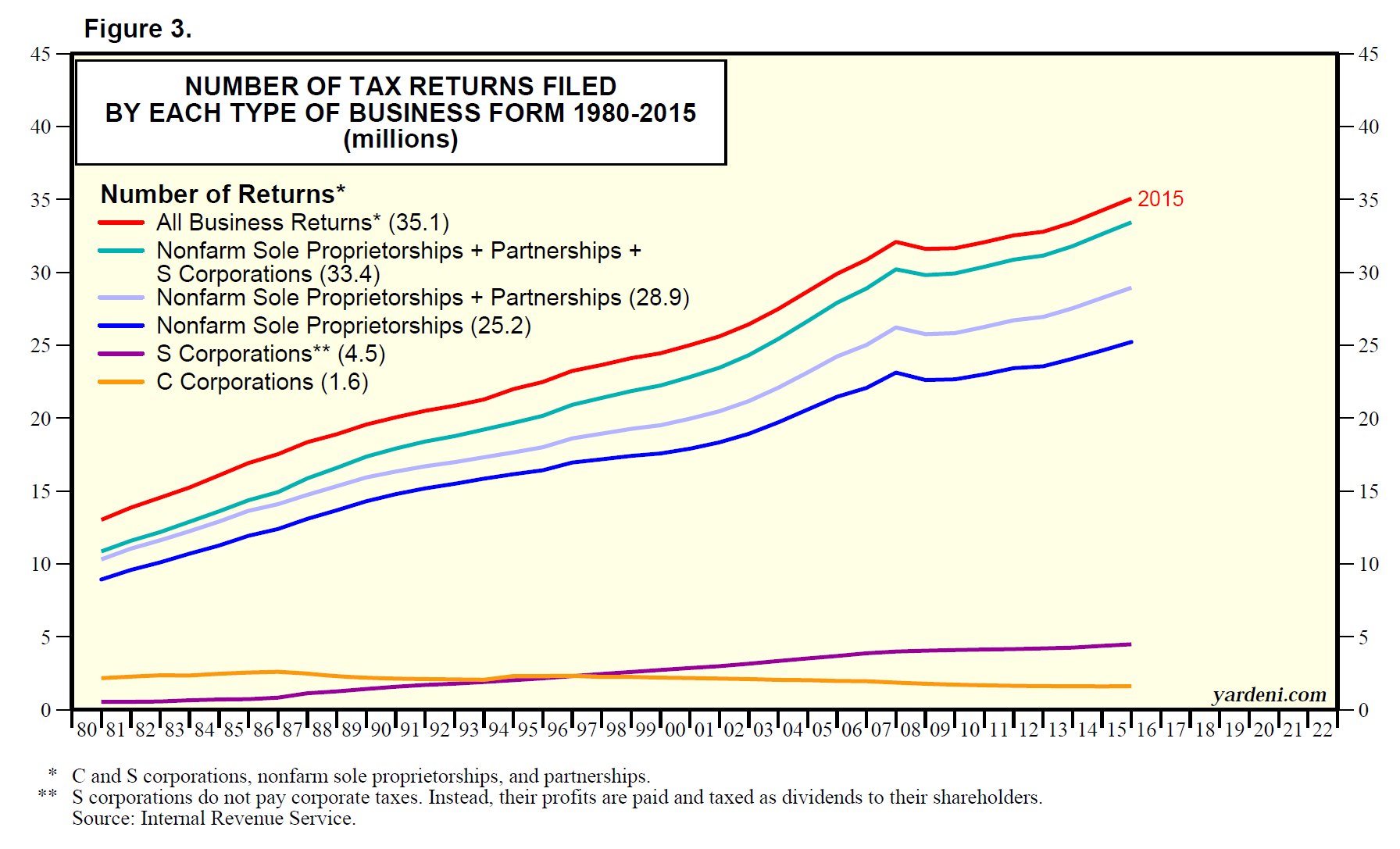 (2) The number of passthroughs. S corporations are categorized as “passthrough” business entities since their profits are passed on to their owners to be taxed once as personal income. Sole proprietorships and partnerships are also taxed as passthroughs. The former has increased significantly by 16.3 million from 8.9 million during 1980 to 25.2 million during 2015 (Fig. 3). Over this same period, the number of partnerships has increased by 2.3 million from 1.4 million to 3.7 million.