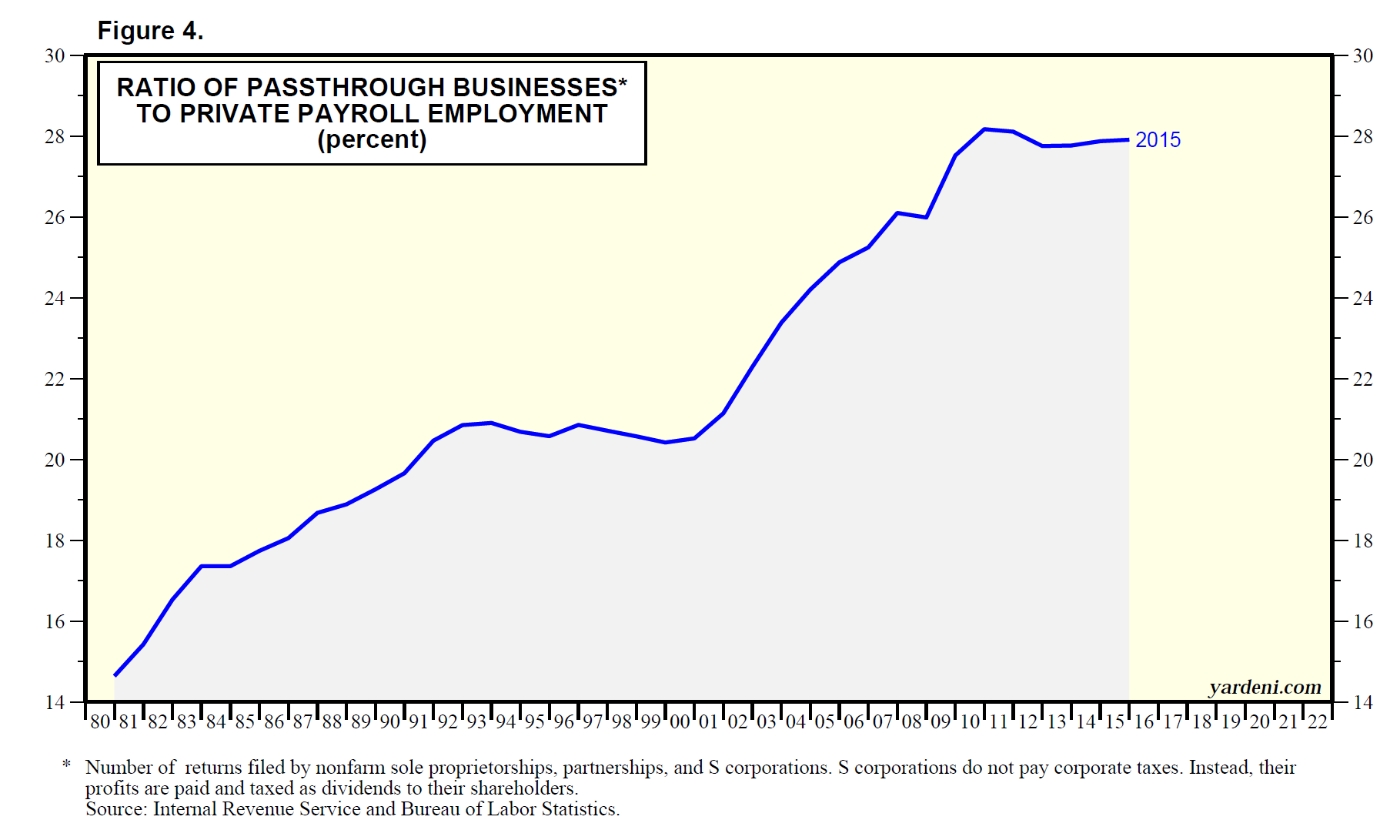 Together, there were 33.4 million passthroughs in 2015, including 25.2 million sole proprietorships, 3.7 million partnerships, and 4.5 million S corporations. Each employed at least one worker, obviously—i.e., their owner. At the beginning of 2015, private payroll employment totaled 118.6 million, implying that passthroughs accounted for at least 28% of those jobs (Fig. 4). That’s significant and impressive!