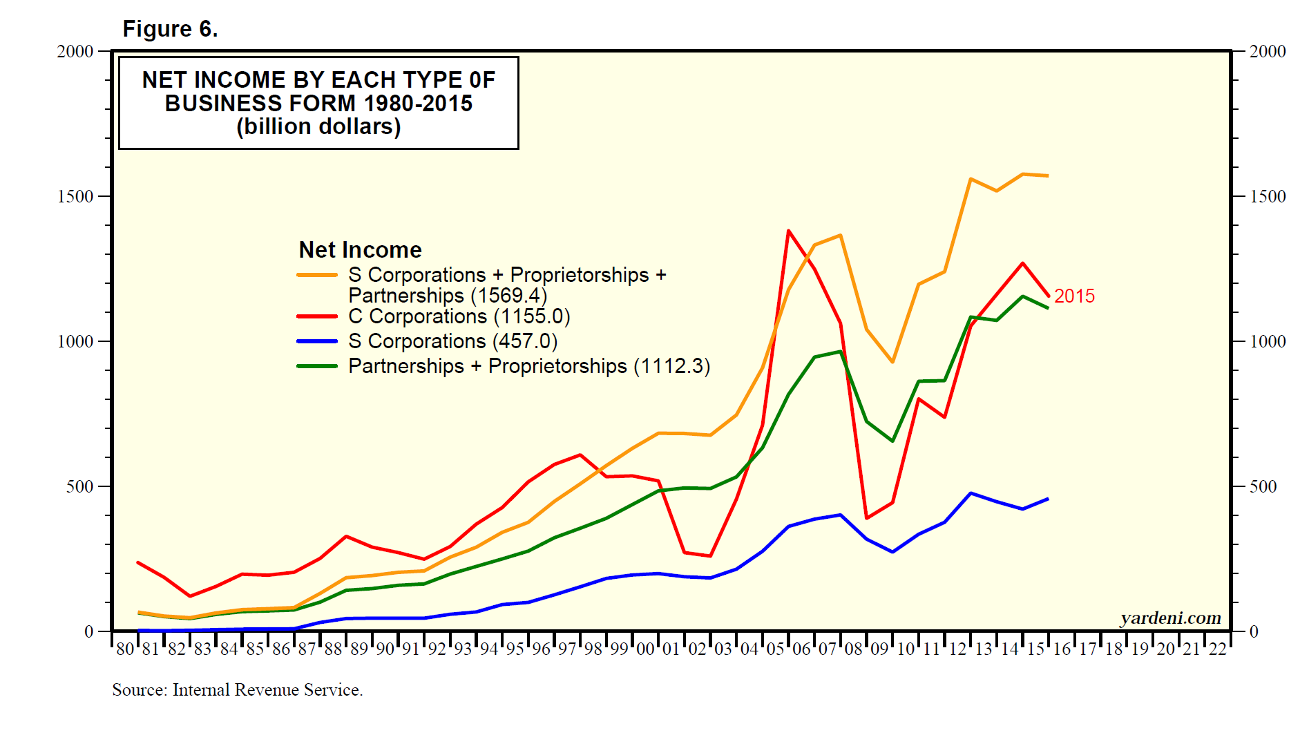 (3) Impact on National Income. The IRS data show that, in 1980, C corporations accounted for a whopping 86.8% of business sales receipts and 74.6% of the net income of all businesses (Fig. 5). By 2015, these percentage shares were down to 60.5% and 36.7%. In 2015, these were the net income results for C corporations ($1,155 billion), S corporations ($457 billion), and sole proprietorships and partnerships ($1,112 billion) (Fig. 6).