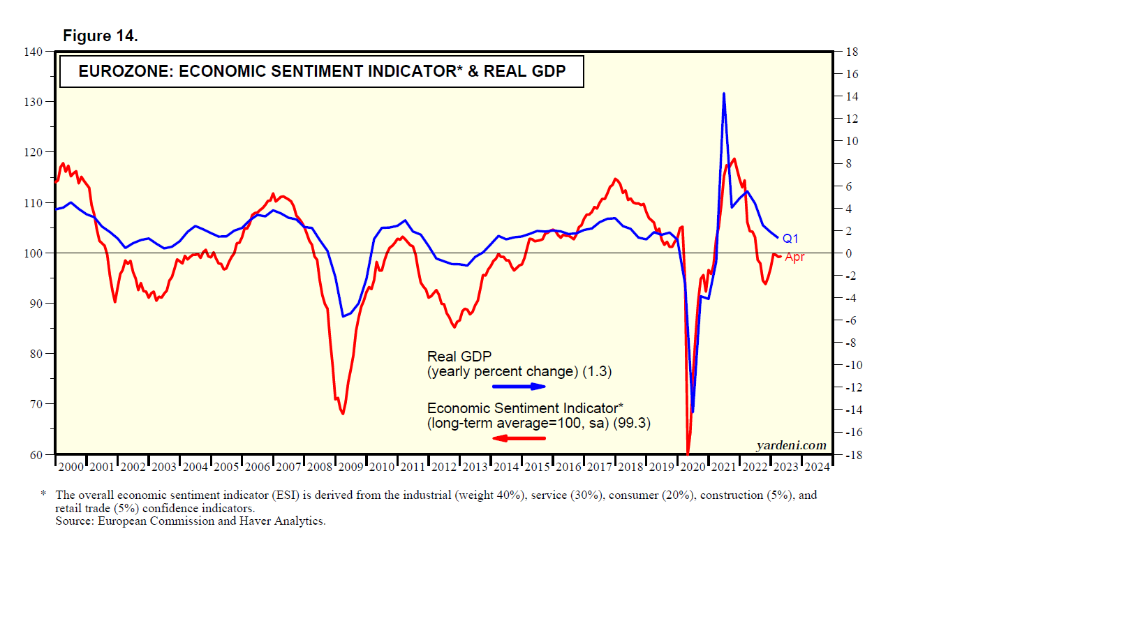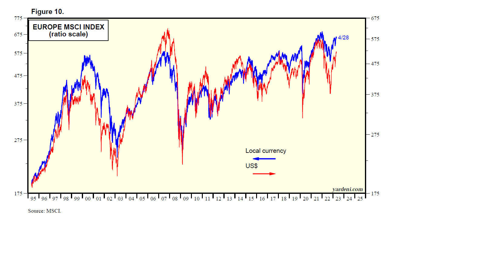 (10) Leading indicators are mostly misleading. What about all those leading indicators that have been signaling an impending recession since last year? We’ve often explained why they are misleading. For example, inverted yield curves in the past have anticipated that the Fed’s tightening would break something in the financial system, causing a credit crunch and a recession, that’s not always the case. There was a mini-banking crisis in March of this year. But it was contained by the Fed so had few systemic ripple effects.
