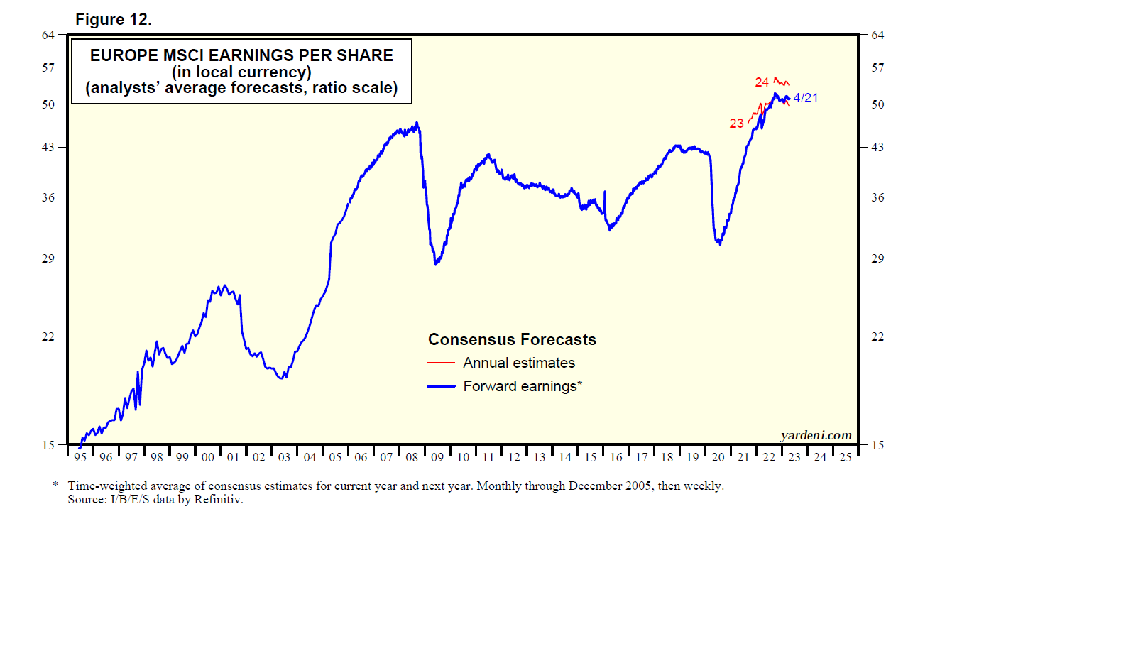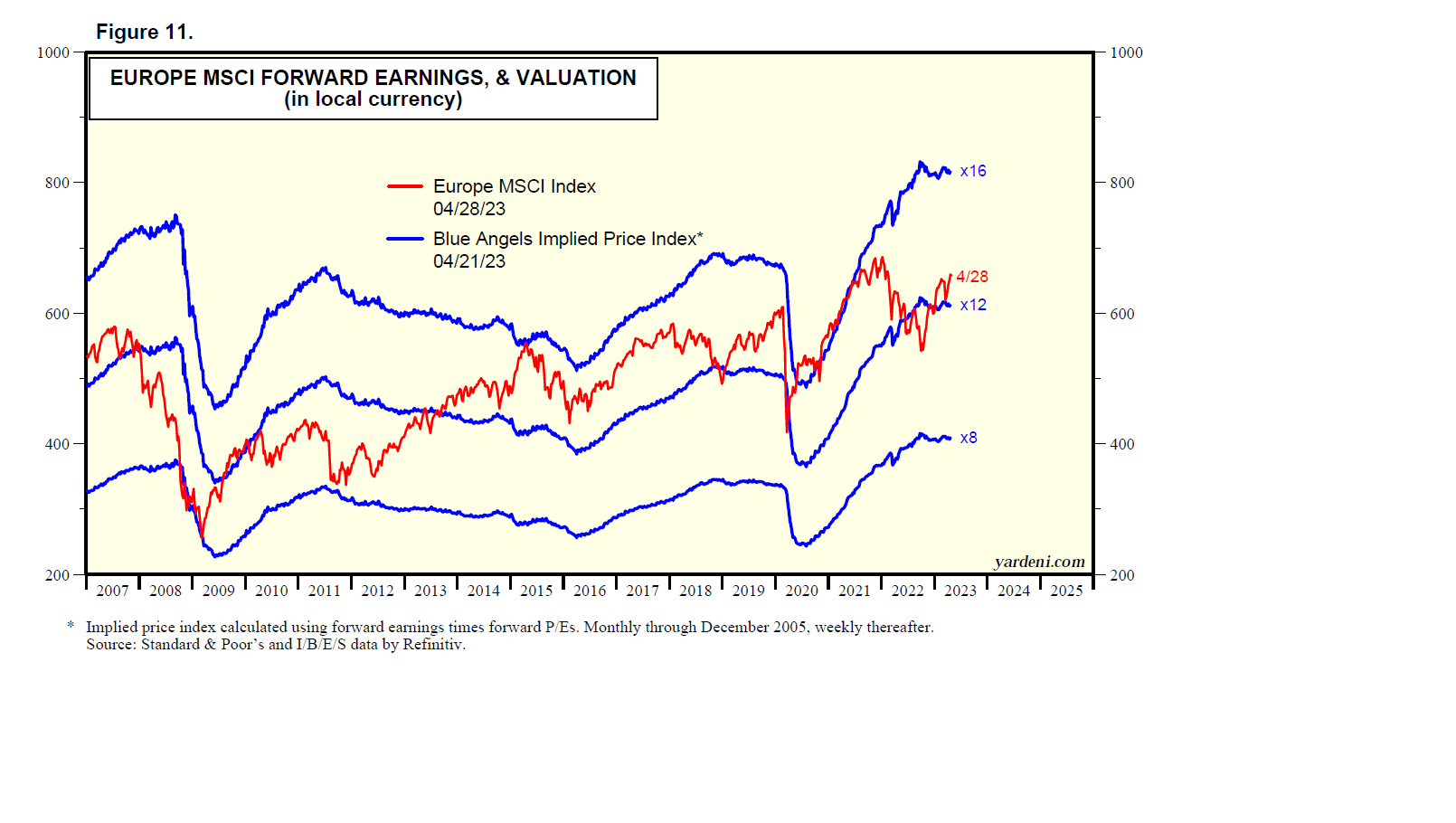Like the economy, revenues and earnings have been experiencing a soft landing so far, and industry analysts as a group have not been slashing their forecasts. Currently, the analysts’ consensus estimates imply the following y/y revenues and earnings growth rates: for 2023 (2.1%, 0.7%), for 2024 (4.9%,11.2%), and for 2025 (5.4%, 12.4%) (Fig. 9 and Fig. 10).