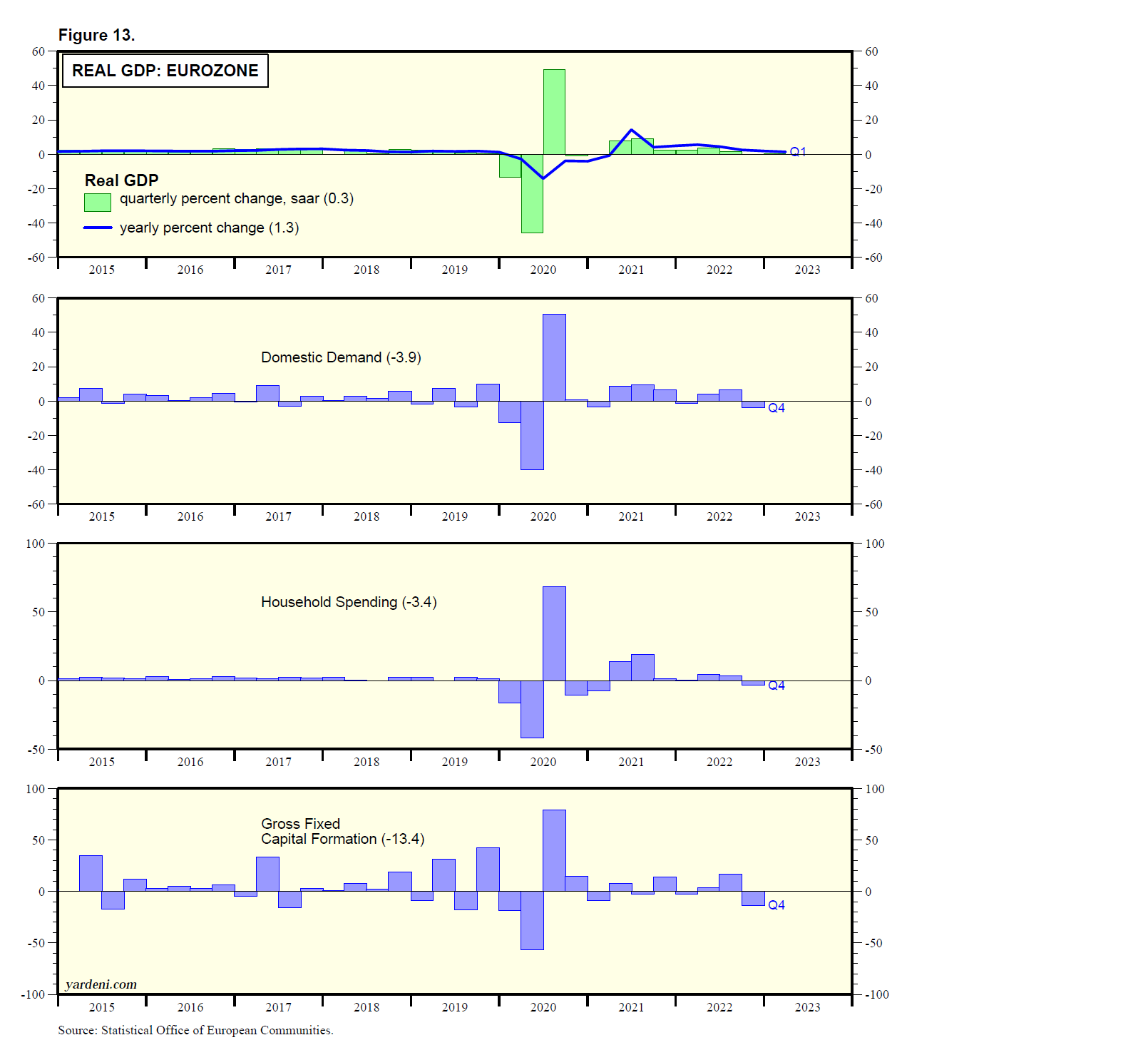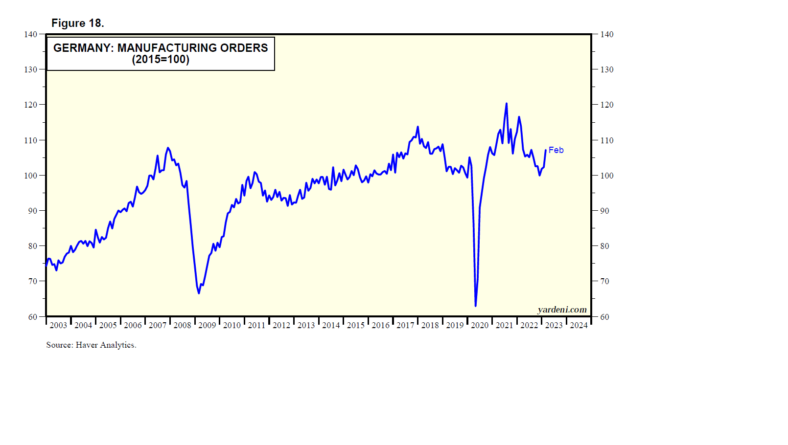 US Economy: Not Landing. Meanwhile, the US economy is continuing to grow at a solid “no-landing” pace. The Atlanta Fed’s GDPNow tracking model shows real GDP increasing 3.2% (saar) during Q1-2023 as of March 24. Most impressive is that real personal consumption expenditures is tracking at a 5.0% annual rate! It was last revised higher on March 15 after the release of retail sales, which dipped 0.4% during February, though January’s gain was revised up from 3.0% to 3.2%, the biggest monthly gain since March 2021.