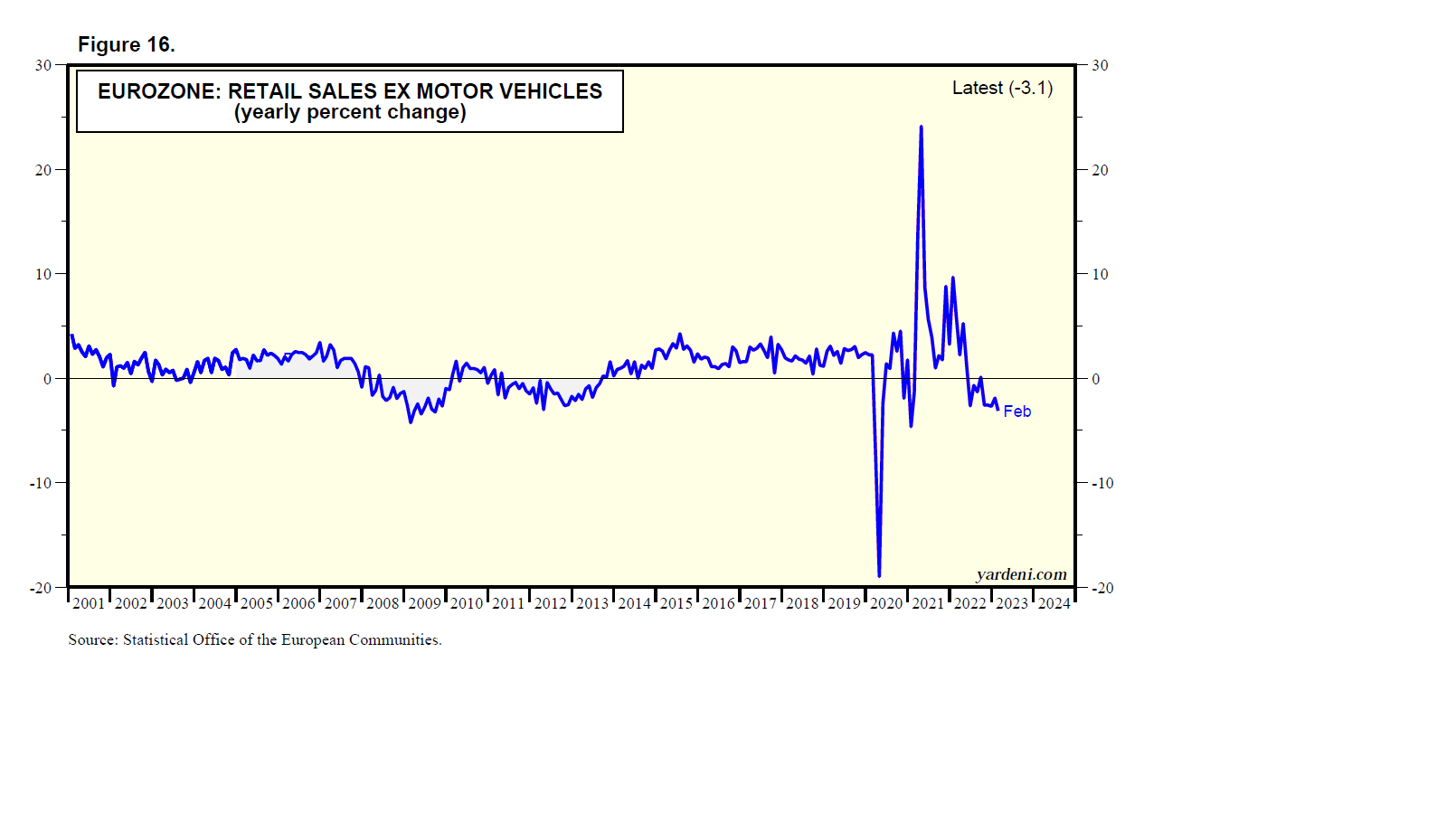 During the March 16 week, S&P 500 forward revenues rose to another record high (Fig. 17). The forward profit margin dropped to 12.3%, down from a record high of 13.4% during the June 9 week of 2022.