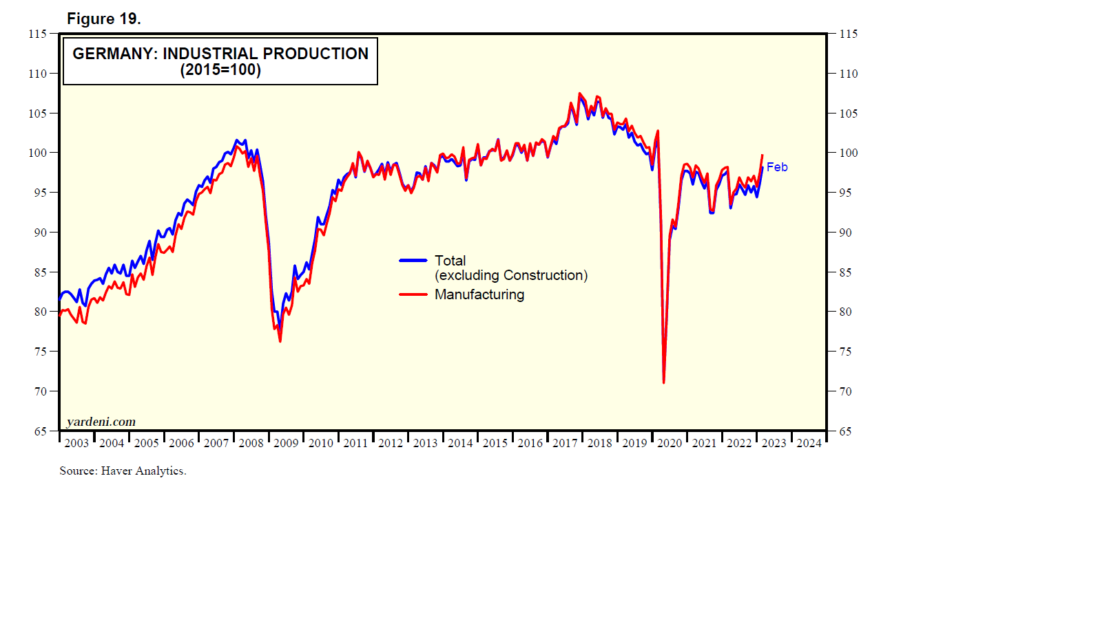 (2) Flash PMIs. The S&P Global flash estimate for the M-PMI in the US rose from a recent low of 46.2 during December to 49.3 in March (Fig. 9). The flash estimate for the NM-PMI rose from 44.7 to 53.8 over the same period (Fig. 10).
